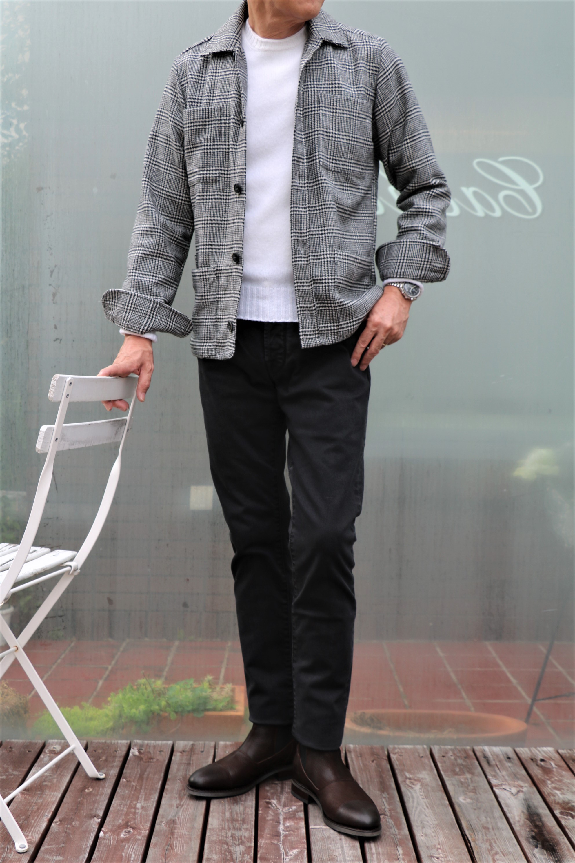こちらは、やや厚手のウール混シャツアウターです。厚手と言っても、あくまでもシャツ地。ウール地のシャツをイメージしてください。合わせたニットはDrumohr(ドルモア)、ボトムはJACOB COHEN(ヤコブ コーエン)、靴はParaboot(パラブーツ)です。