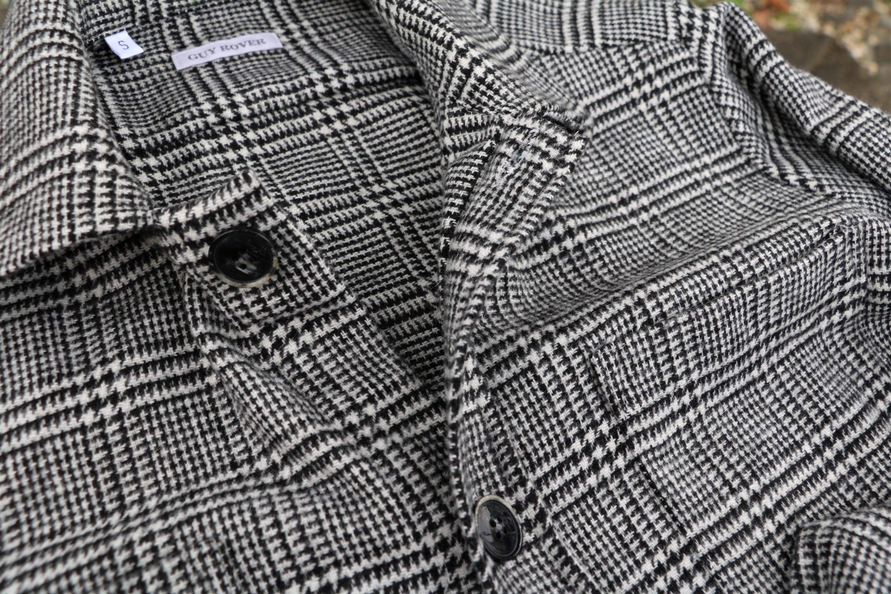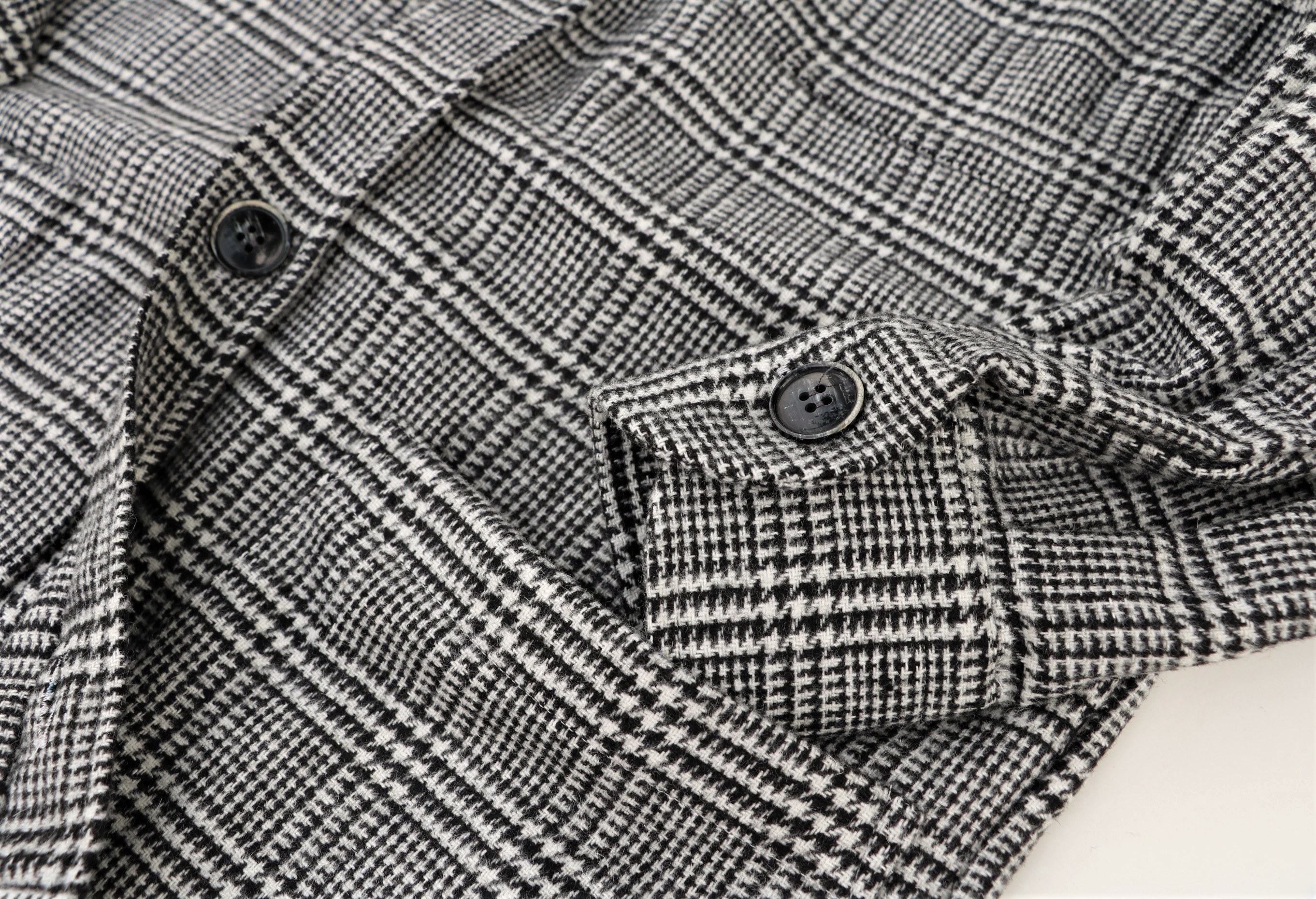 モノクロのグレンチェック柄で、さりげなく英国気分(上の写真の方が実物に近くなります)。フロントのポケットは、両胸と両腰に2つずつ、計4つ付きますが、柄行によって強調されることはありません。忘れておりましたが、右の腰ポケットの内側にペンポケットが付きます。