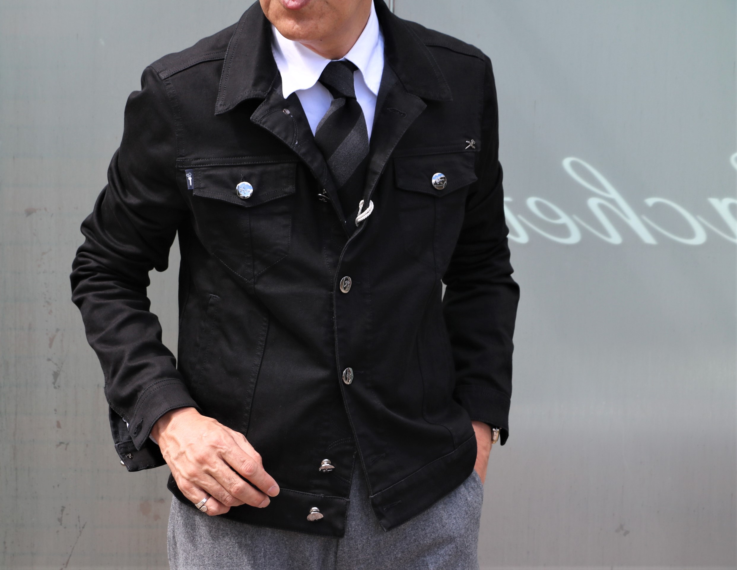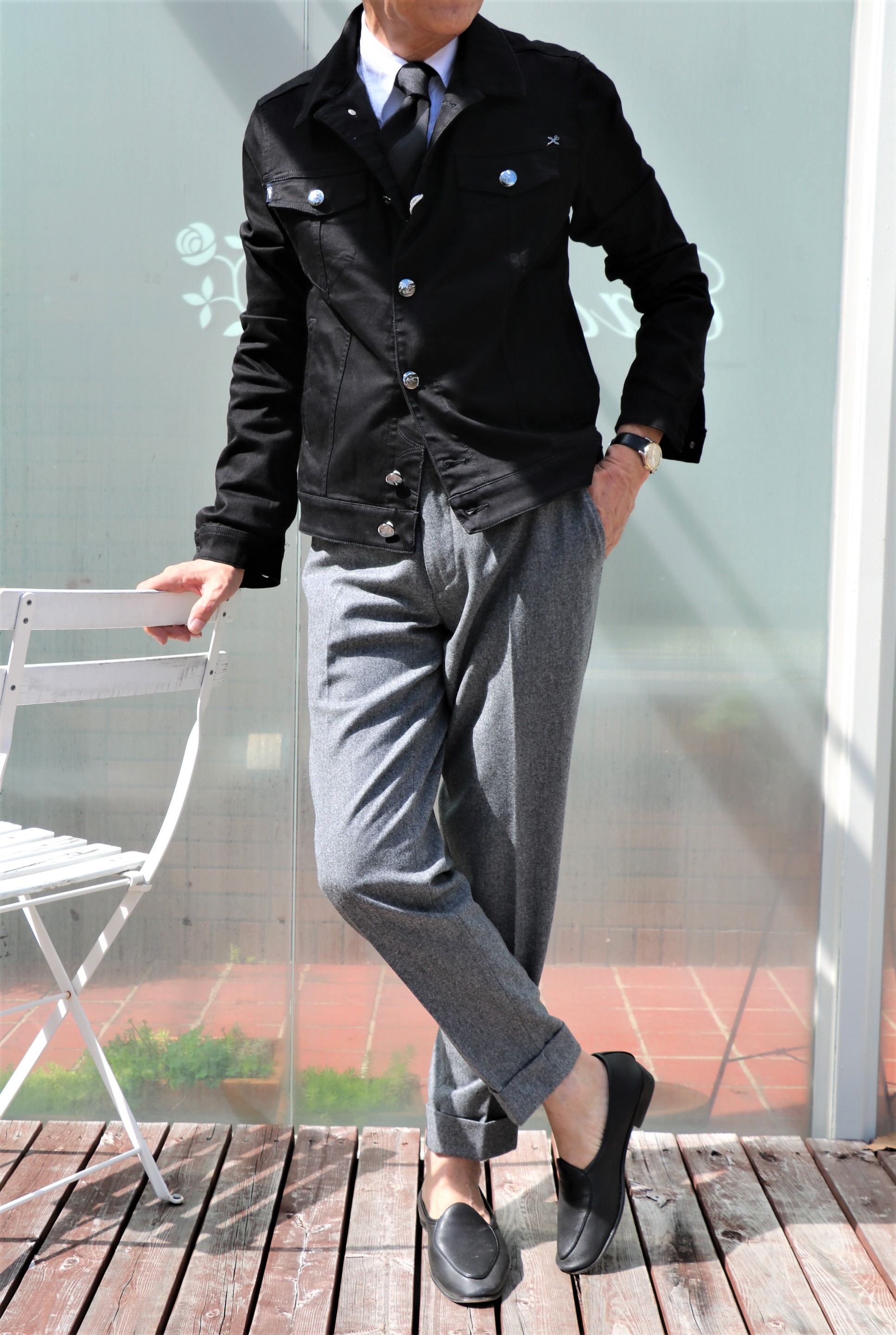 白のドレスシャツ(私物のバグッタ)にグレイフランネルのパンツ(Borelio/ボレリオ)を穿き、タイ(Holliday&Brown/ホリディアンドブラウン)を結んで、気取ったブラックのデニムジャケットスタイル。