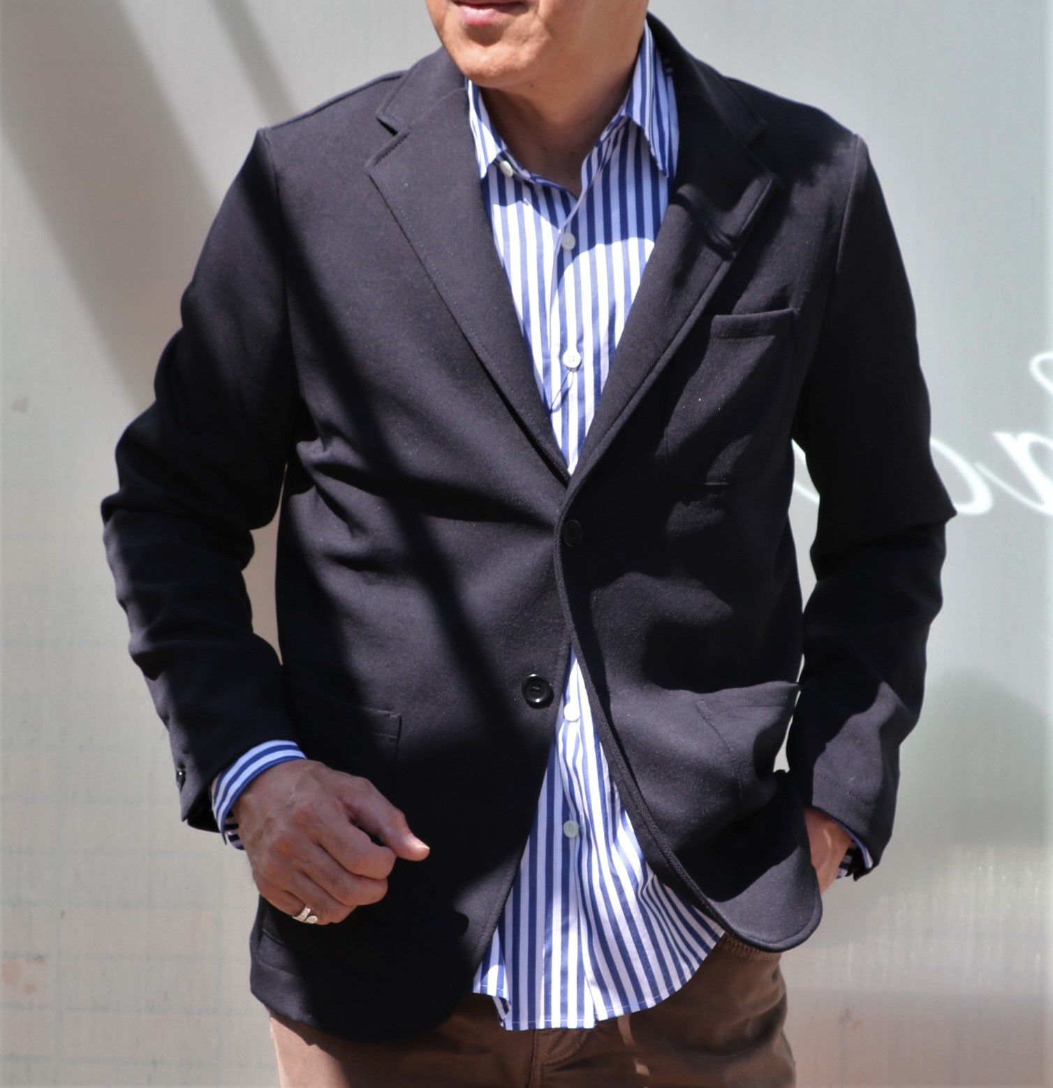 お勧めしたいのは、【GUY ROVER/ギ・ローバー】のジャケット。コットンの鹿の子織りだから、気楽さ、着心地とも最適です。なんといっても身幅の割に着丈が短いから、ラフな印象になります。
