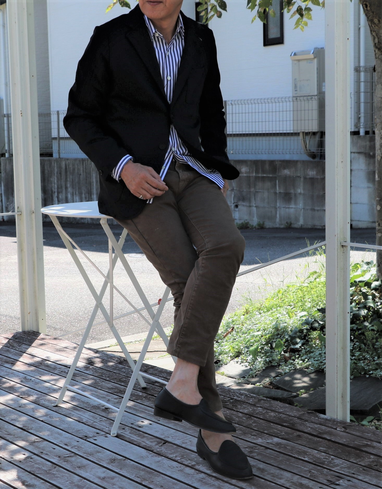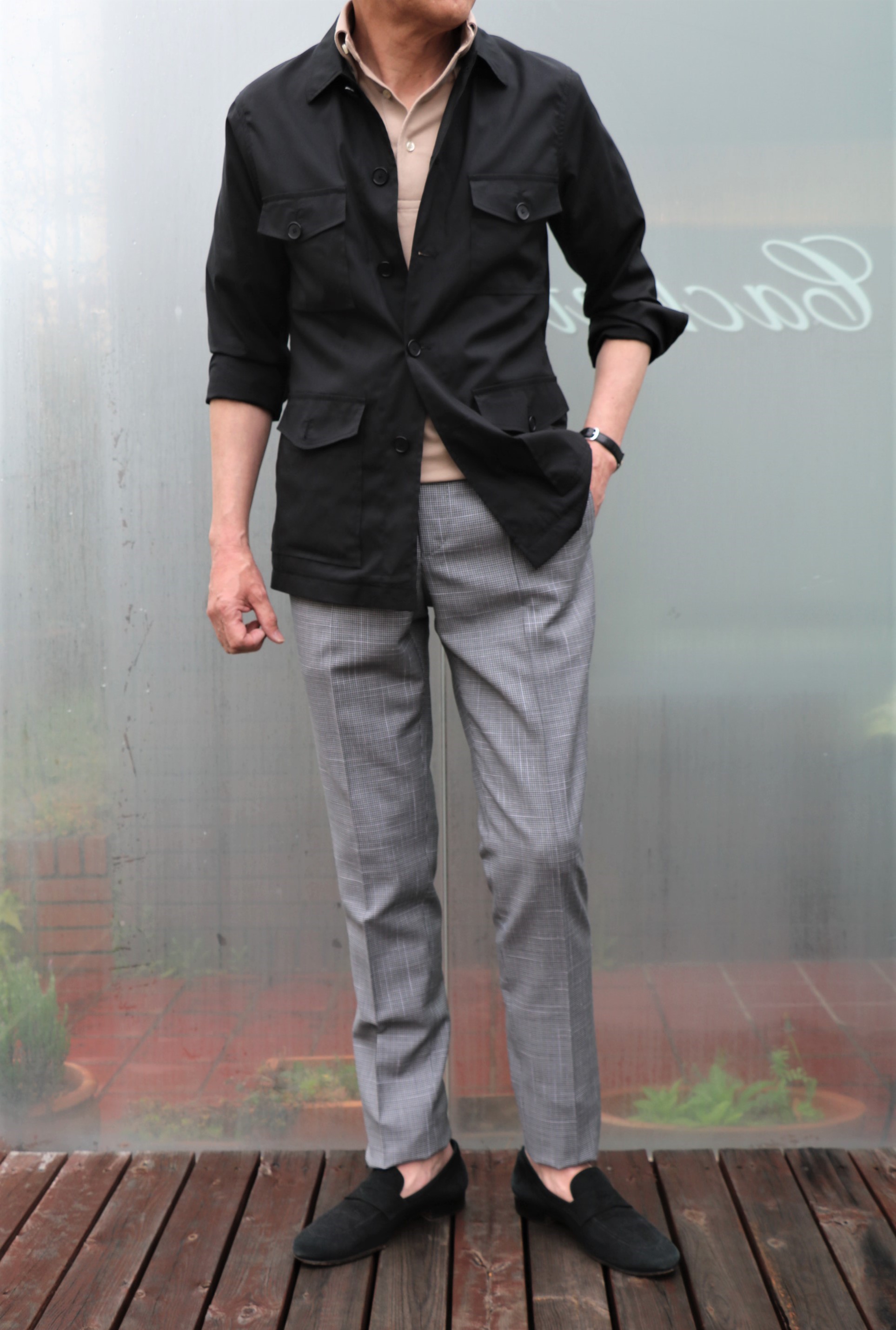半袖のTシャツの上からと、今すぐ活躍する鹿の子織ジャケット。生地も薄く、秋冬物として扱うより、オールシーズン用として、気楽に羽織ってください。合わせたシャツは、カシェートで展開しているTradithonal Weatherwear/トラディショナルウェザーウェアのロンドンストライプ柄シャツを。下半身は、全て私物です。
