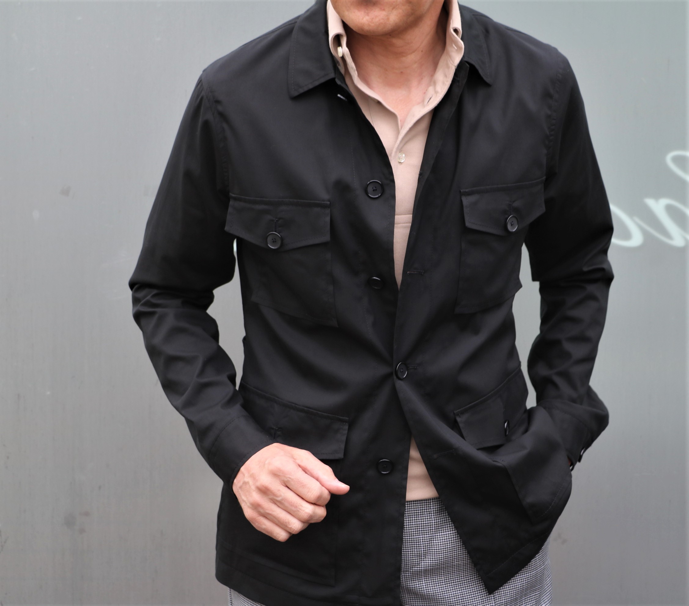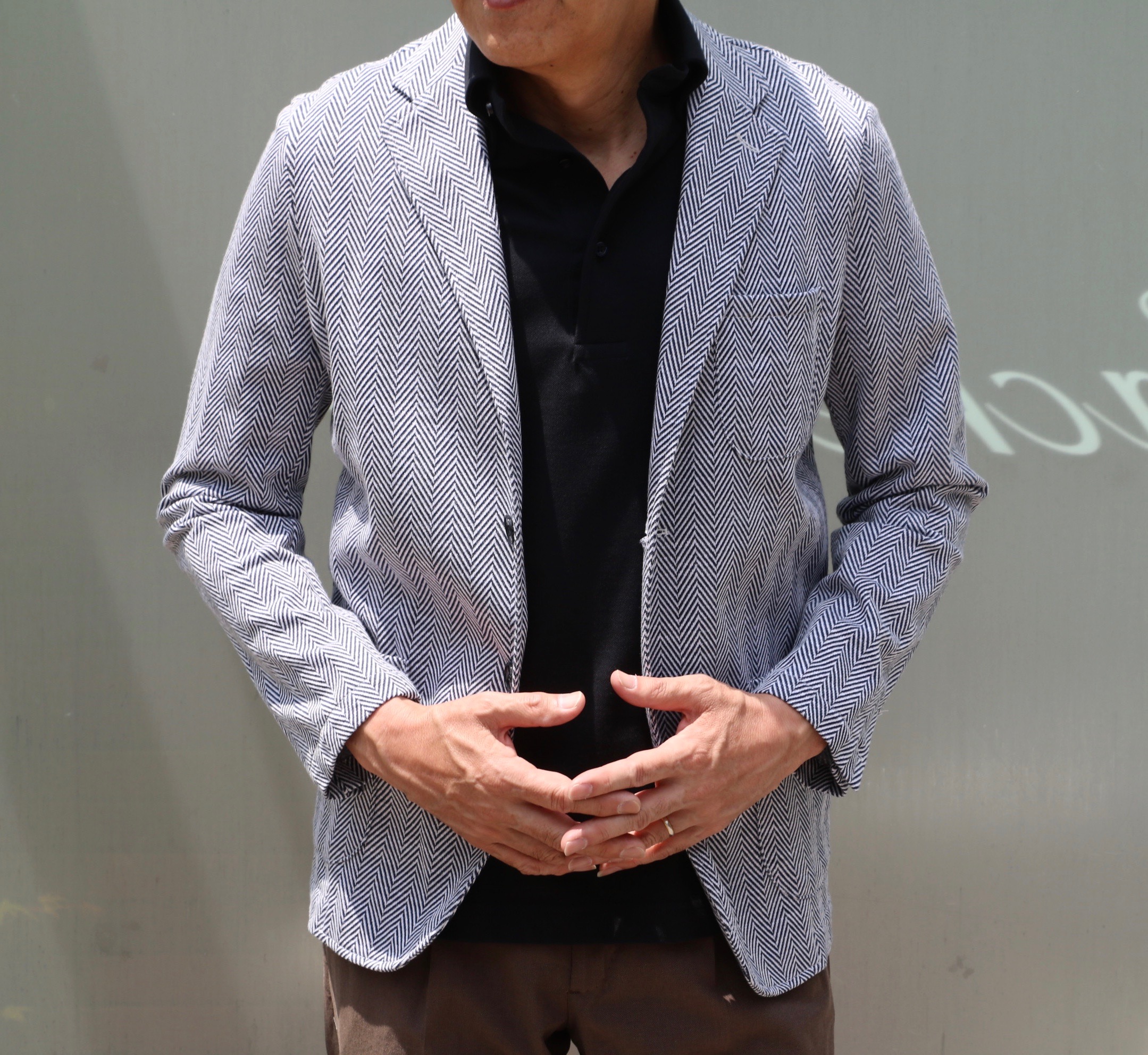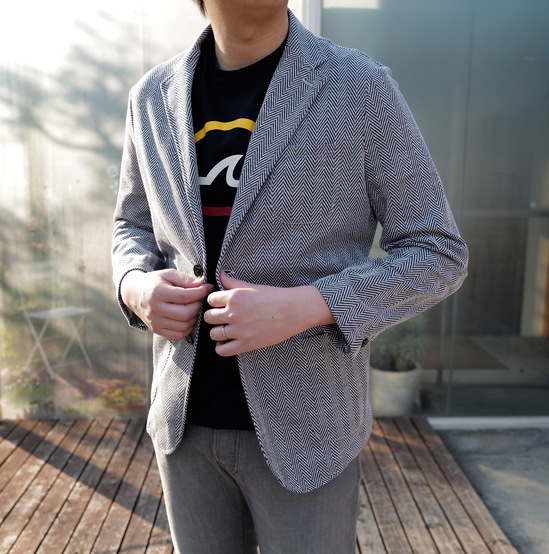 そして定番生地ではありませんが、ヘリンボーン柄2釦シャツジャケットもお勧めです。サイズSを羽織ってみましたが、コンパクト。この方はどうでしょう。