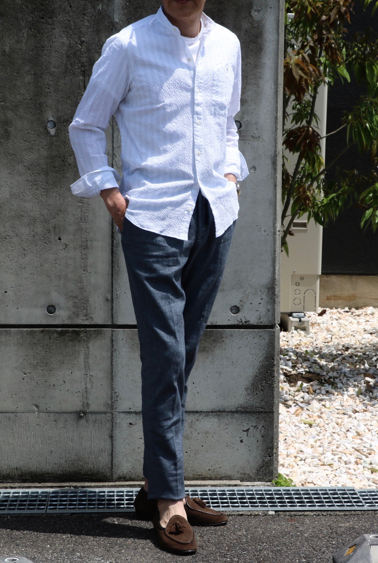 INCOTEX(インコテックス)のコットン・リネン ドローコード付きシャーリングパンツを穿いて、合わせたシャツは【GUY ROVER/ギ...ローバー】。たぶんシャツブランドの中では最も長い付き合いになるでしょうか。ブランド名に「GUY」が付くだけに親しみもあります。今回は、鹿の子のボタンダウンシャツの他にシアサッカーのスタンドカラーをご用意しました。