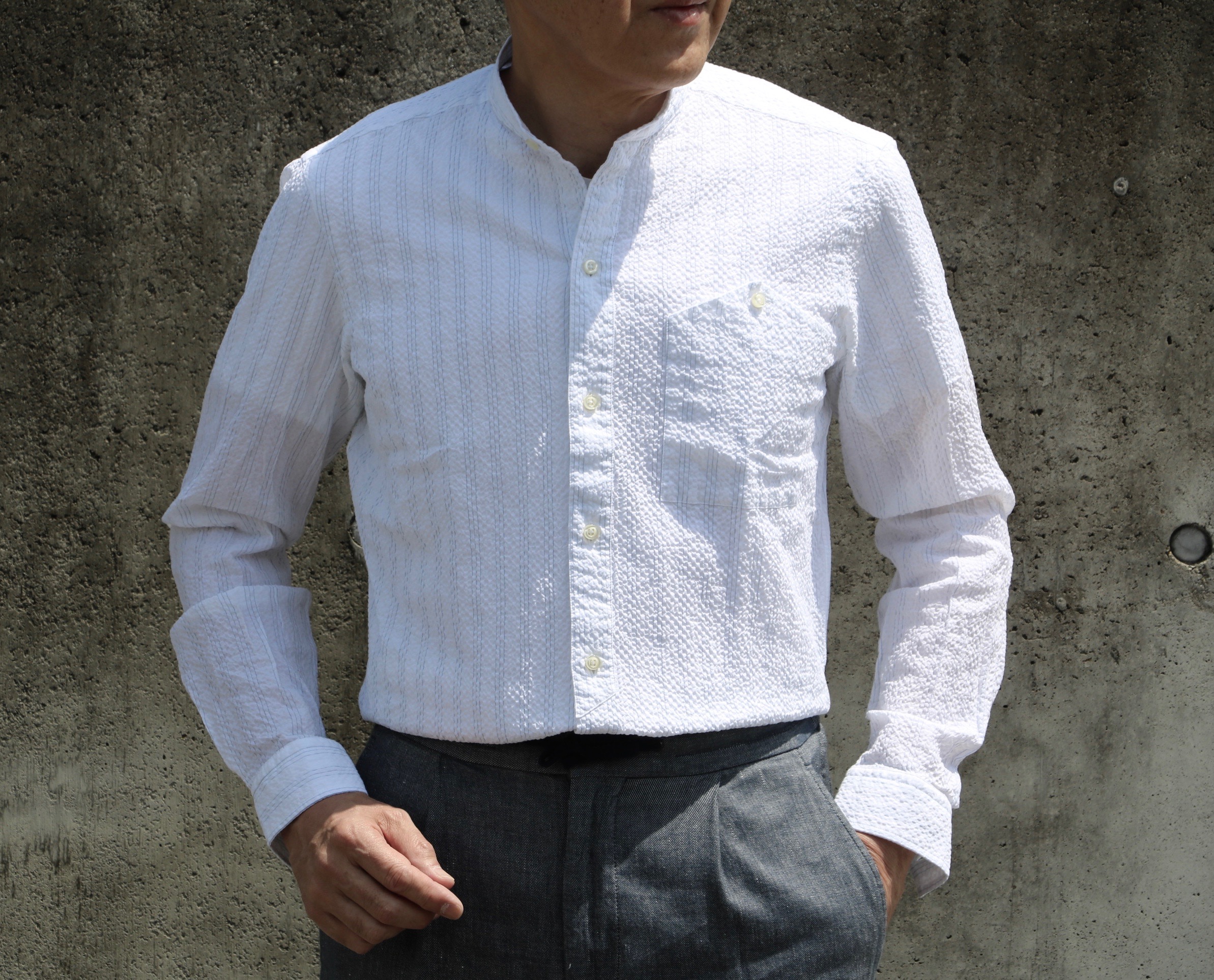 MODEL:シアサッカーストライプ柄スタンドカラーシャツ