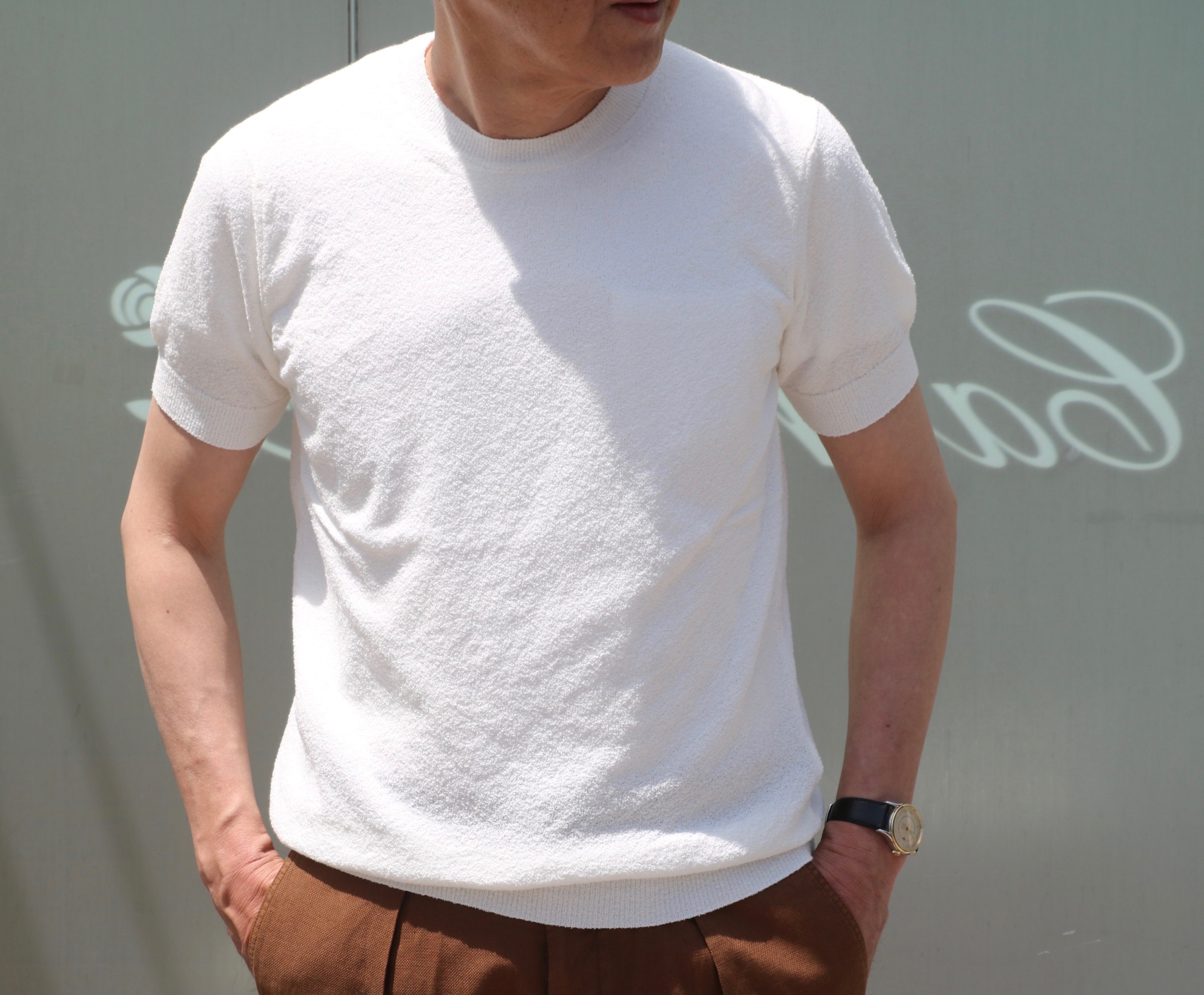 本日、もう1ブランド、ご紹介しましょう。ギ・ローバーのブラックジャケットに合わせていたのが、【INCOTEX/インコテックス】のICE COTTON。カットソー同様、夏の風物詩素材です。このブラウンは、かつて展開していた色ですが、今季、ご用意させていただいたのは、