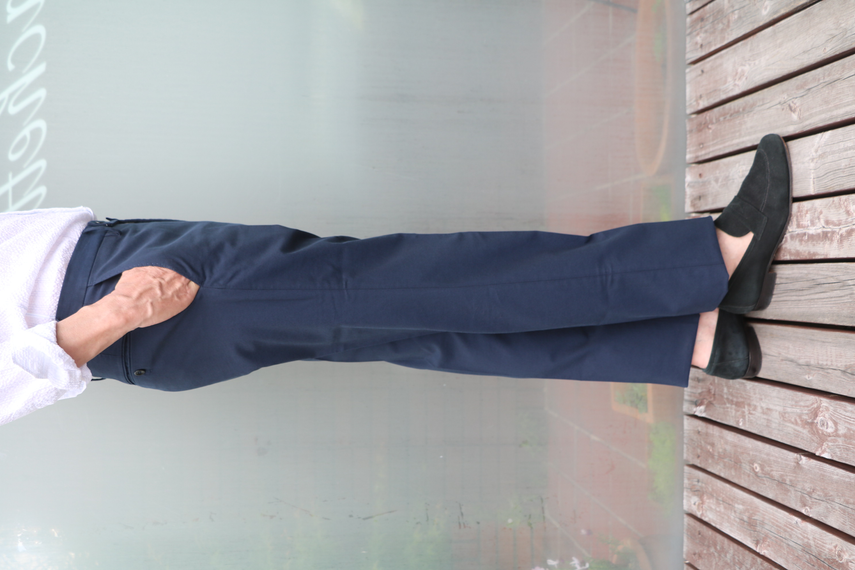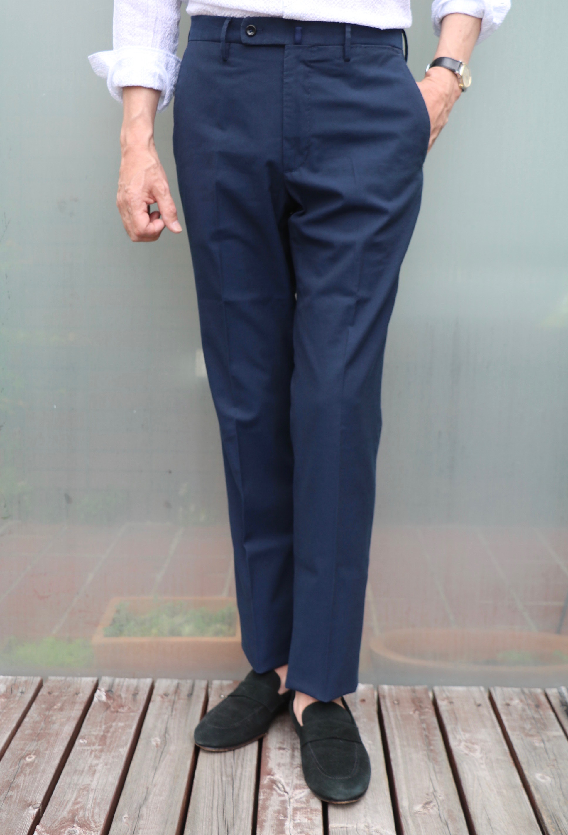 パンツをデニムから、何故かサイズ46のみが2本となっているINCOTEX(インコテックス)のICE COTTONストレッチパンツに穿き替えてみました。私の身長(175㎝)でサイズSを着ていますが、こんな感じです。