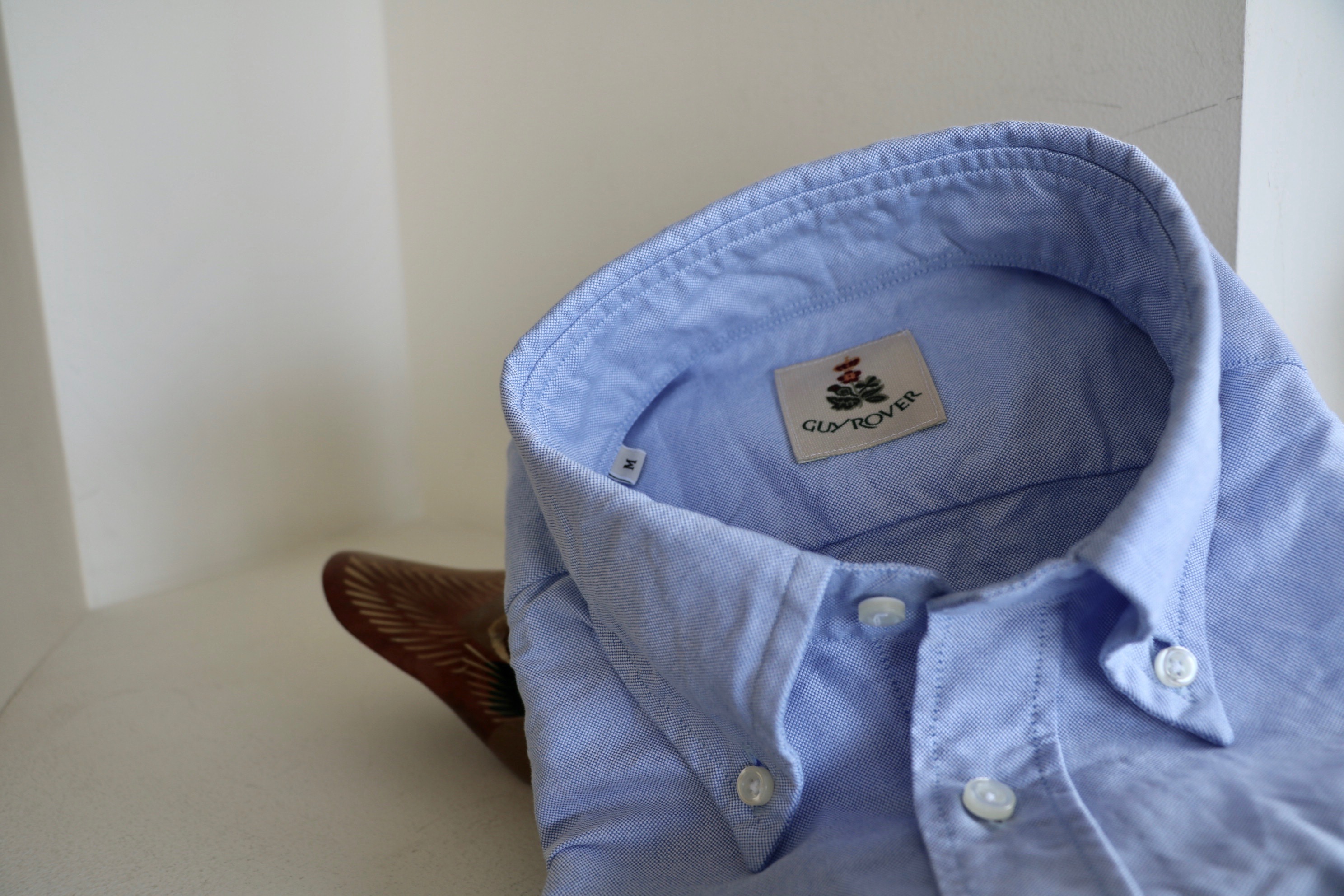 同じオックスフォードに洗いをかけた無地もご用意。De Petrilo(デ・ペトリロ)のコーデュロイスーツに合わせたのは、サックスブルーです。
