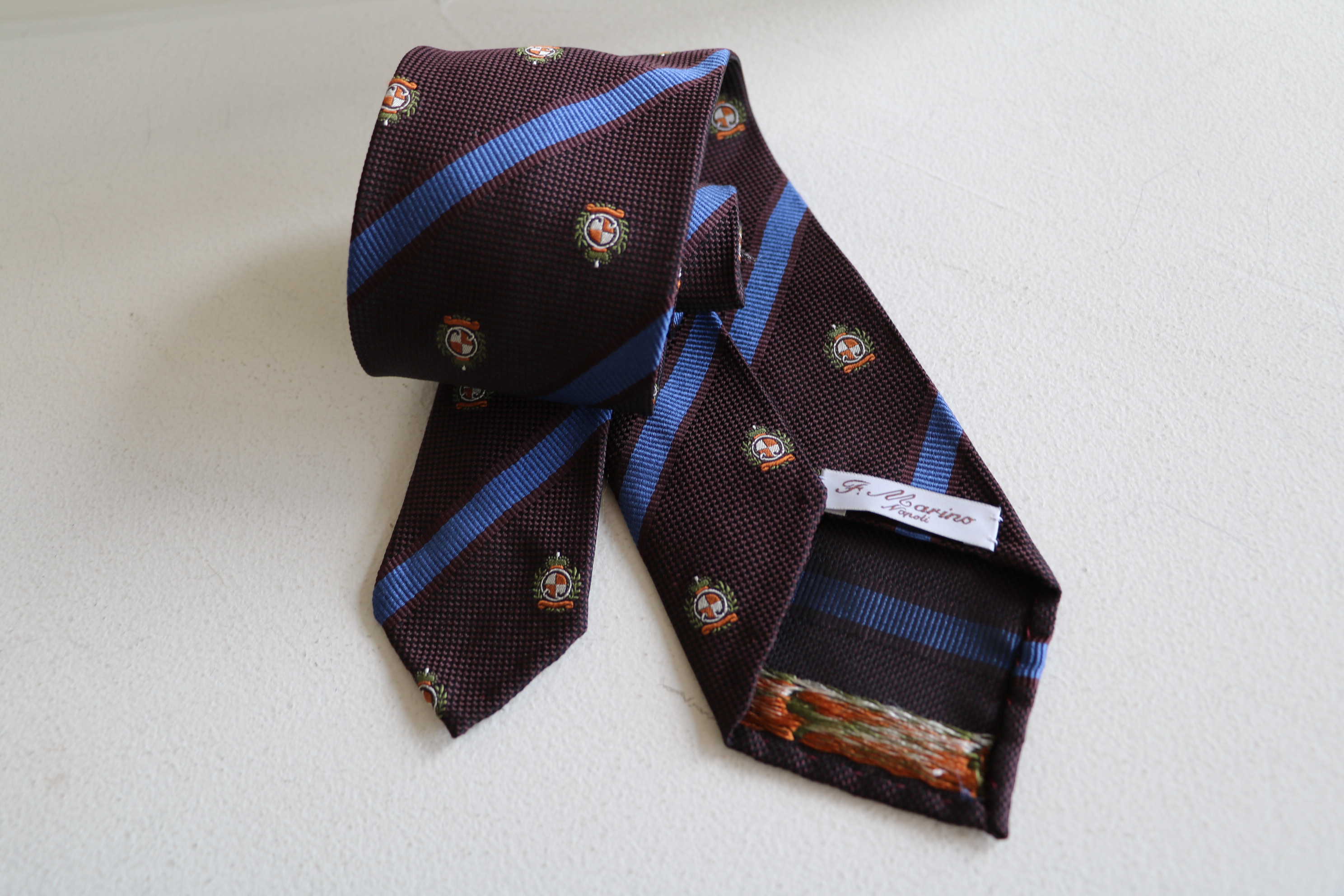 【F.Marino/フランチェスコ・マリーノ】。ナポリ近郊のネクタイと刺繍の名産地「サンジョルジオ・ア・クレマーノ」にて、その伝統文化を一身に担う男「フランチェスコ・マリーノ」の冠したネクタイブランドです。イタリアでは「カサンドラ」の名で知られ、その仕事の大半が今なお手縫いで行われる、創業1928年の老舗ネクタイ工房。しっくり収まり、且つ緩まない結び目、また長年の使用にもねじれることのない耐久性の高さが魅力です。
