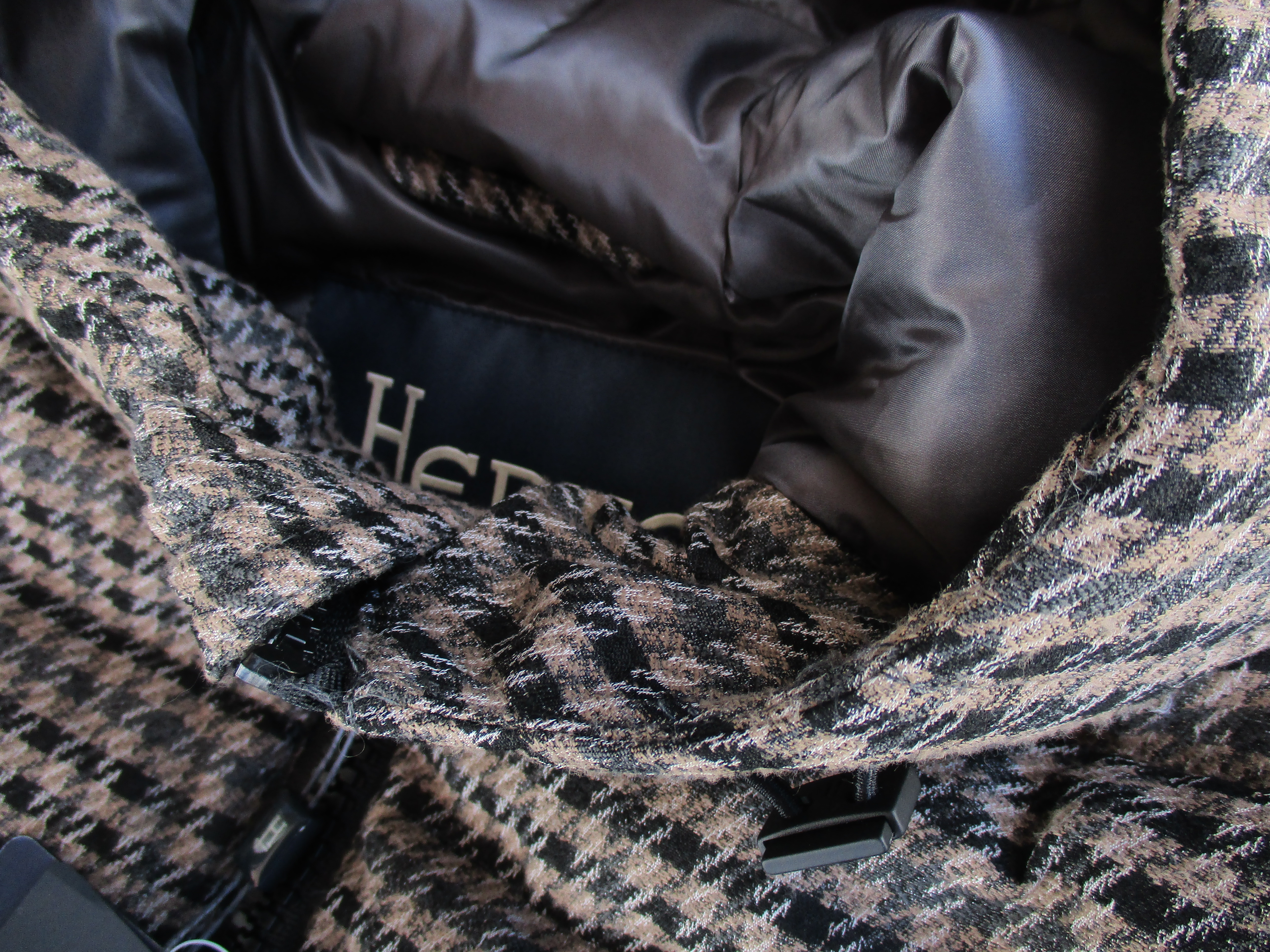 さり気なく付いたのは、取り外し付きのビーバーファー。マフラー要らずの温かさです。付く事で襟元の汚れも気になりません。くどいようですが、襟裏のロゴ。昨年、あるホテルのバーで、クロークルームを覗いたら、このロゴのコートが大半。レディースが多かったのですが、まさかヘルノジャパンの皆さんの二次会?なんて、思うほどでした。