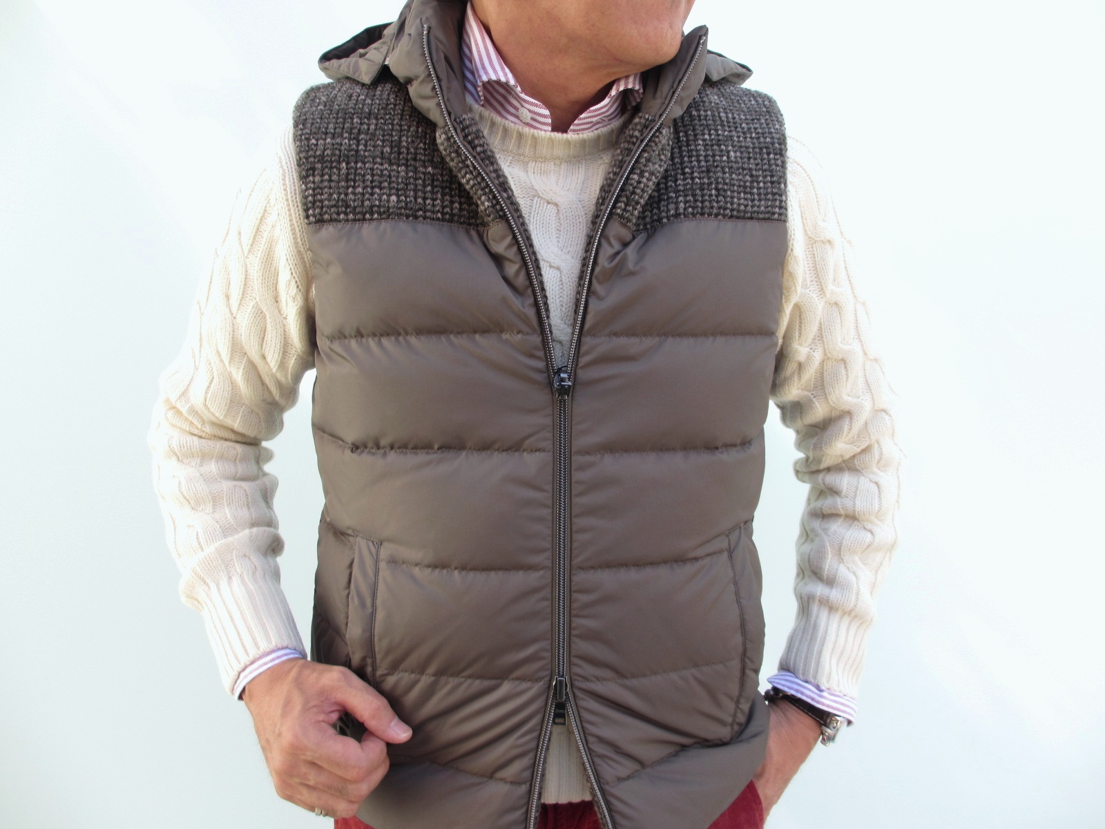 表情豊かなダウンベストは、フード取り外し可能なナイロンとニットとのコンビ。更にリバーシブル仕様で、二つの顔を持つAB型モデルです。