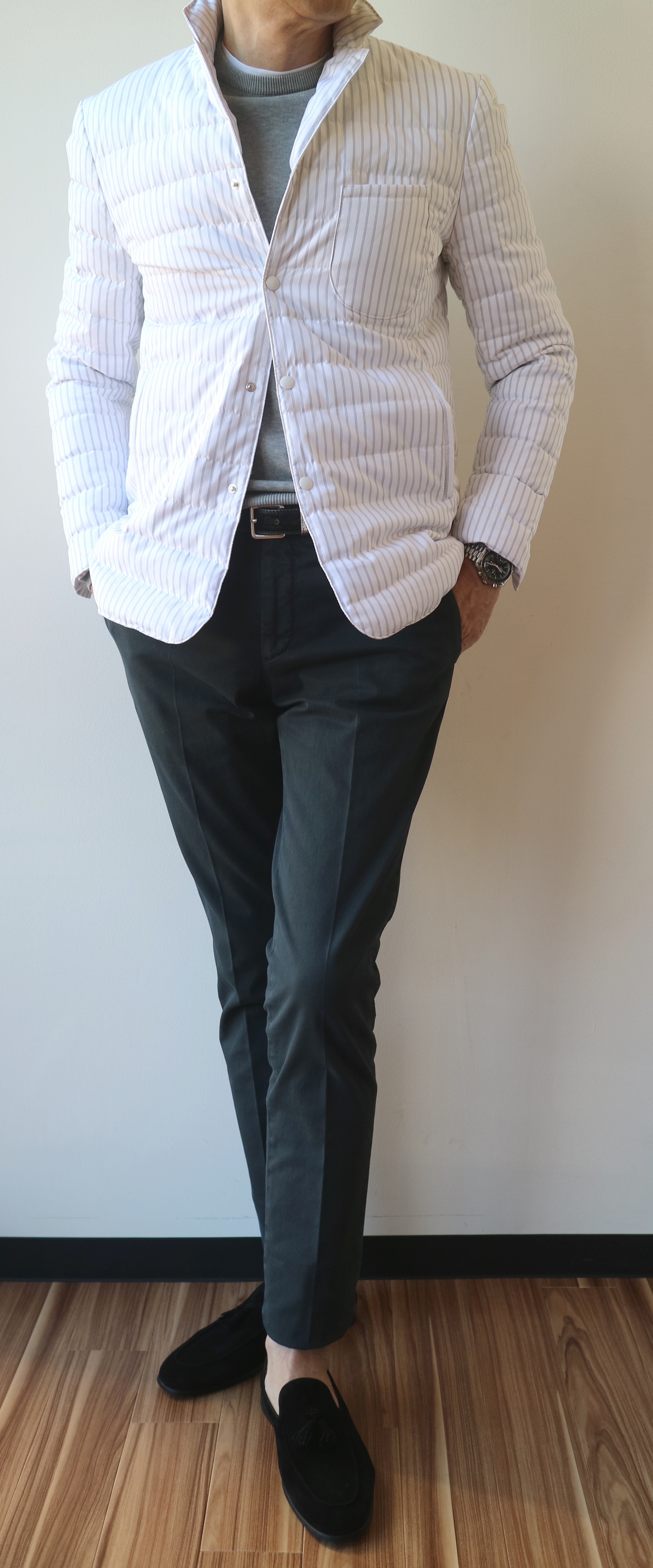 同じく、ヘルノのトレンチ風ショートコートに合わせていたパンツも【INCOTEX/インコテックス】です。写真右は、EMMETI/エンメティのライトダウンシャツジャケットに合わせてみました。見て、お分かりかと思いますが、左はサイズ44をタイトに、右はサイズ46をゆとりを持って穿いています。穿くサイズによって、若干見え方が変わります。参考までに。