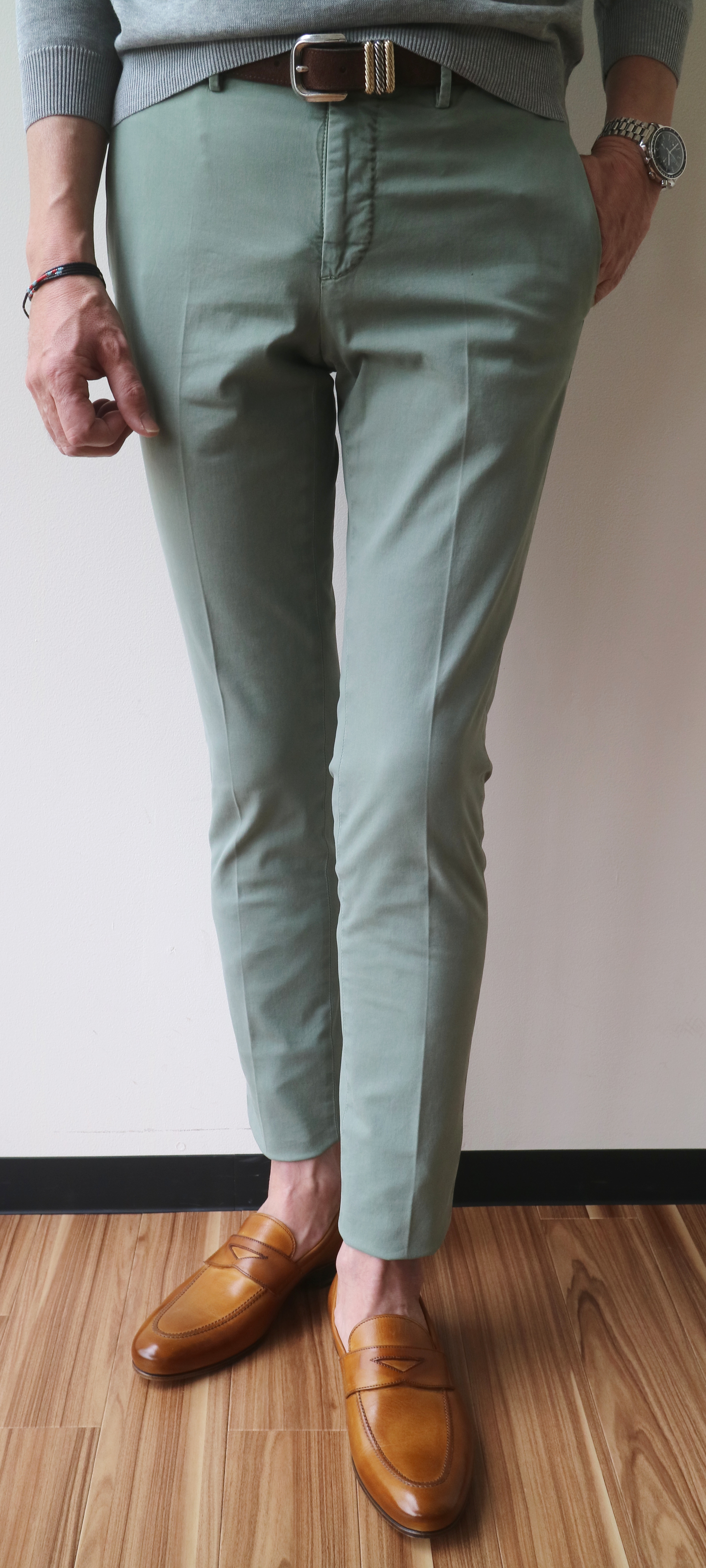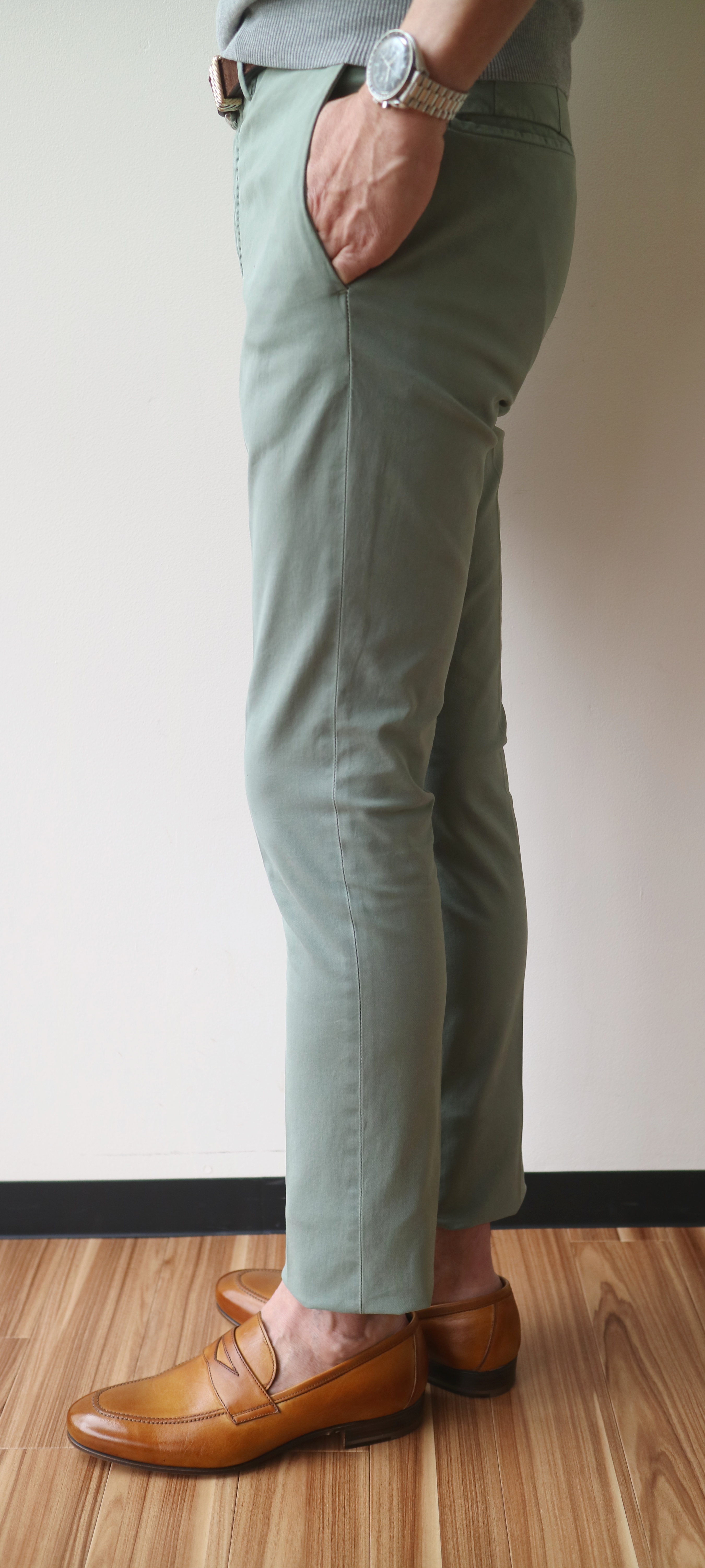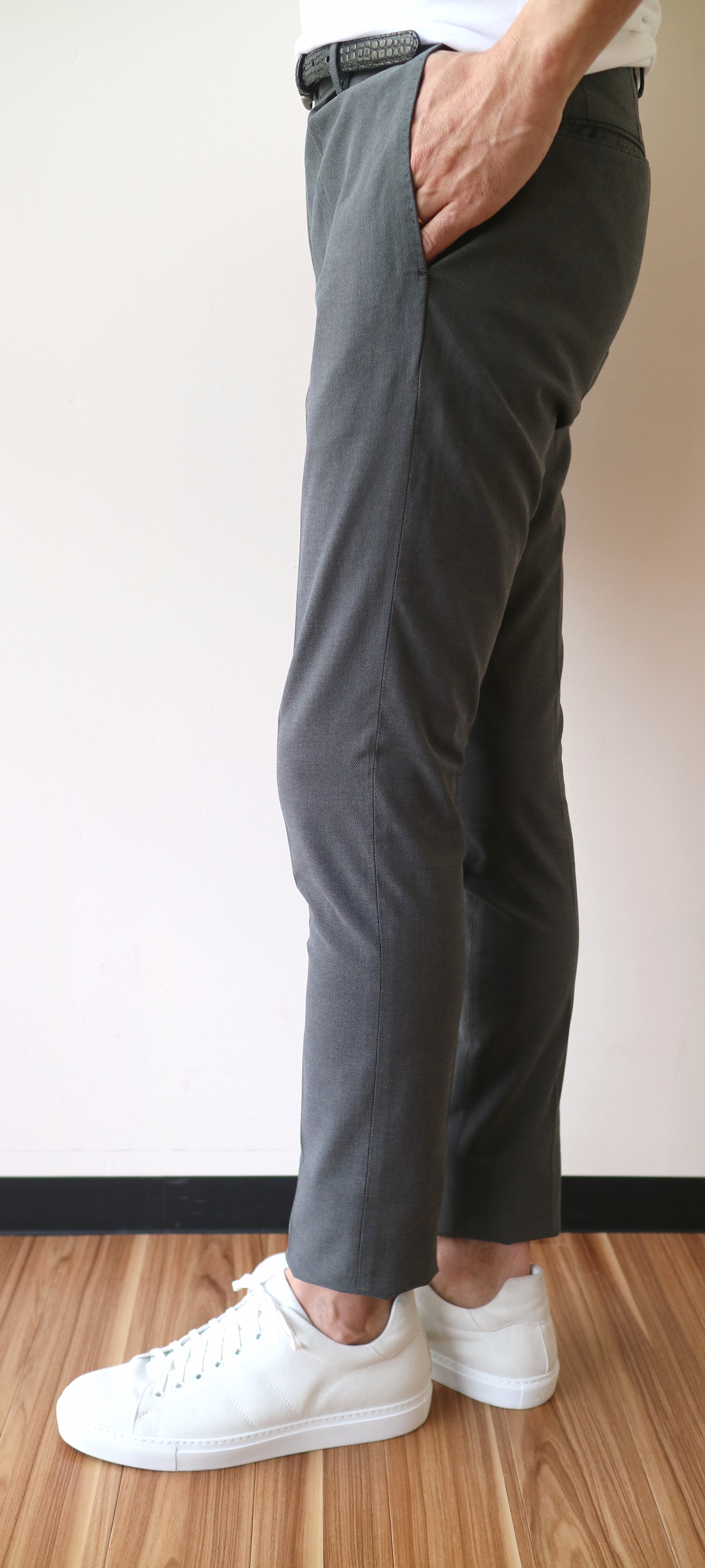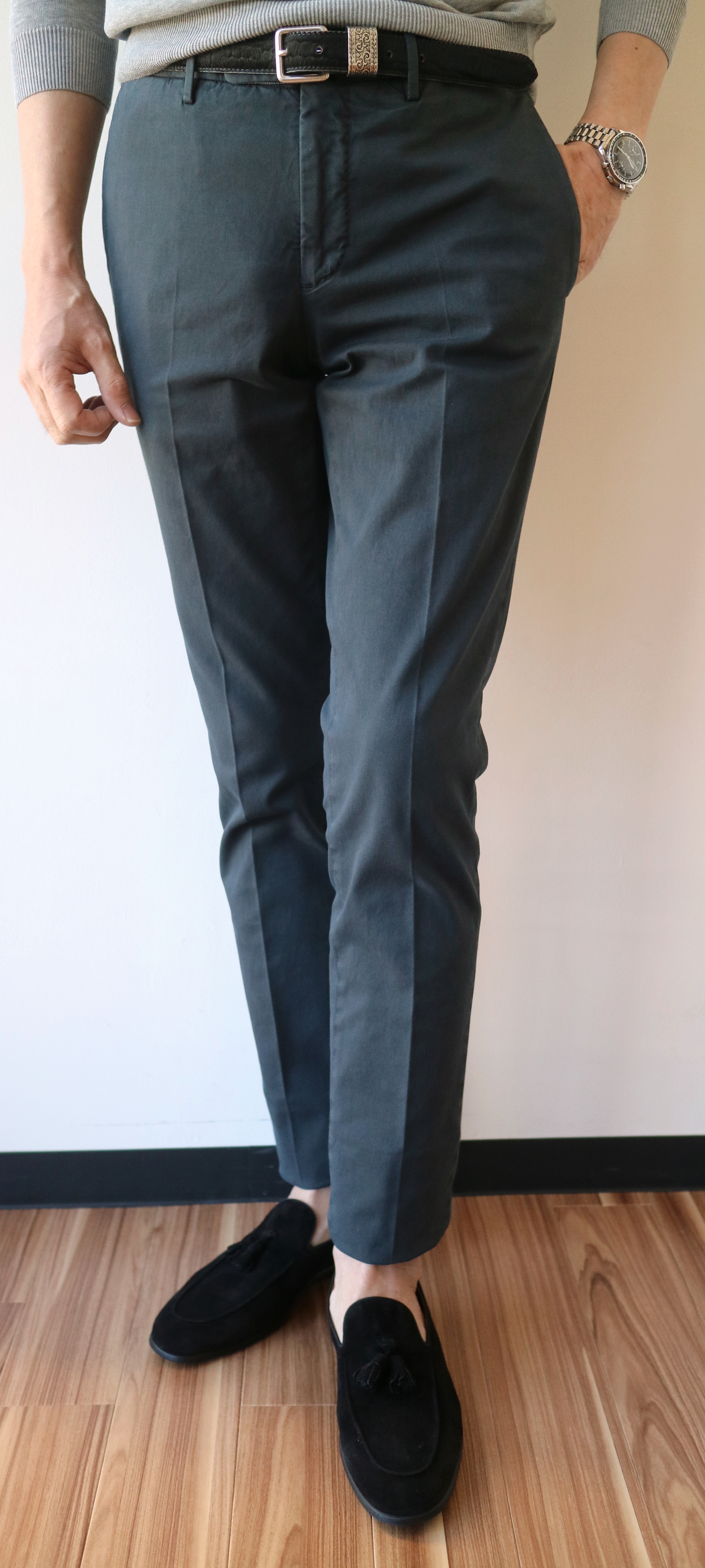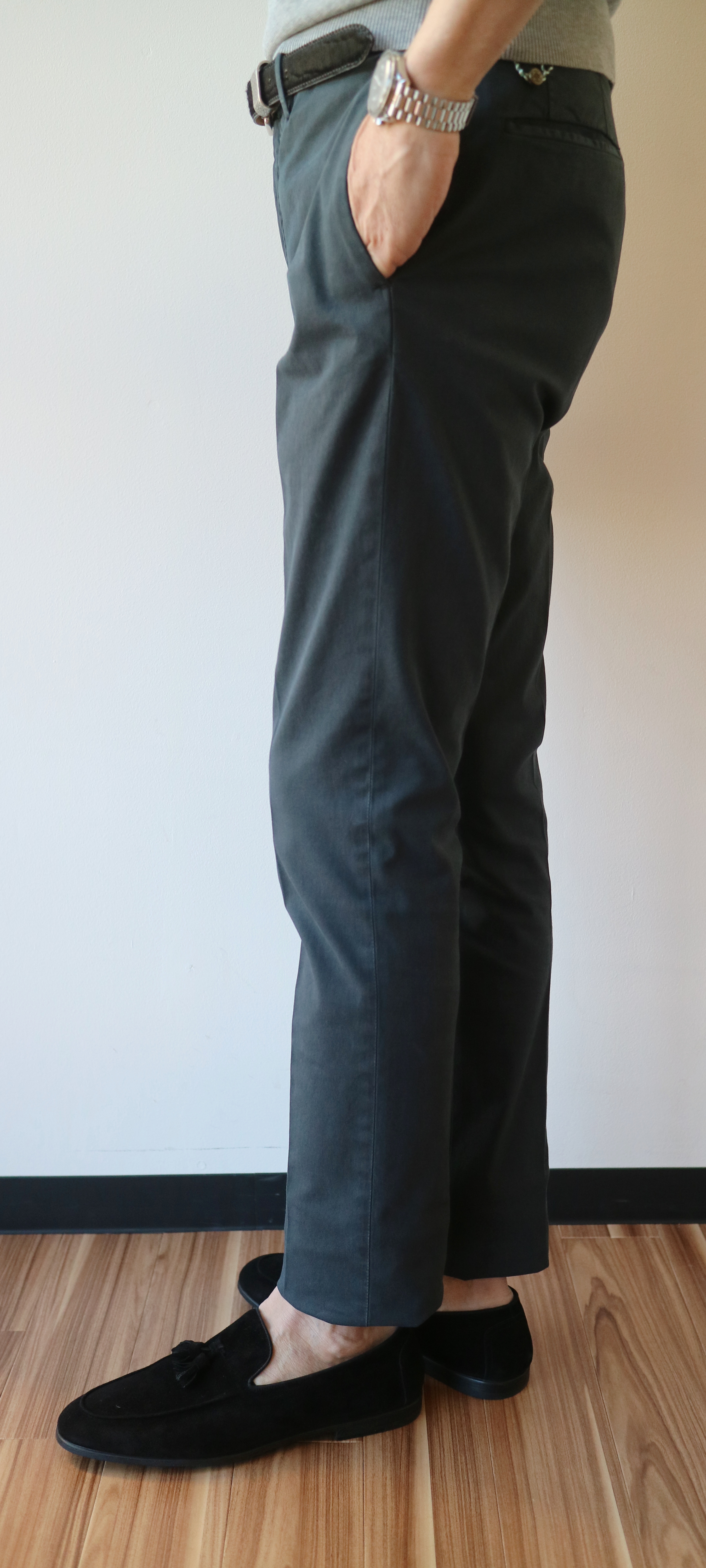 モデルは身長175㎝、体重63K、胸囲91㎝で、ライトジェードグリーンはサイズ44をややタイトに、ダークグレイは、ややゆとりを持って穿いております。