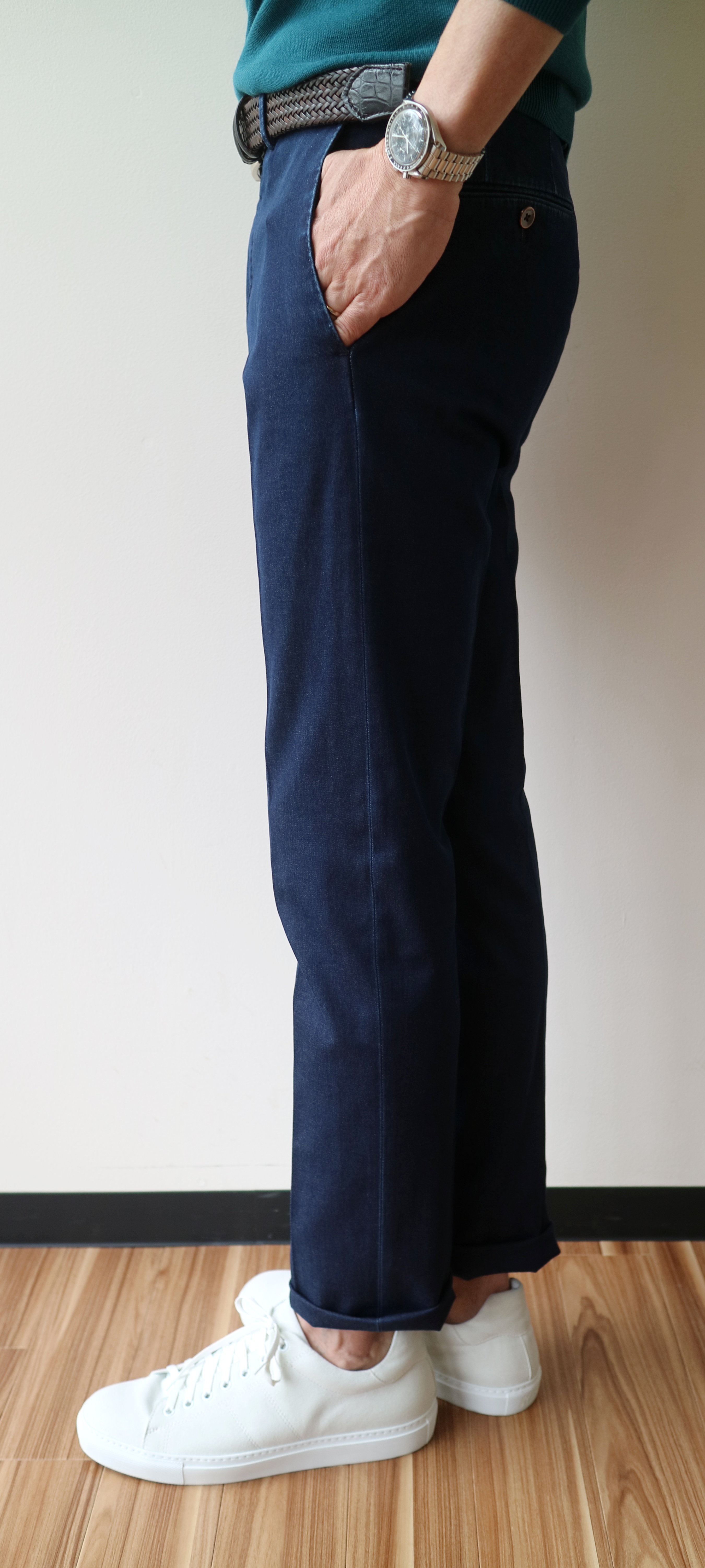 一見、ウールに見せたコットンストレッチパンツは、モデル「A30」。この春夏、「J35」の改良モデルとして発表された「N35」の基本設計が、このスリムフィットモデル「A30」。違いは、後ろポケットの釦が無く、またウエスト内側に付いた滑り止めが省略されていることです。インベルの仕様、フォルムは同じになります。コットンの柔らかな生地が脚を優しく包み込んでくれます。