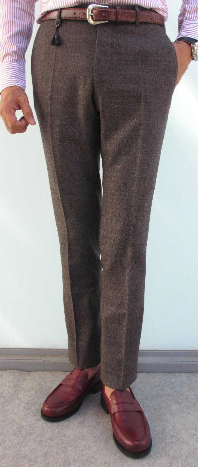 【INCOTEX/インコテックス】のアーカイブから登場したのは、モデル「1AA100」。合わせたニットは、ZANONE(ザノーネ)、シャツは未公開のGlanshirt(グランシャツ)です。