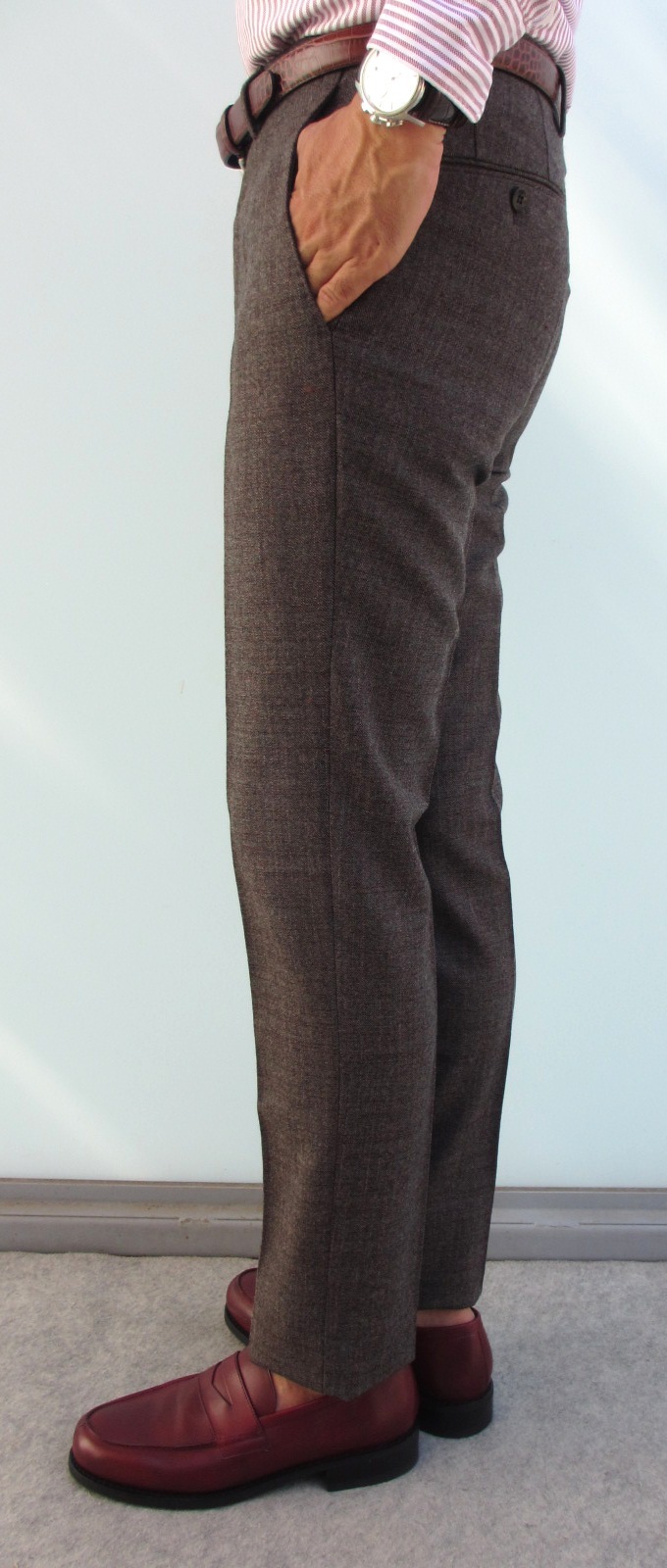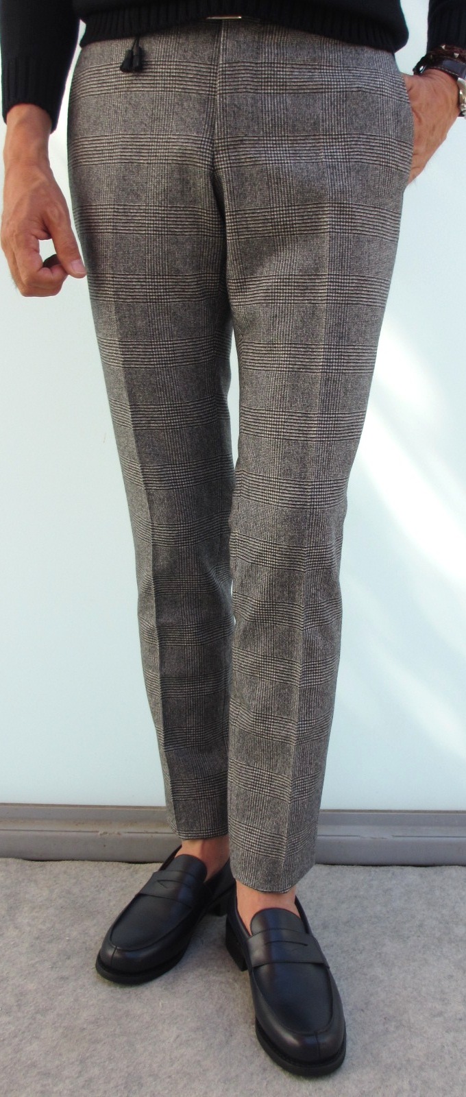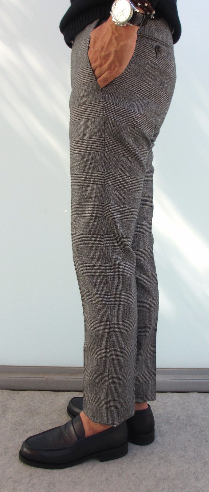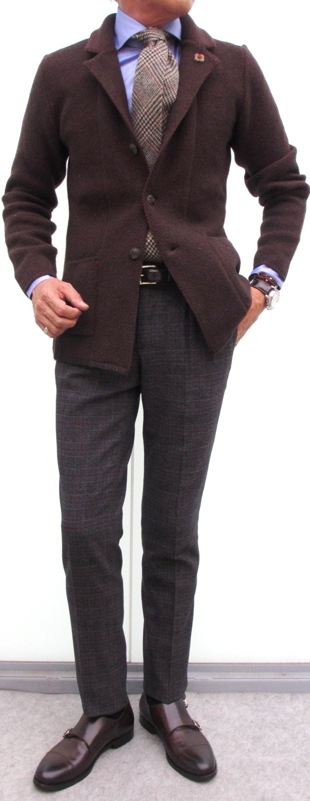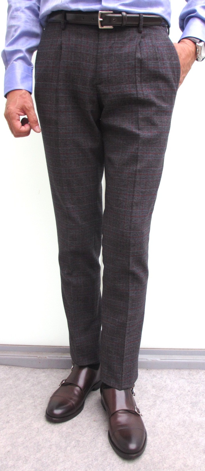 そして、こちらはLARDINI(ラルディーニ)のニットジャケットに合わせていた【INCOTEX/インコテックス】のパンツ。モデルはツータックのスリムフィット「A31」。裾幅は、サイズ46で「N35」が18.5cmに対して18.0cmと、よりテーパード感のあるシルエットです。9月29日にご紹介させていただいた「N35」と比較してみてください。