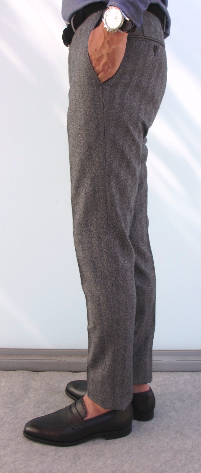 吊り下げタグを付けたまま穿いてしまいたくなるような、パンツの雰囲気にぴったりと馴染んでいます。ストレッチの効かないコットン100%は、ストレッチに慣れてしまった足にはタイトに感じるかもしれません。ただ穿いてしまうとホールド感のよさとジワッと馴染んでくるナチュラルな穿き心地に、昔を思い出し?ます。
