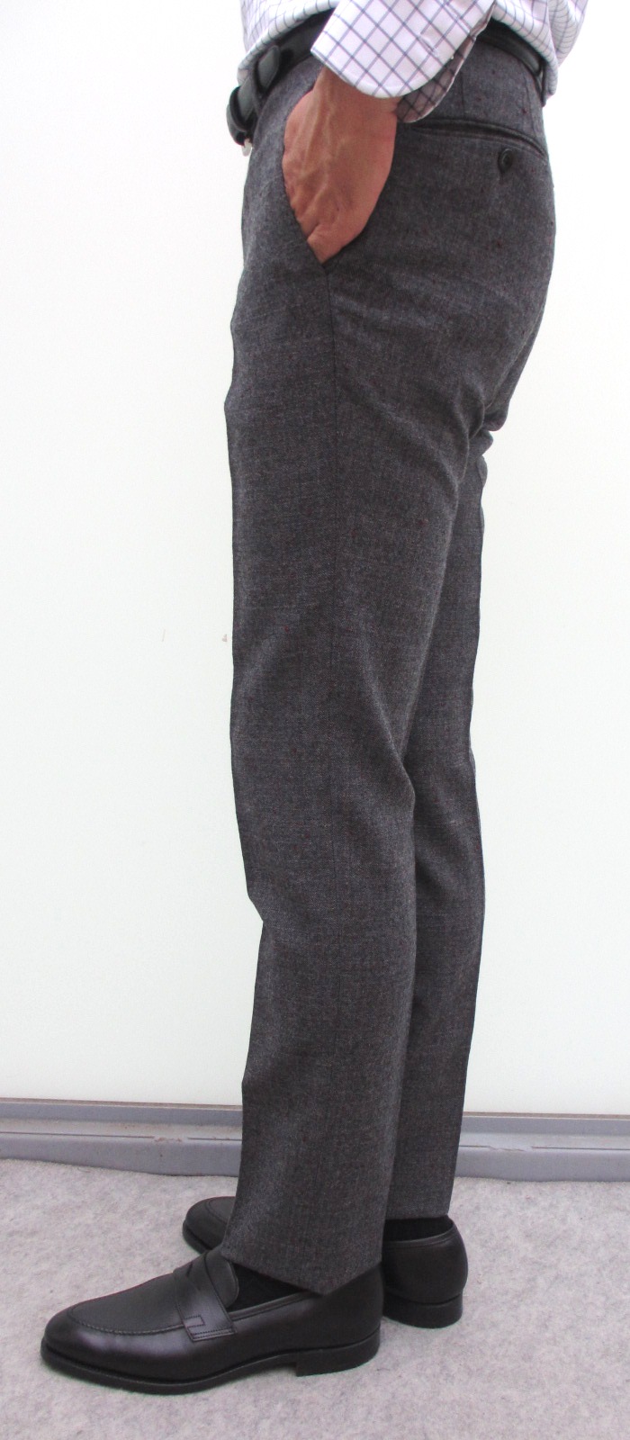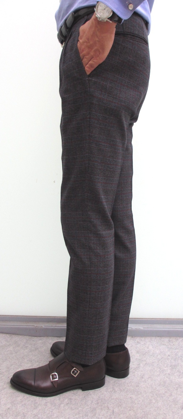 グレイッシュなライトブラウンとチャコールより明るめ、ミディアムグレイより暗めのミディアムチャコールの2色展開です。チェックの中では柔らかで控えめなグラフチェク。合せ方によっては、柄物同士でコーディネートしても面白いパンツです。