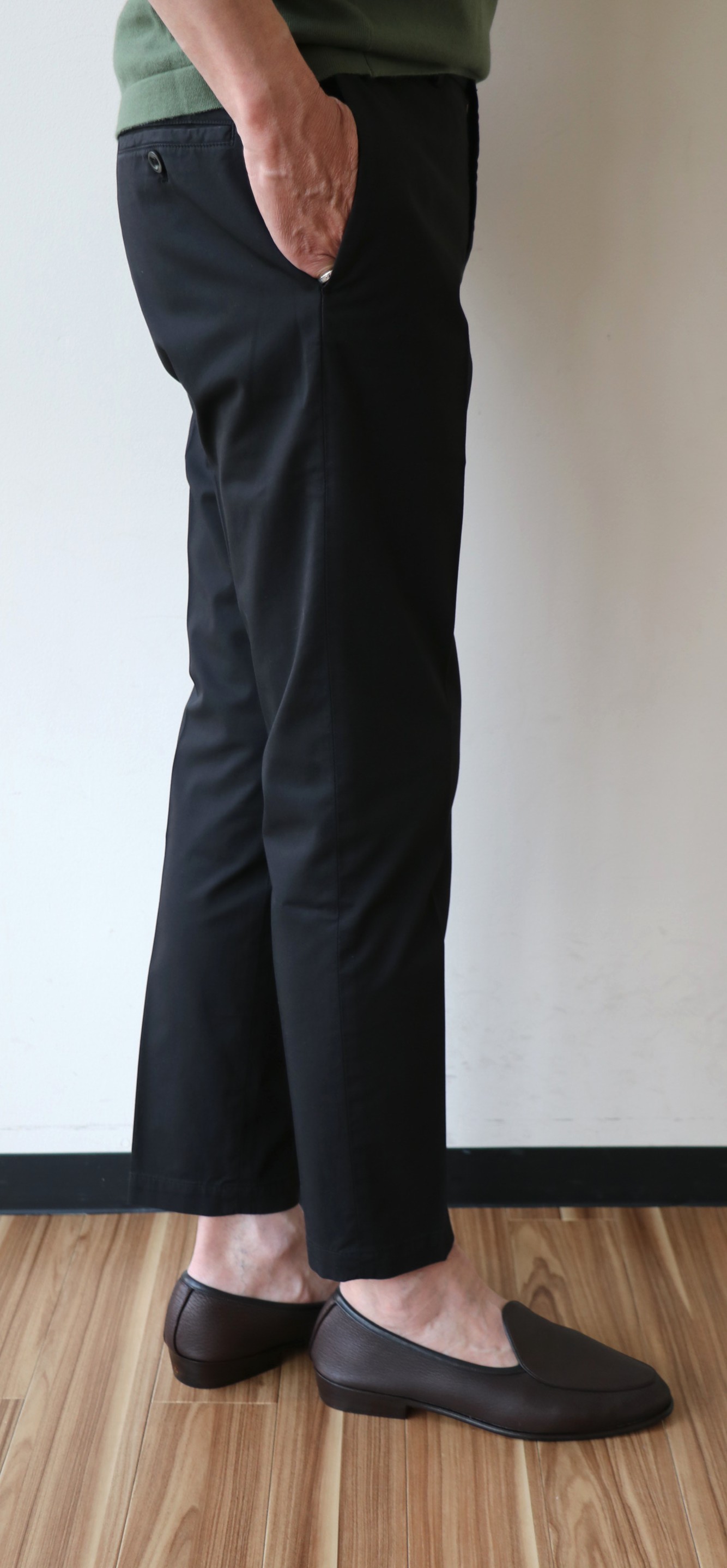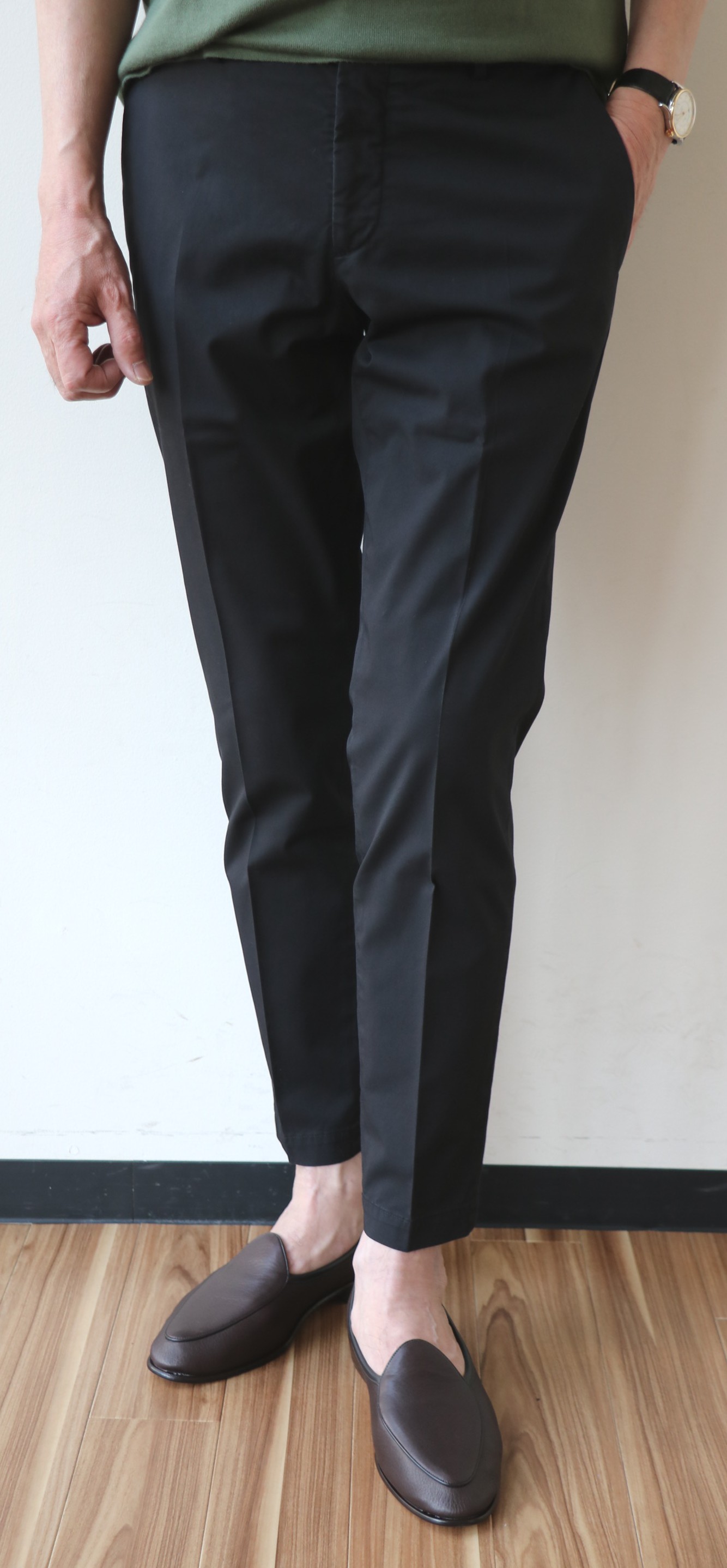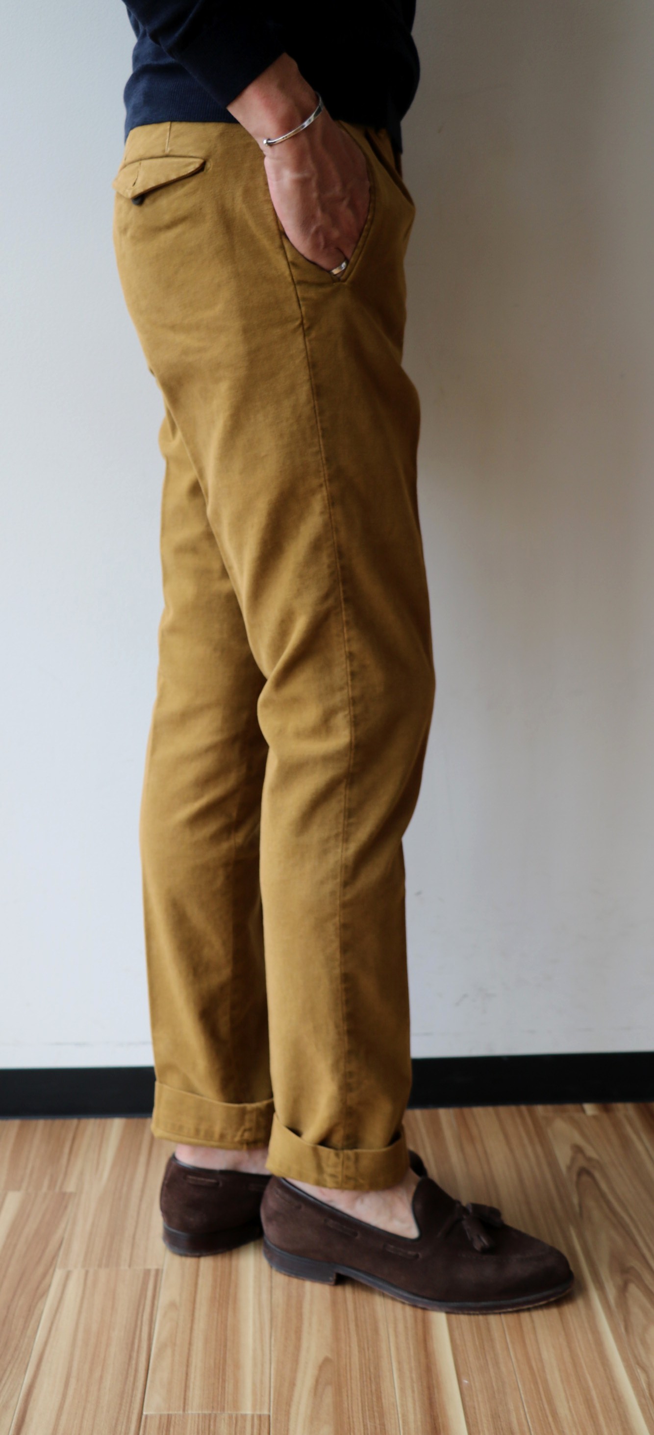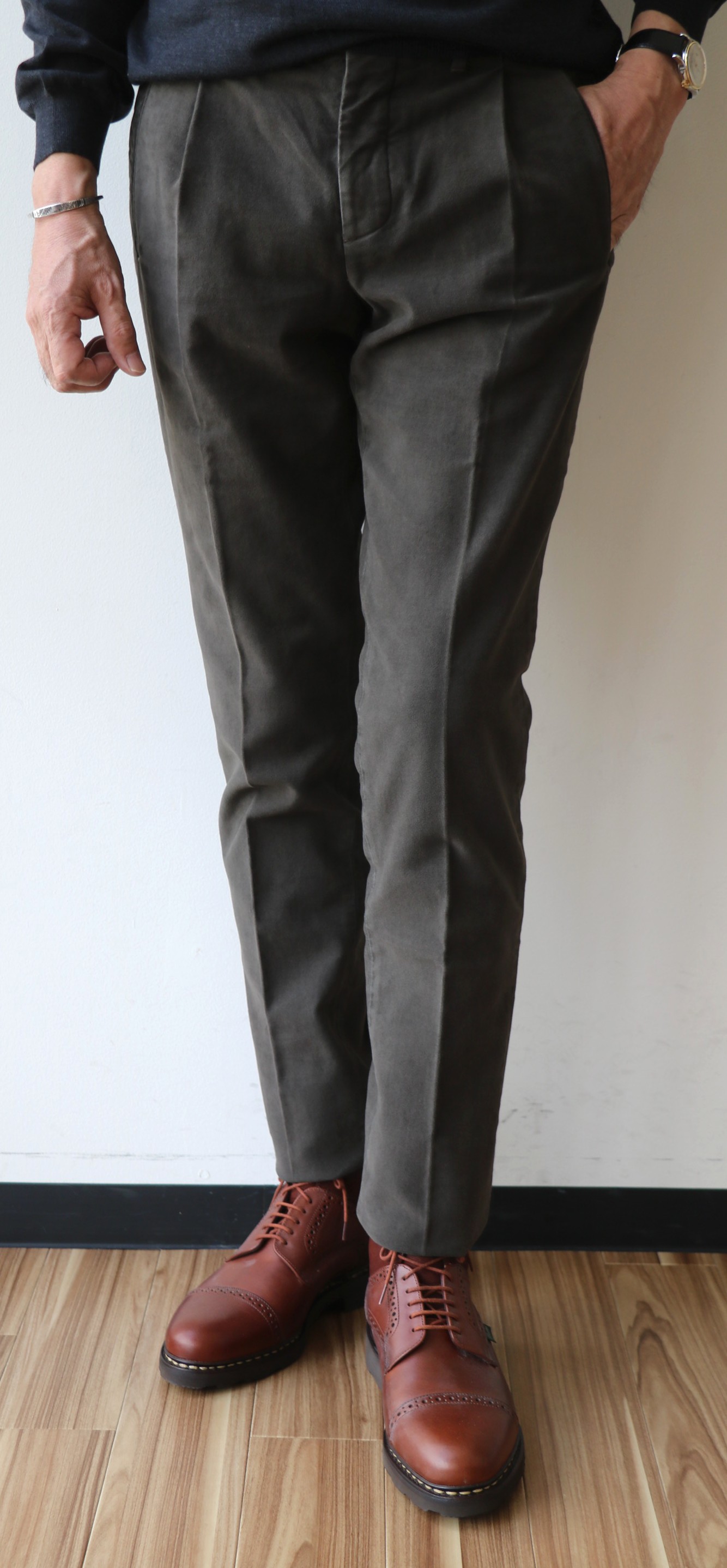 敢えてのノープリーツ。というのも、新作モデルだからです。モデル名は「1AT091」。SLIM FITのテーパードモデルは、インコテックスでは意外に珍しいのではないでしょうか。定番の24番と比べると裾幅は狭く、スポーティーです。このフォルムの好きな方は多く、私もその一人。若々しく魅せるは、大切なことです。