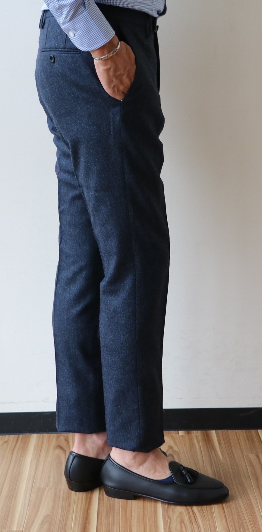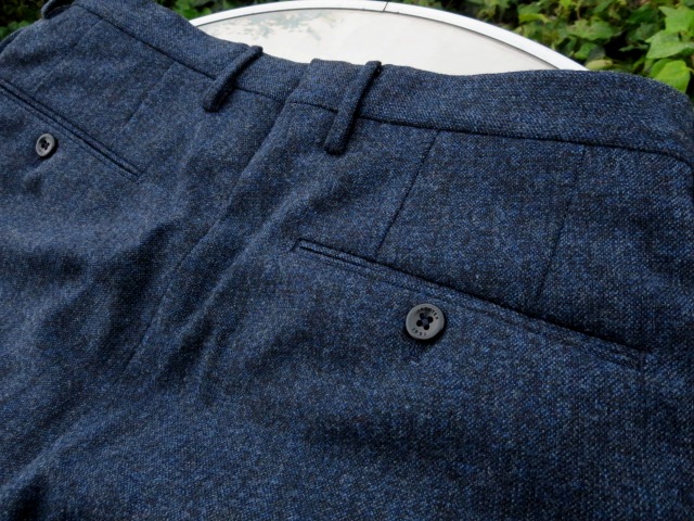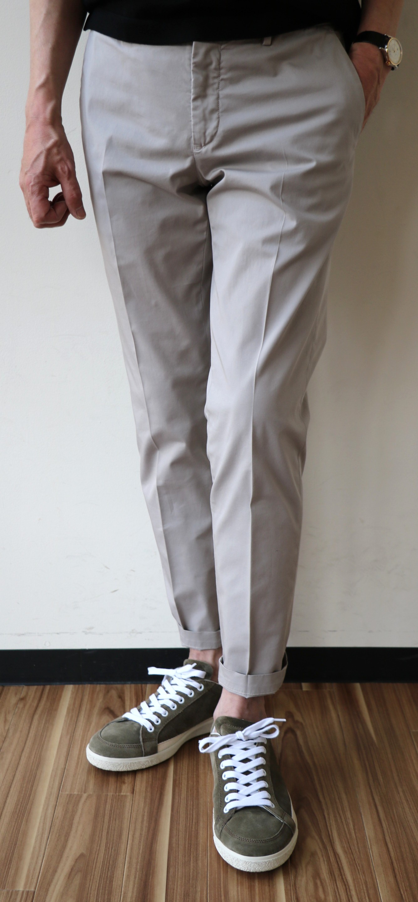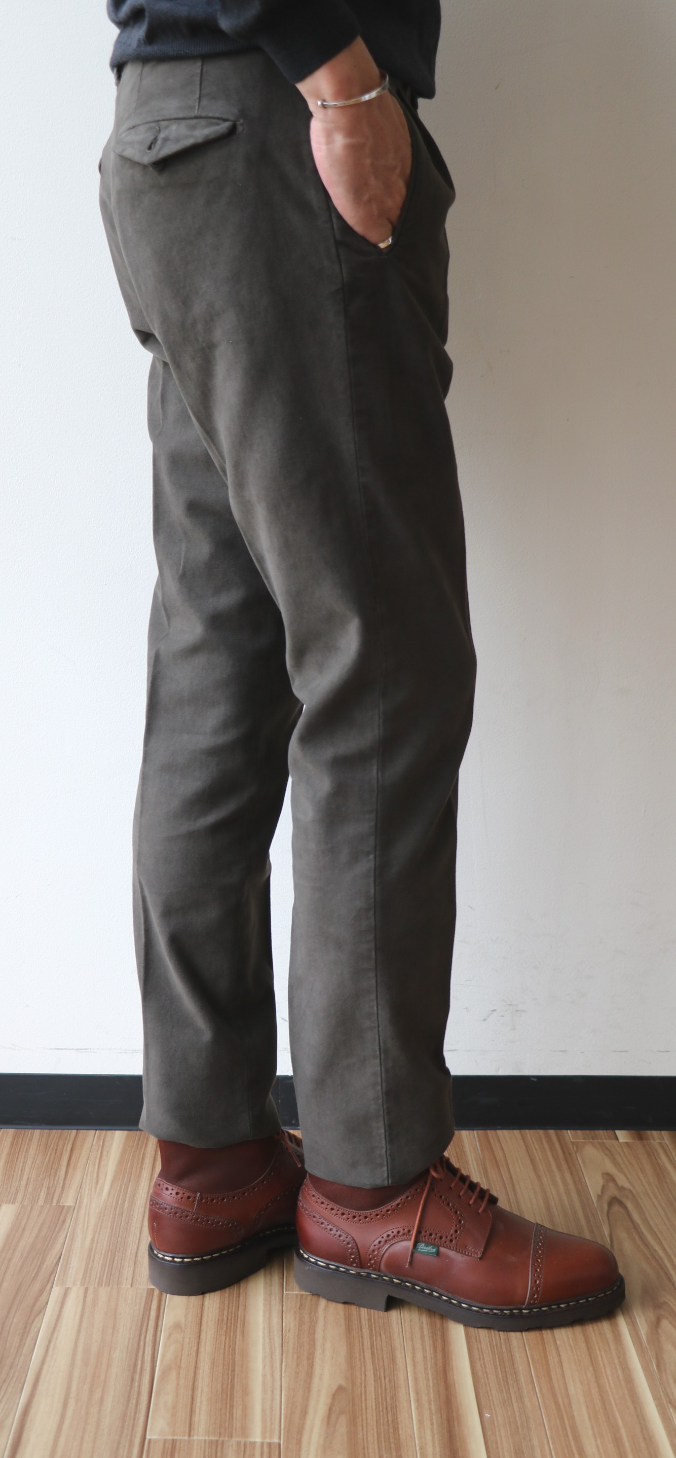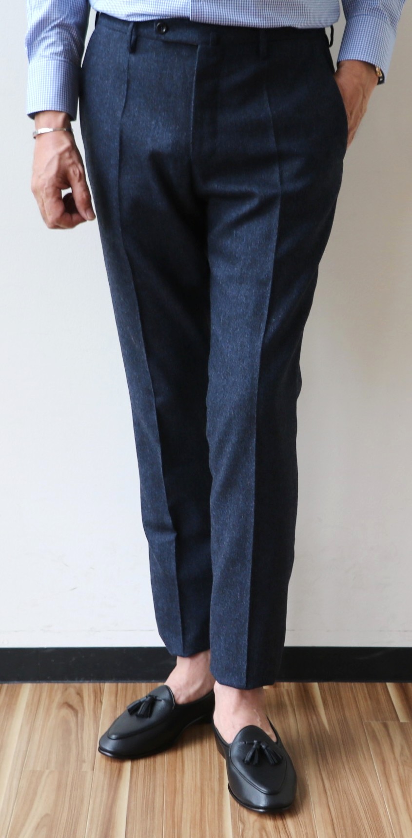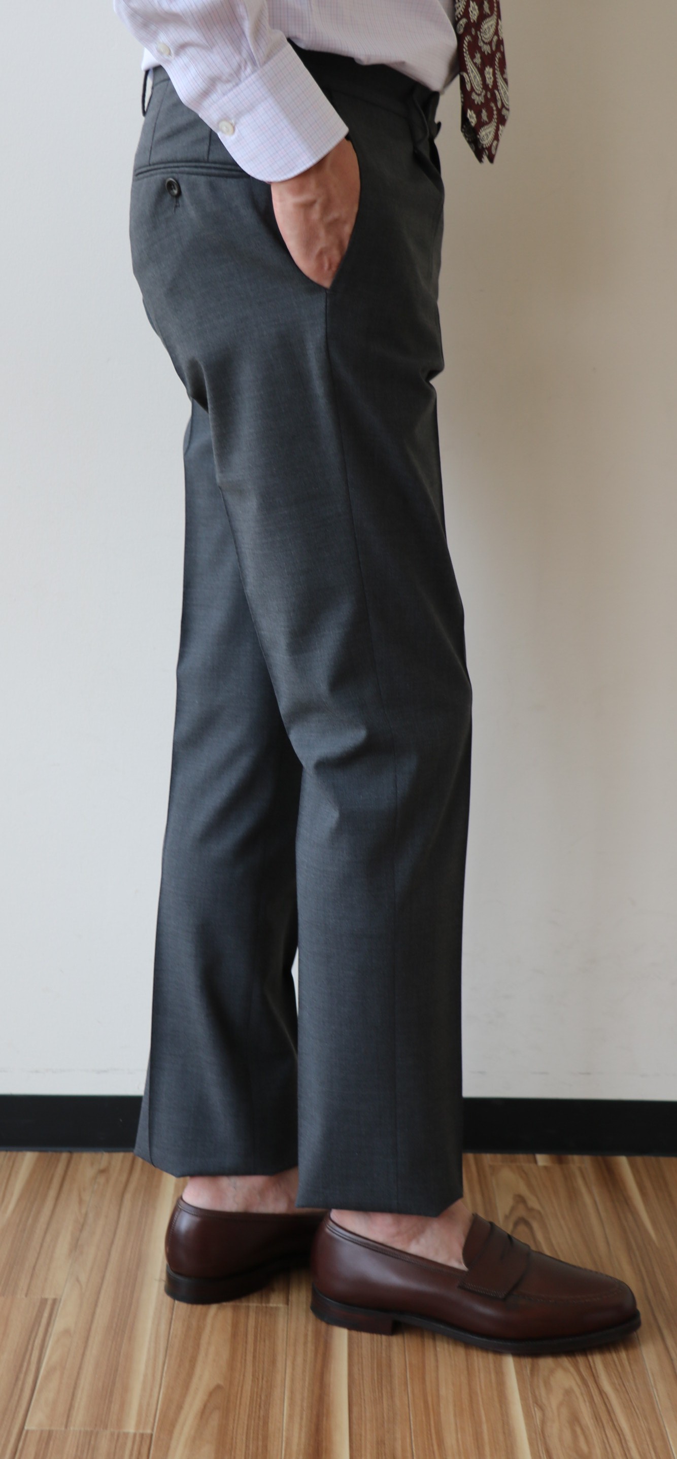 敢えてのノープリーツ。というのも、新作モデルだからです。モデル名は「1AT091」。SLIM FITのテーパードモデルは、インコテックスでは意外に珍しいのではないでしょうか。定番の24番と比べると裾幅は狭く、スポーティーです。このフォルムの好きな方は多く、私もその一人。若々しく魅せるは、大切なことです。