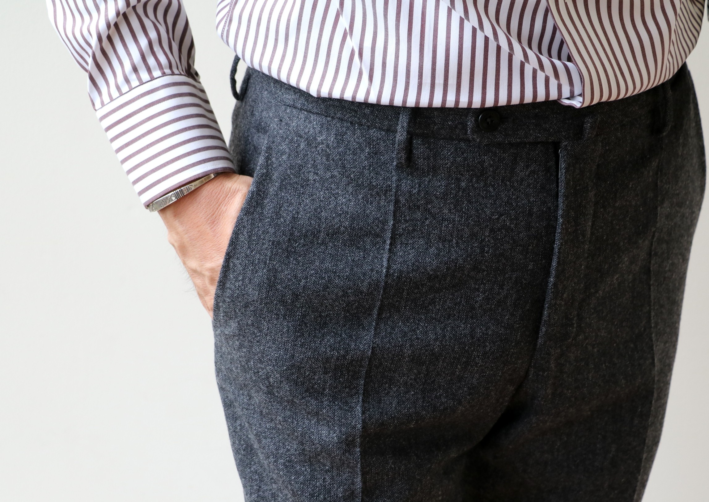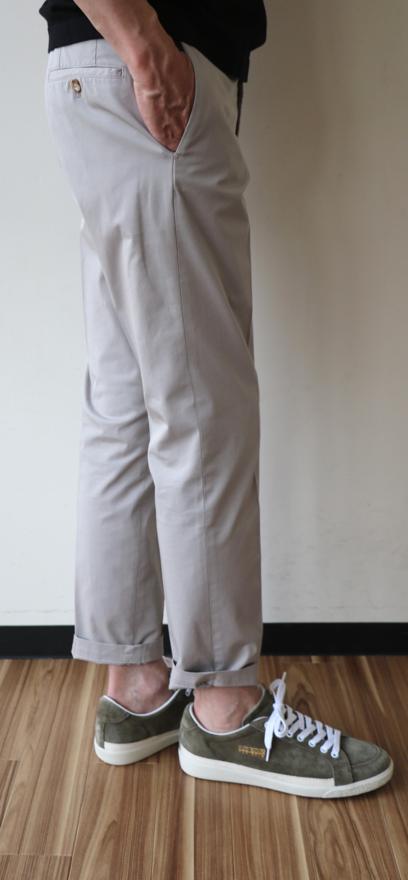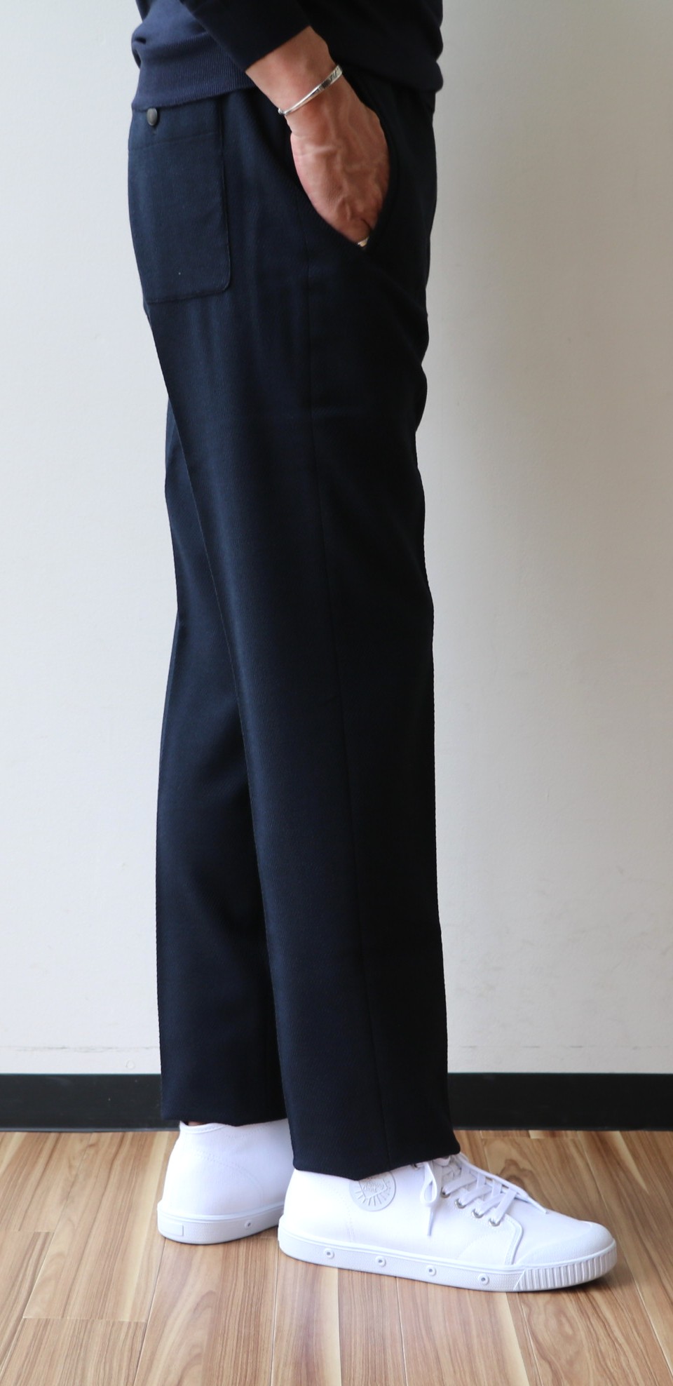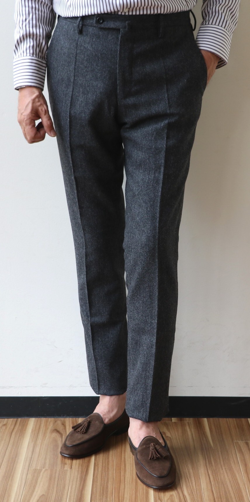 敢えてのノープリーツ。というのも、新作モデルだからです。モデル名は「1AT091」。SLIM FITのテーパードモデルは、インコテックスでは意外に珍しいのではないでしょうか。定番の24番と比べると裾幅は狭く、スポーティーです。このフォルムの好きな方は多く、私もその一人。若々しく魅せるは、大切なことです。