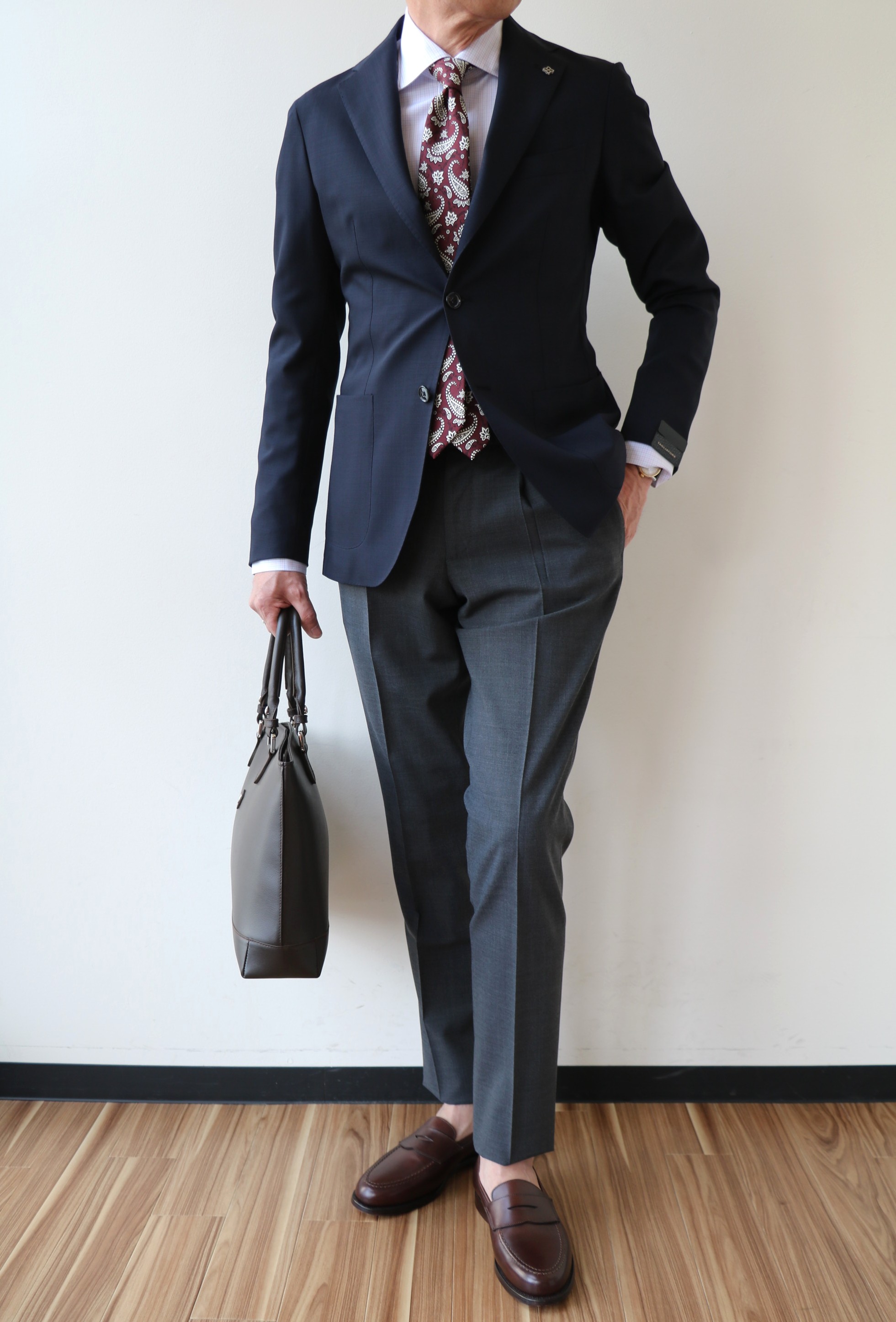 合わせたジャケットは、サイズ欠けしていたTAGLIATORE(タリアトーレ)、シャツは明日ご案内予定のFinamore(フィナモレ)、ネクタイはHolliday&Brown(ホリデイアンドブラウン)、靴はCROCKETT&JONES(クロケットアンドジョーンズ)、鞄はCHAMBORD SELLIER(シャンボールセリエ)です。