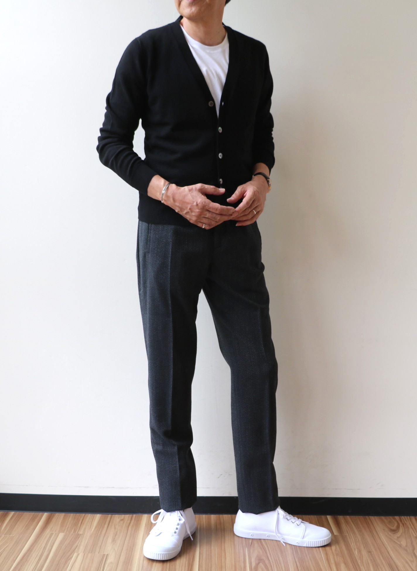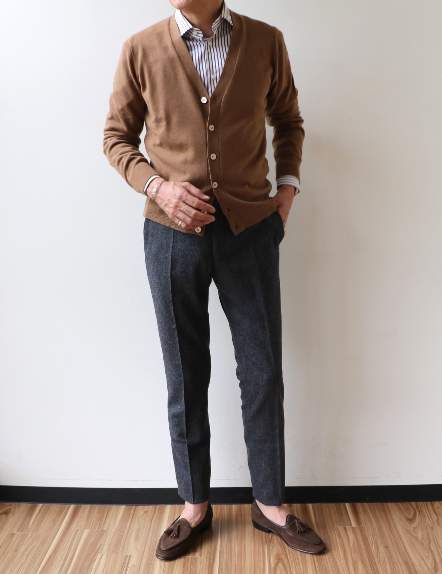 合わせたニットは、いずれも新作のFILIPPO DE LAURENTIIS(フィリッポ デ ロウレンティス)。近日中のご案内となりますが、今回、意識的にバイイングしたのが、ごくごくシンプルなカーディガン。なぜかは、次回に。ここでは下半身に集中しましょう。