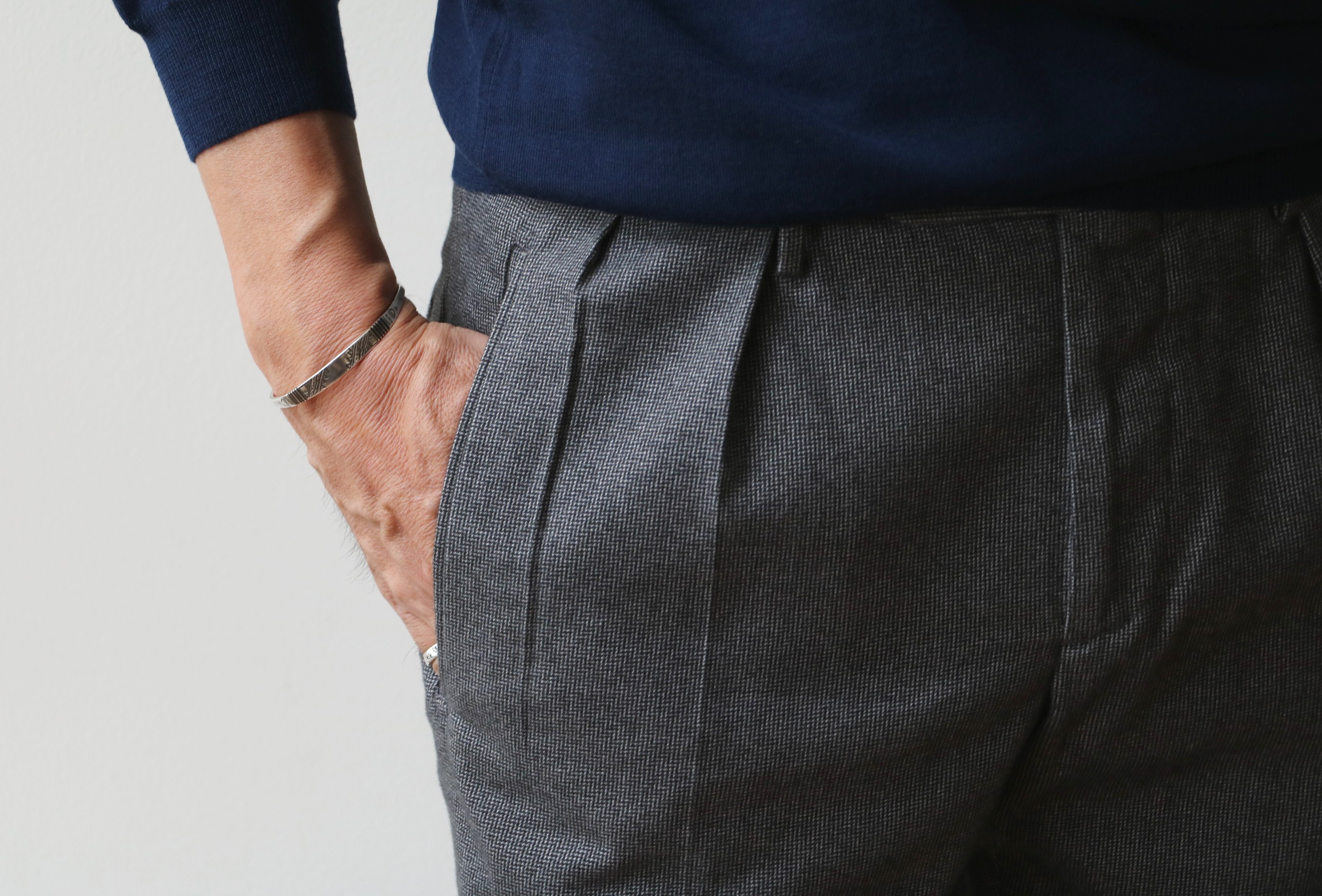 カメラマンのカミさんから、「脚、長っ!!」と褒めていただくほど、長く見えるのは、やはり【INCOTEX/インコテックス】のパンツです。モデルは「1WT96X」。この夏にご提案させていただいたメランジ調のシャーリングパンツとシルエットは似ていますが、生地の違いでしょうか。とても落ち感があり、すっきりとしたシルエットを生み出しています。