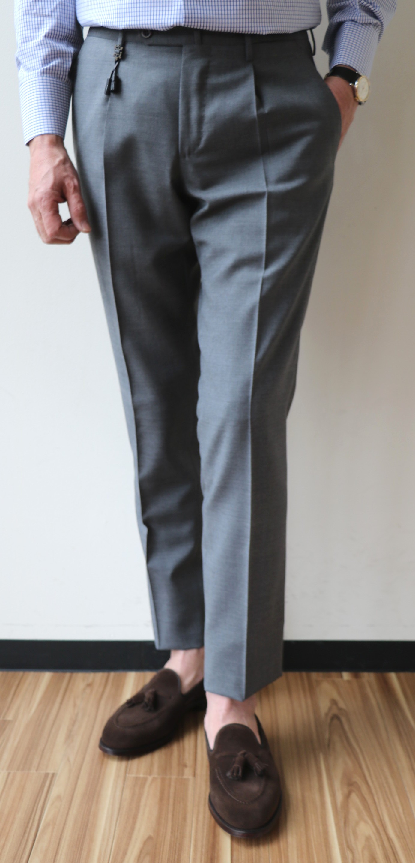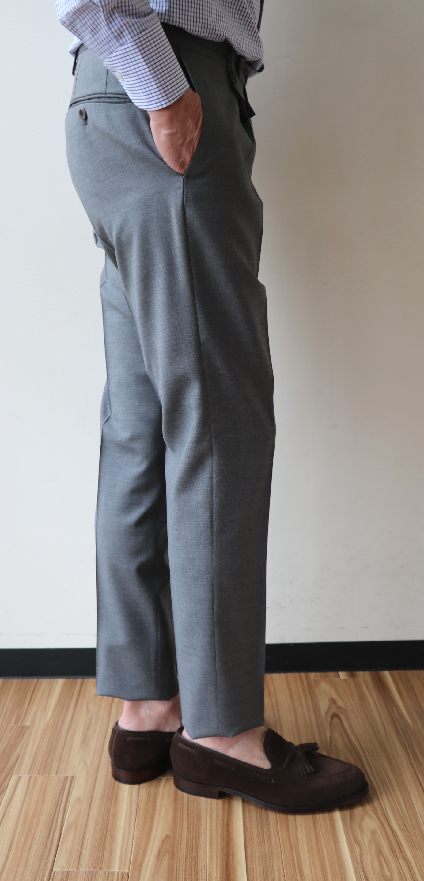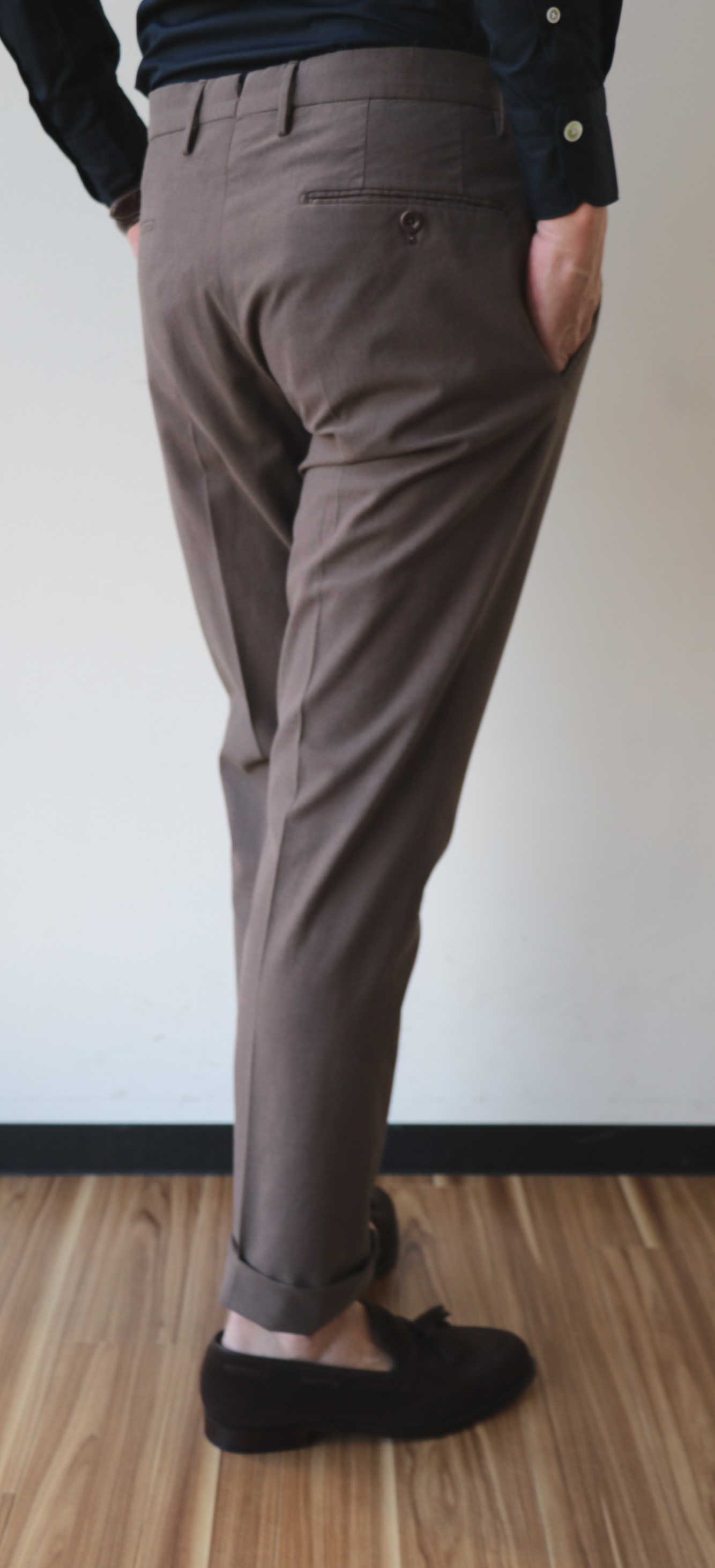 昨年まで、少しゆるかったBOGLIOLI(ボリオリ)のジャケット、サイズ46。フラ効果でしょうか。肩など上半身に筋肉がついたせいか、今年はいけそうです。いや、ジャケットの紹介ではありません。パンツでした。モデルは変われど、展開を始めた時から、ずっと繋いできているSUPER100'Sのトロピカルウール。売れる年もあれば売れない年もある、定番中の定番生地。このパンツがなければ、大人のセレクトショップとは言えない...それほど、オトコのワードローブには欠かせないパンツなんです。