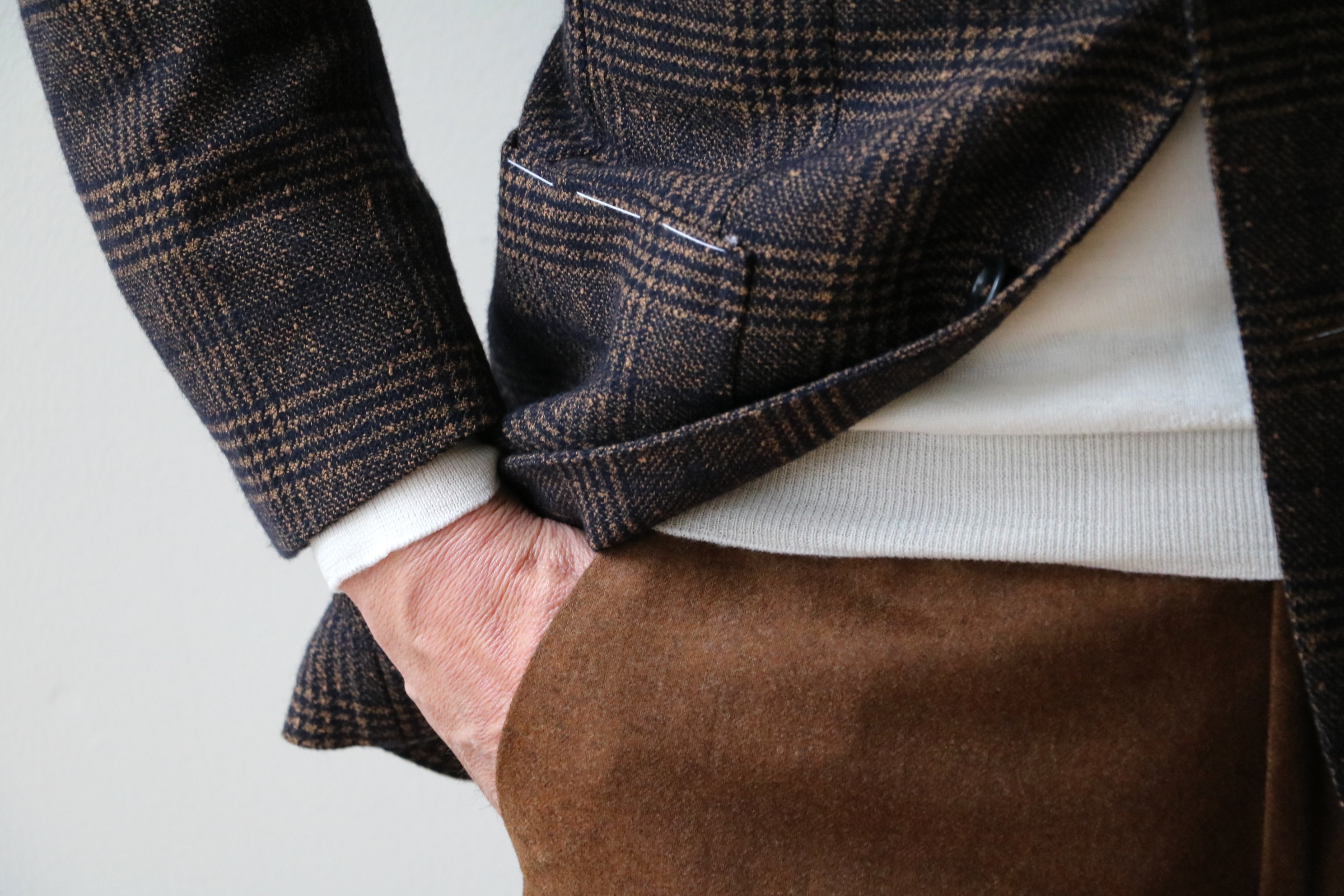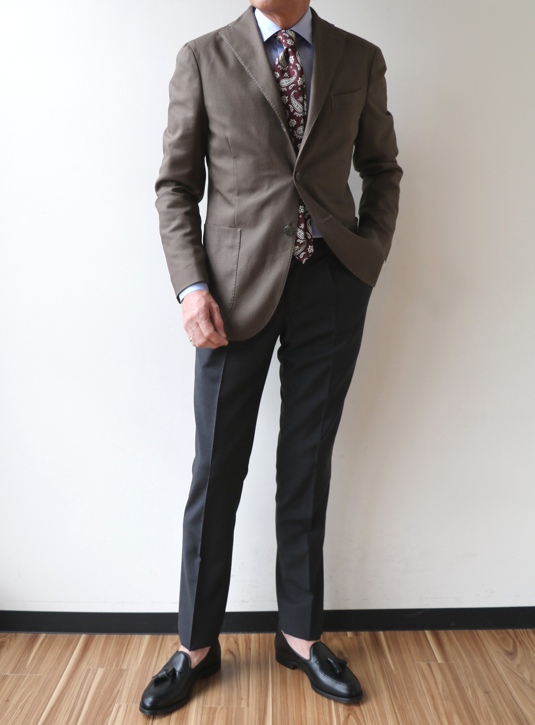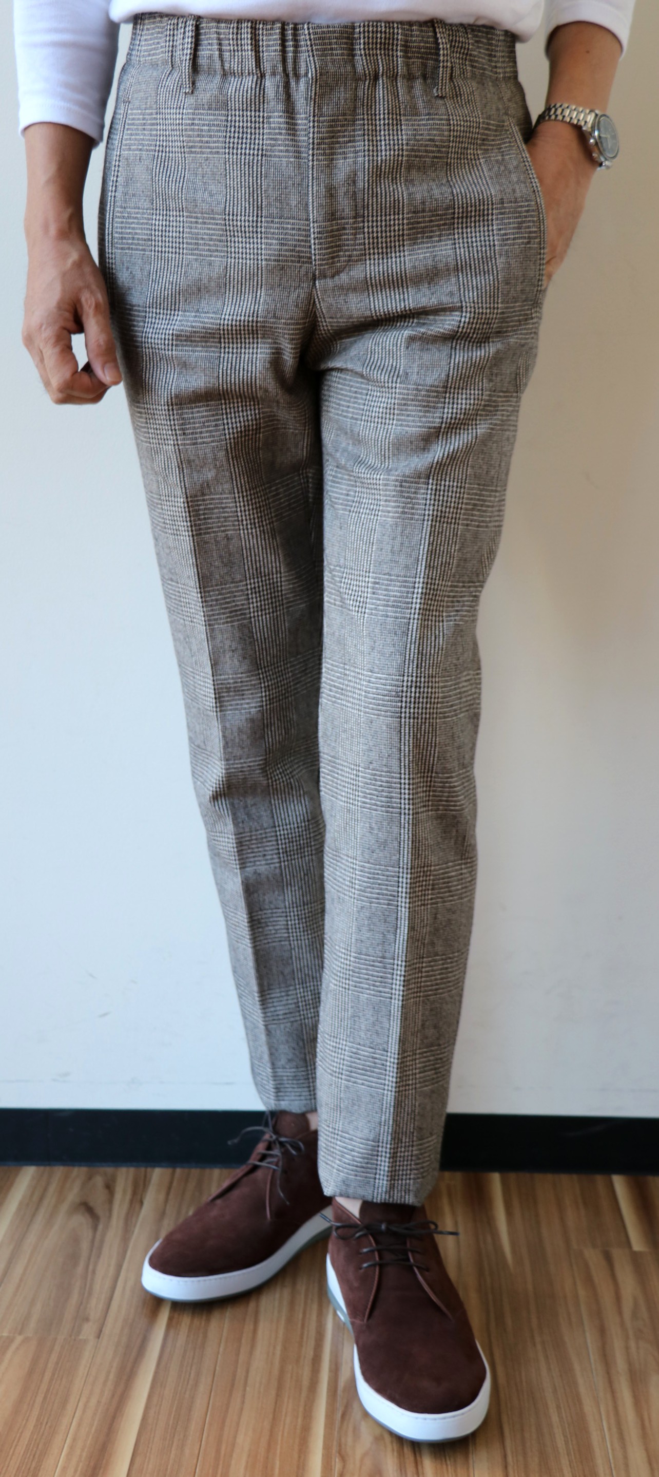 昨年まで、少しゆるかったBOGLIOLI(ボリオリ)のジャケット、サイズ46。フラ効果でしょうか。肩など上半身に筋肉がついたせいか、今年はいけそうです。いや、ジャケットの紹介ではありません。パンツでした。モデルは変われど、展開を始めた時から、ずっと繋いできているSUPER100'Sのトロピカルウール。売れる年もあれば売れない年もある、定番中の定番生地。このパンツがなければ、大人のセレクトショップとは言えない...それほど、オトコのワードローブには欠かせないパンツなんです。