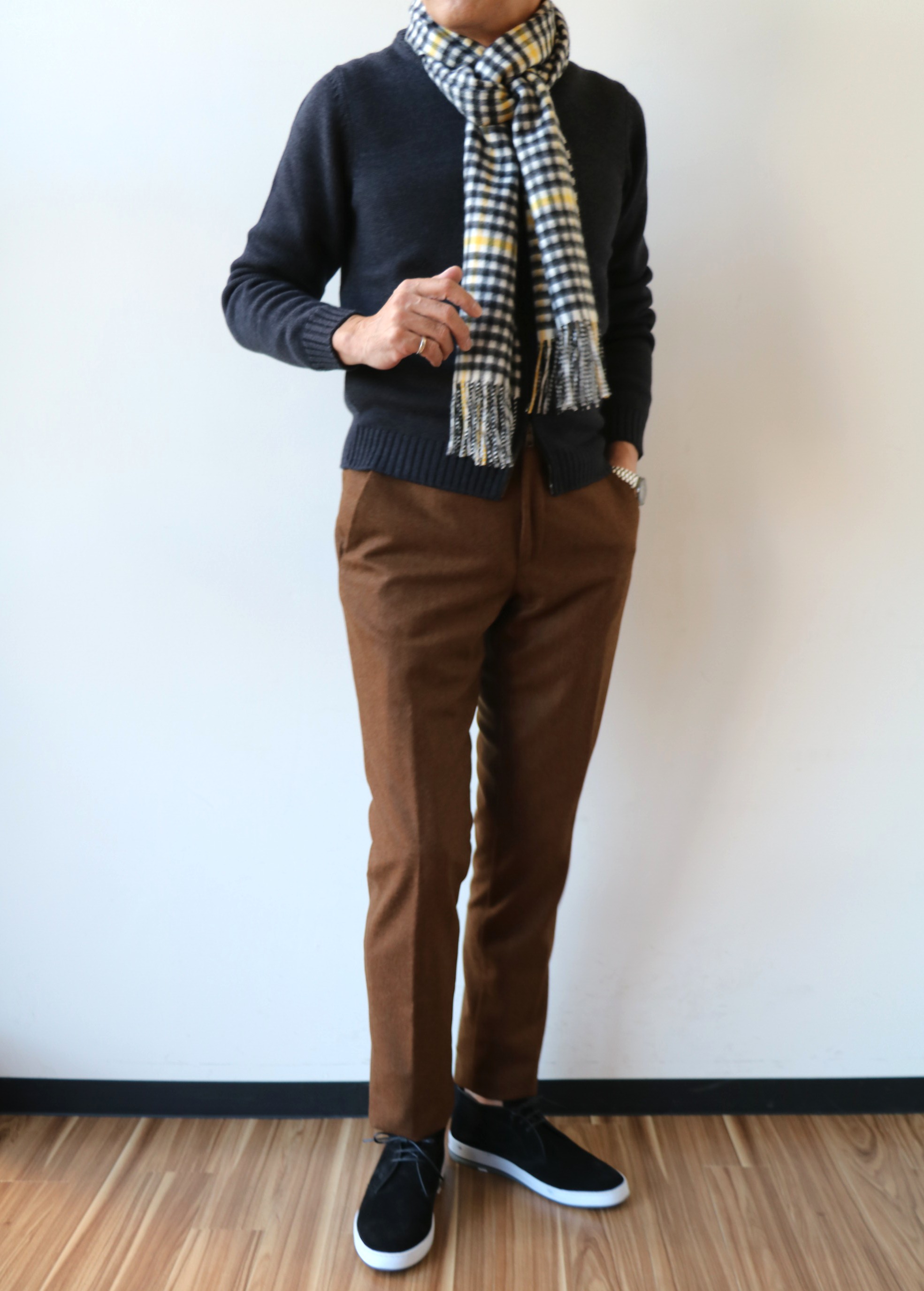 この秋冬のトレンドカラーとして人気のサドルブラン。ブラウンよりオレンジ寄り、オレンジよりキャメル寄り、キャメル寄り濃い、焼いた土を意味するテラコッタより赤味の少ない...そんな感じの色です。合わせたのはチャコールグレイのZANONE(ザノーネ)のニット。JOHNSTONES(ジョンストンズ)のマフラーを巻いて、足元は、近日ご案内のHESCHUNG(エシュン)を履いてみました。