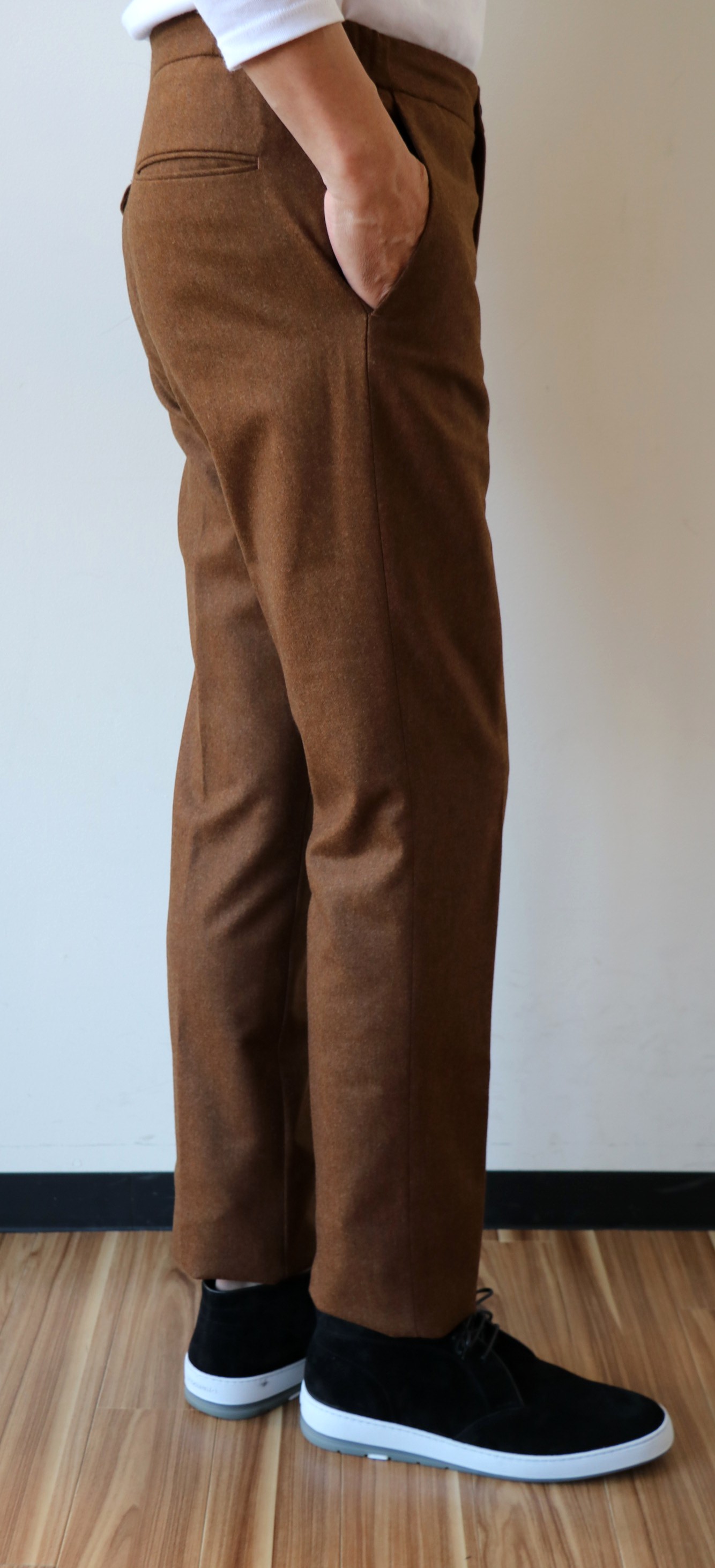 ボトムも、ジャケットに使われている琥珀色で合わせてみました。SUPER 100'Sのフランネル地はジャケットまでをも甘い香りで包み込んでしまうほどです。