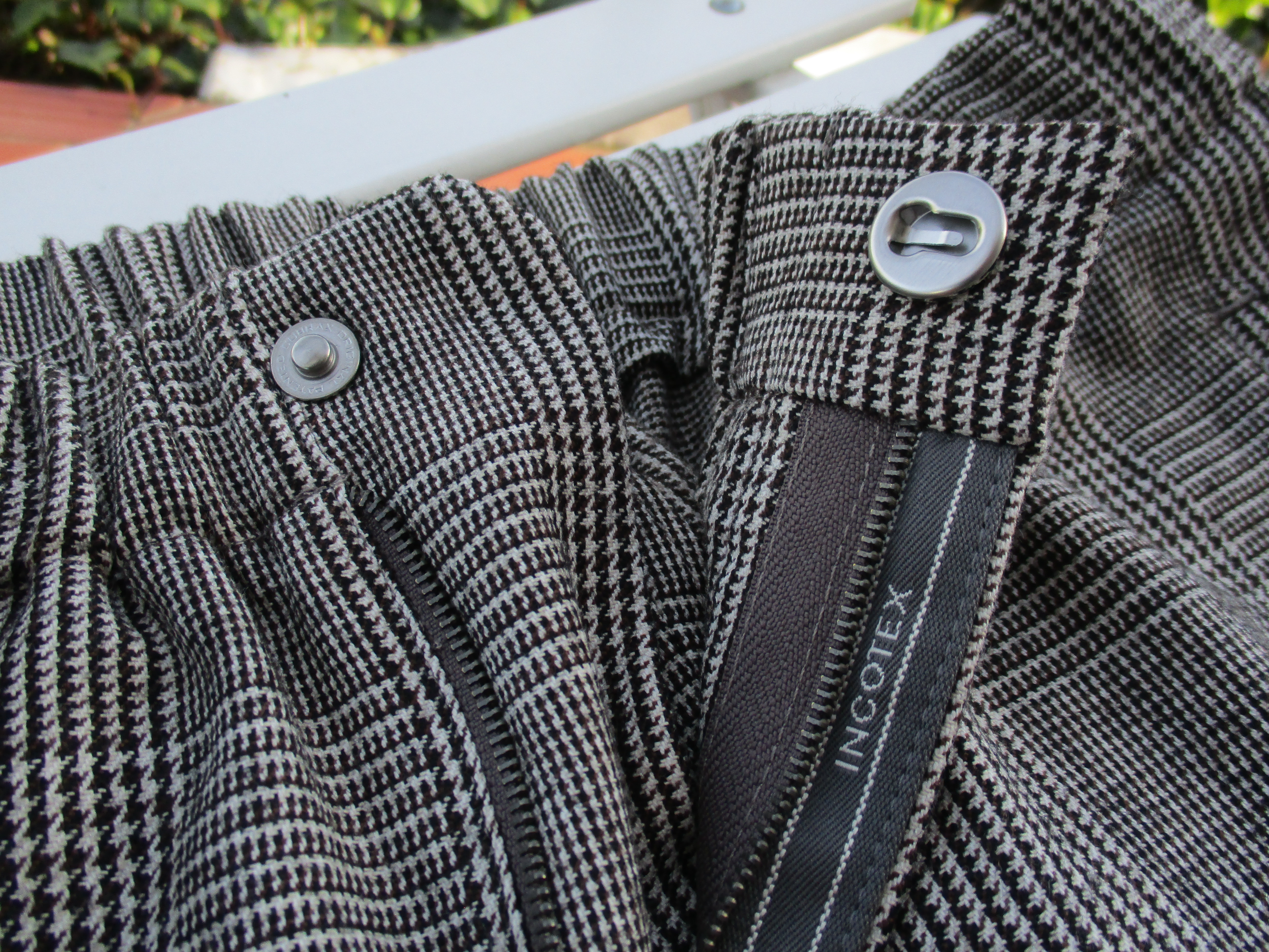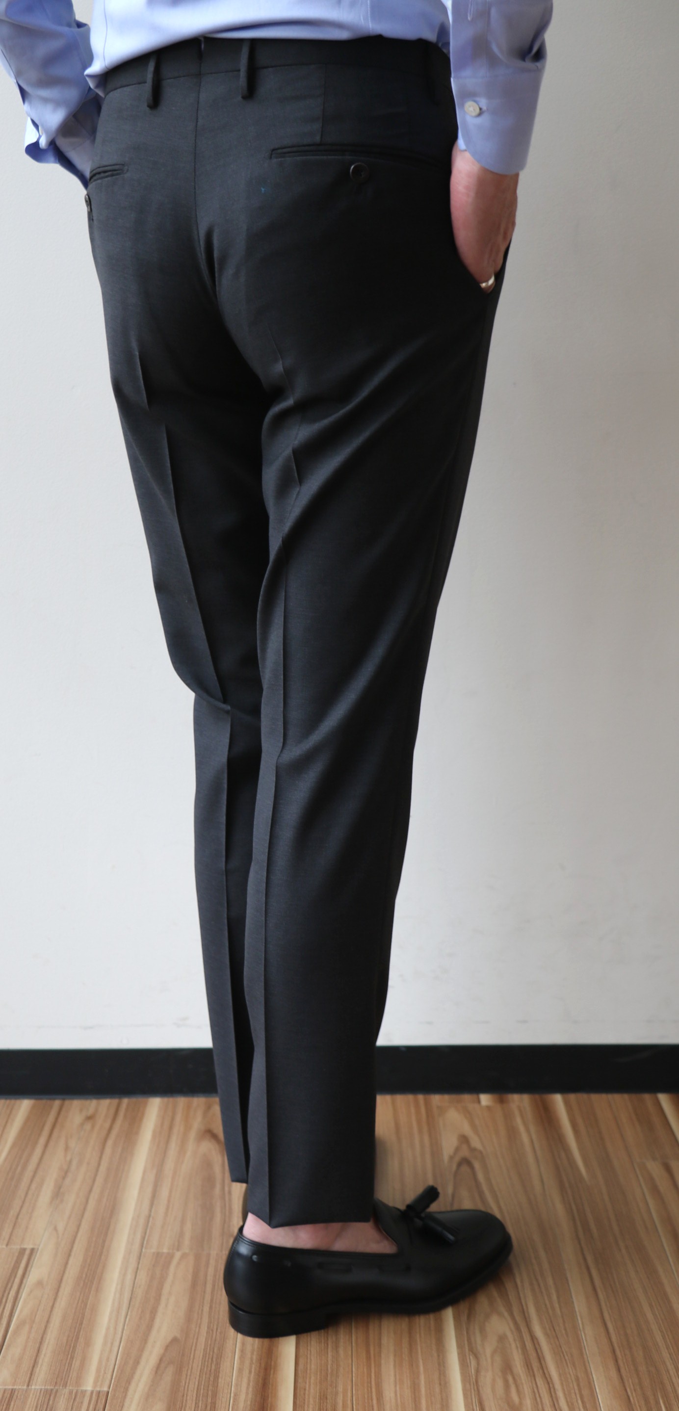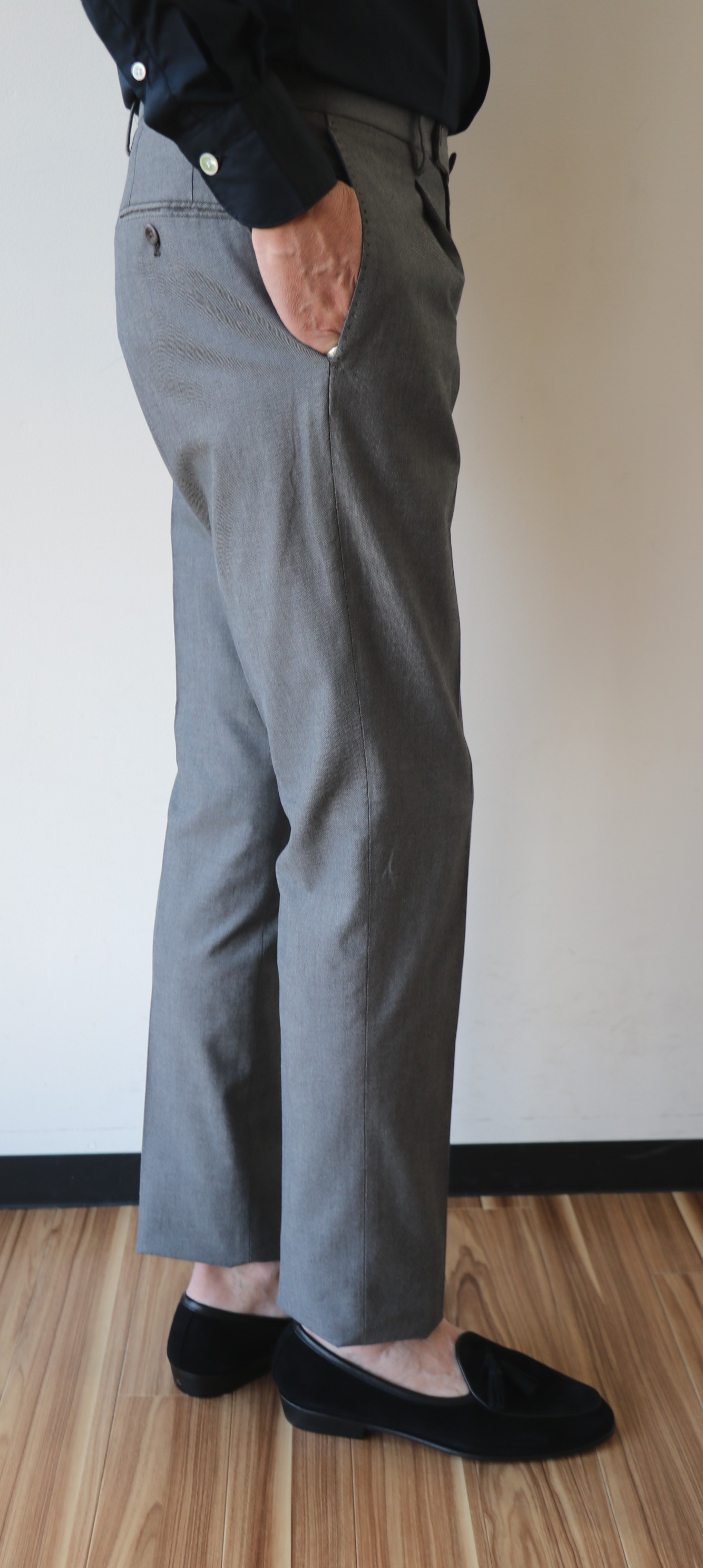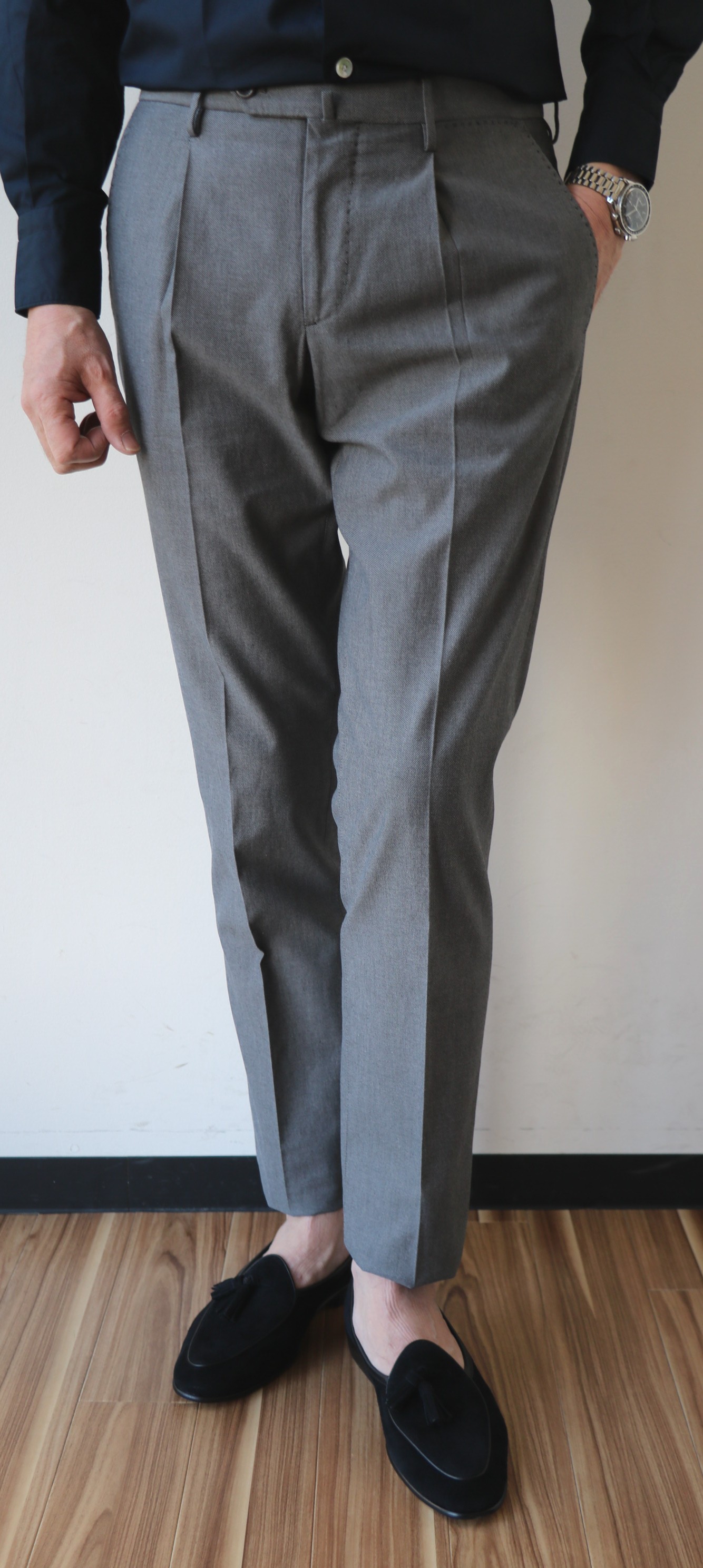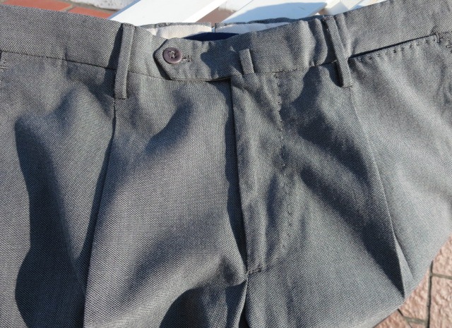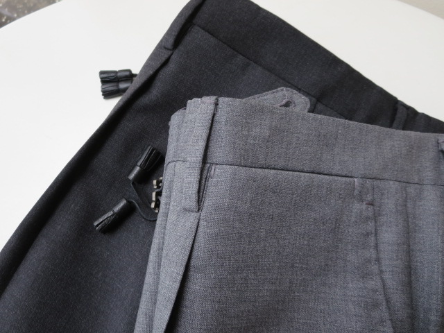 プレコレクションの際に写した写真です。手帳を見れば、昨年の7月3日でした。コレクションの中で、最も気になったのが、この深いひだのツープリーツ。それも外側ではなく、内側のインプリーツに。いつもなら、殆ど試着しないでオーダーするのですが、穿いてみたいと、その気にさせてくれたパンツです。インプリーツは、正式には、Forward Pleat/フォワード プリートと言いますが、英国のパンツに多く見られます。逆のアウトプリーツは、Reverse Pleat/リバース プリートといい、アメリカやイタリアのものに多いデザイン。よりエレガントに見えるのは、内側のものです。英国趣味だった私は、20代の頃から好んで穿いていたのが、インのツープリーツ。当時はブレイシーズ(サスペンダー)をつけていましたが、このモデルの良いところは、深すぎない股上。サスペンダーなしで、英国的な装いを楽しめることです。