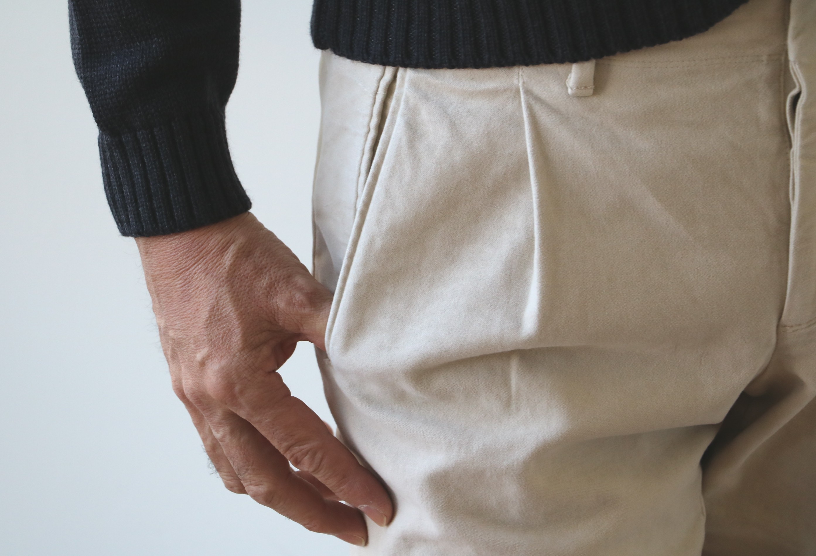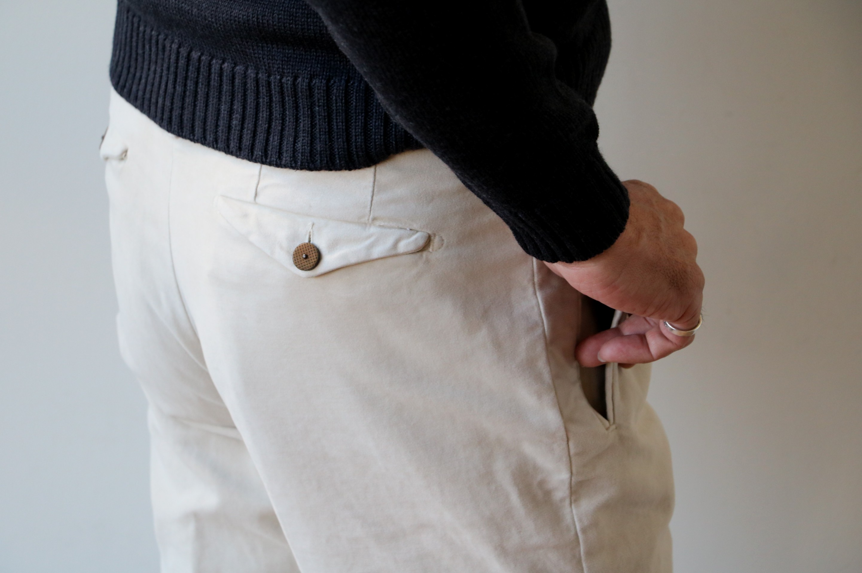 さらにベルトループを付けながらもウエストをゴムにしてしまう大胆さ。他にも、このパンツの魅力はあります。フロントのスライド釦留めやヒップのパッチポケットと留めの釦のデザインなど、イージーパンツといえども安易な作りをしない、【INCOTEX/インコテックス】の技術力の高さと着想のよさは、さすがと言えます。