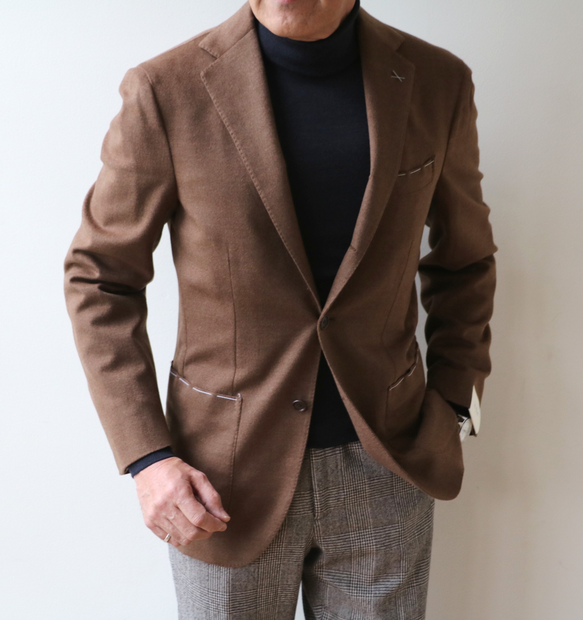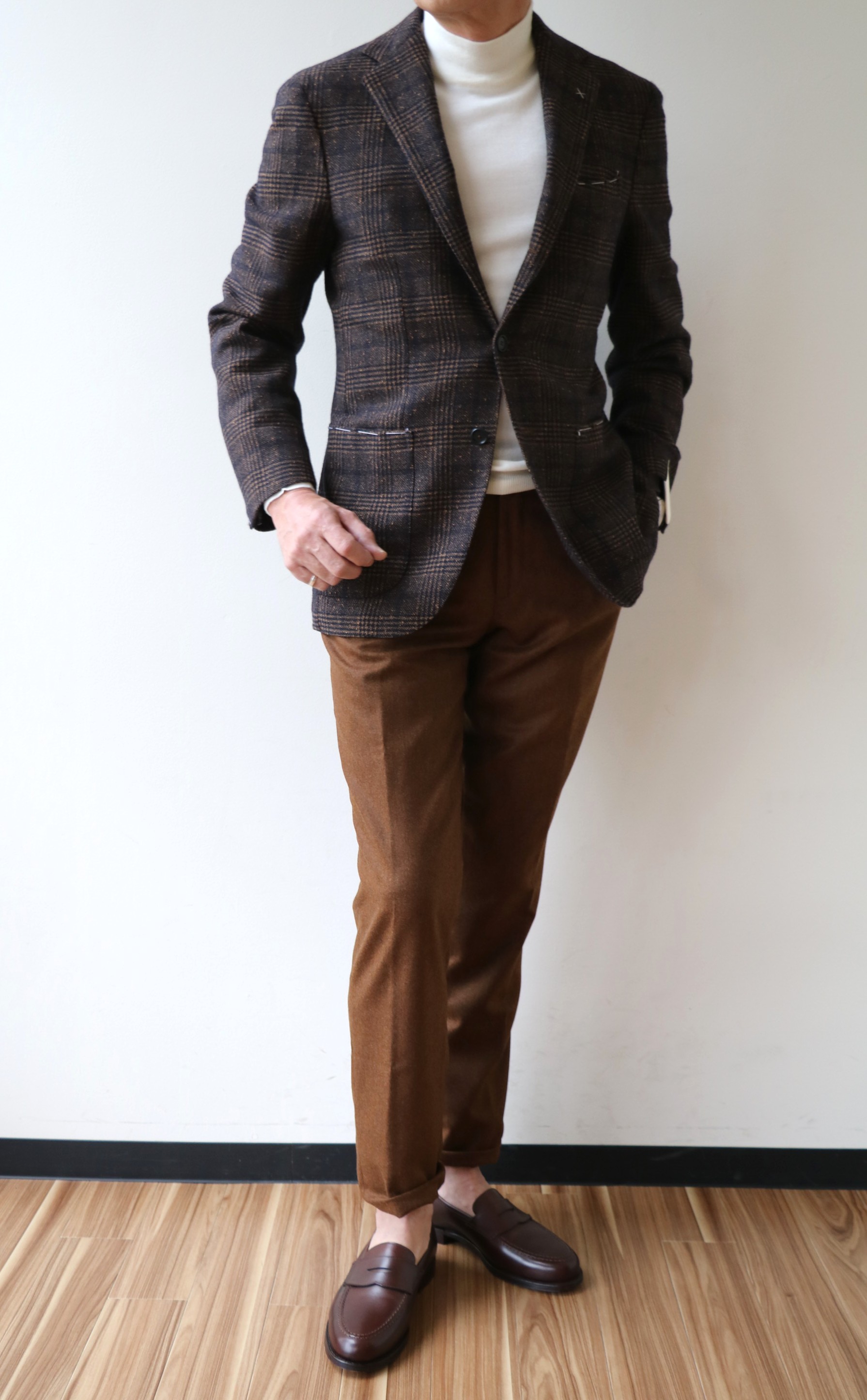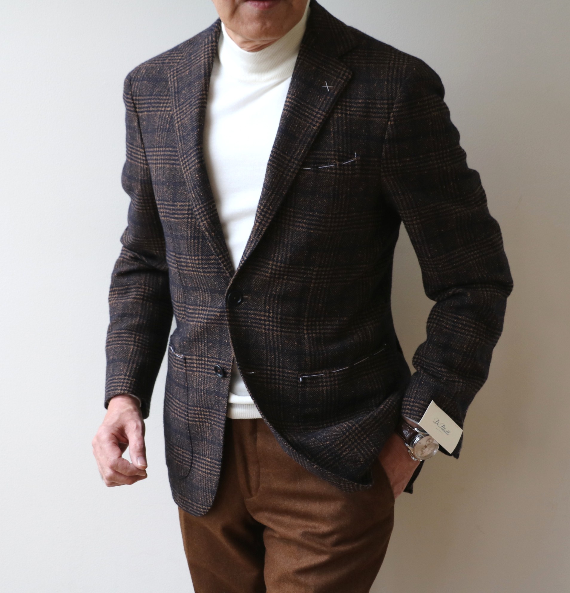 本日のテーマは、食べたいのに我慢している、大人の甘い装い。【De Petorilo/デ ペトリロ】のジャケットに【INCOTEX/インコテックス】のパンツを、インには、もちろん、ドルチェヴィータ(タートルネック)を合わせて、ご提案いたします。今回、ジャケットの着用サイズは、全て46となります。