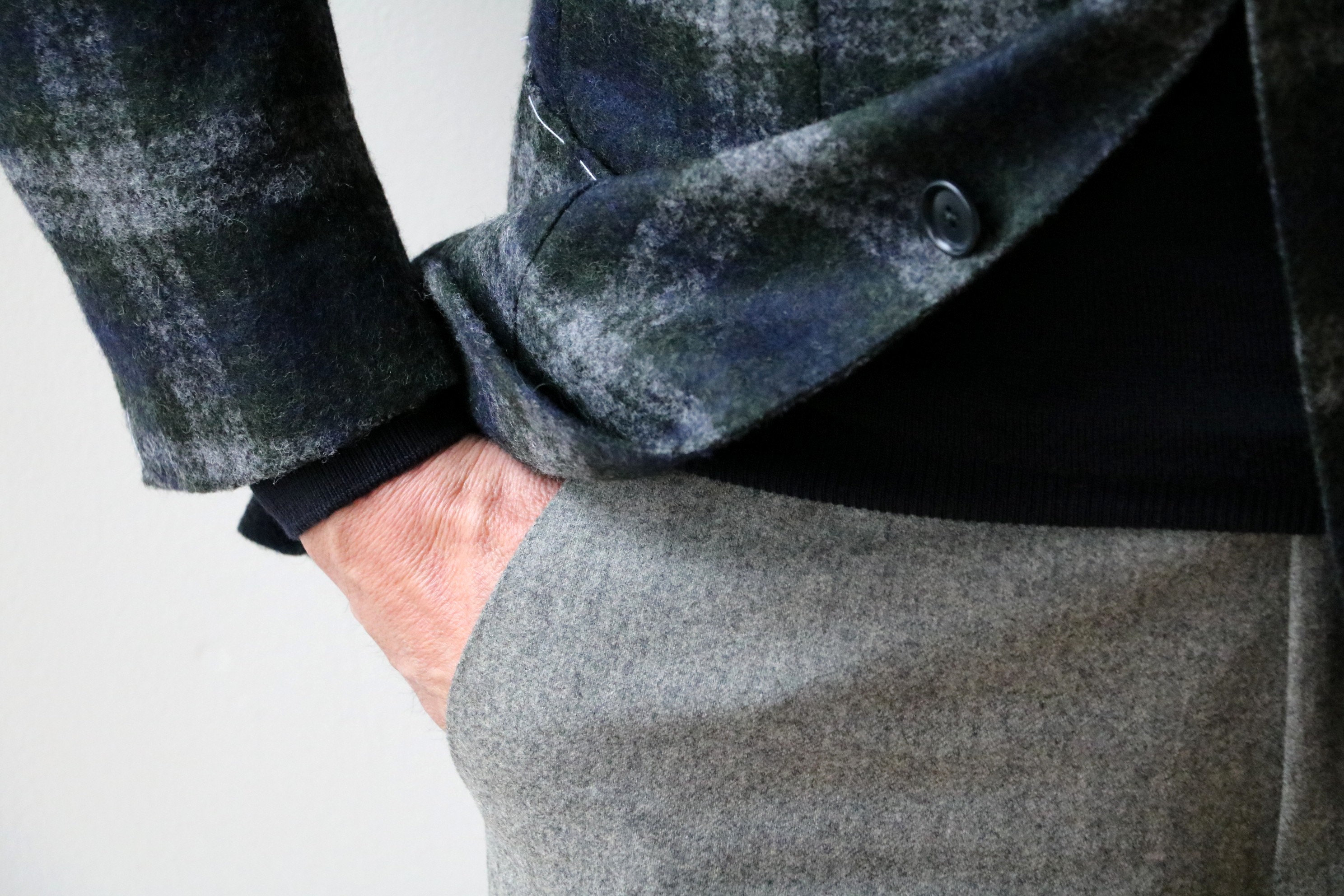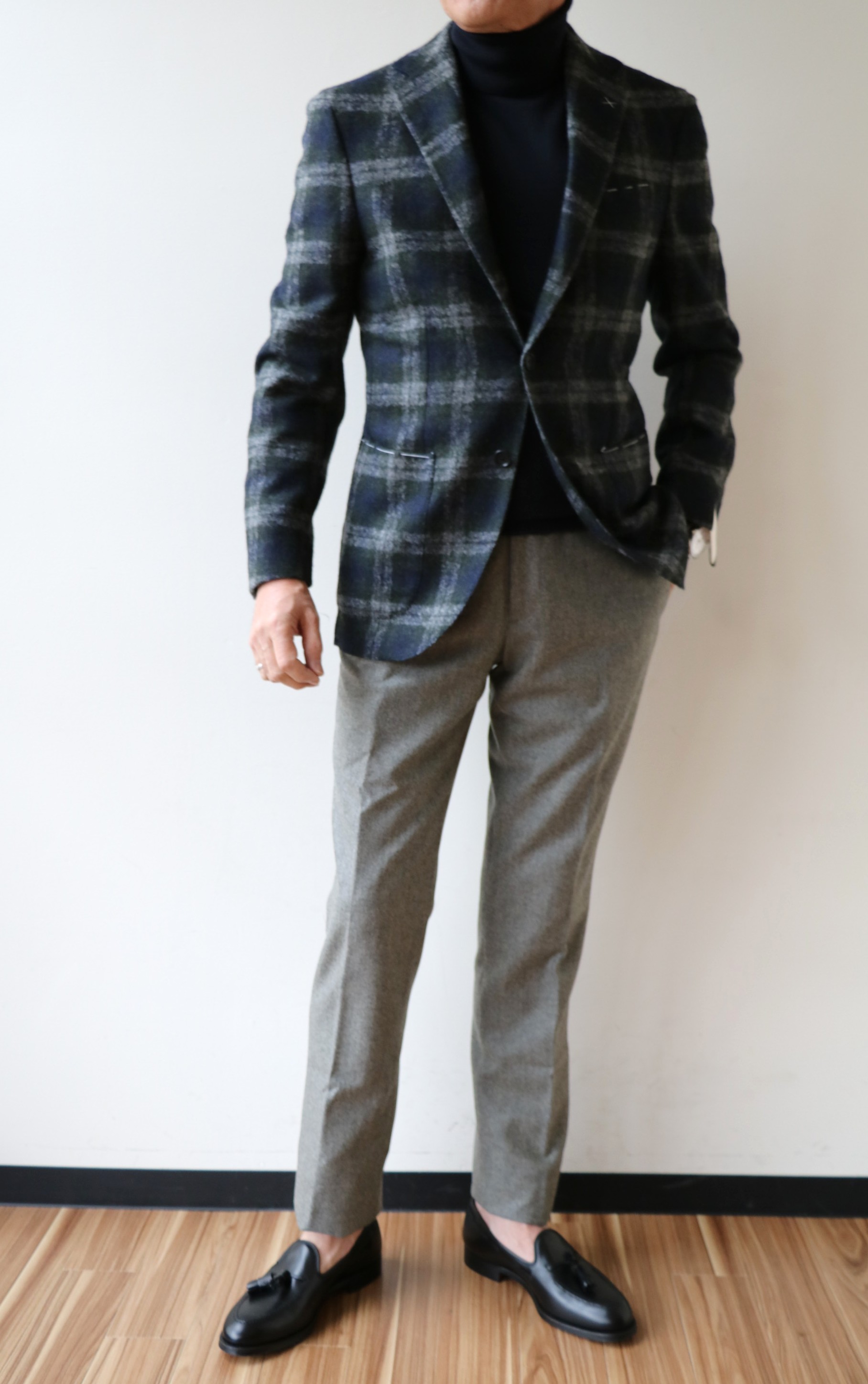 グリーンとネイビー、そしてライトグレイの3色で織り成す チェック柄ジャケット。見るからに甘いのは、アルパカをふんだんに使った「Ferla/フェルラ」の生地だからです。最高級の服地メーカーがある中、一風変わった表現力で、高い評価を得ているのが、イタリア・ビエッラ(ビエラ)にて1927年に創立した「Ferla/フェルラ」。甘さの表現力は、ピカイチです。