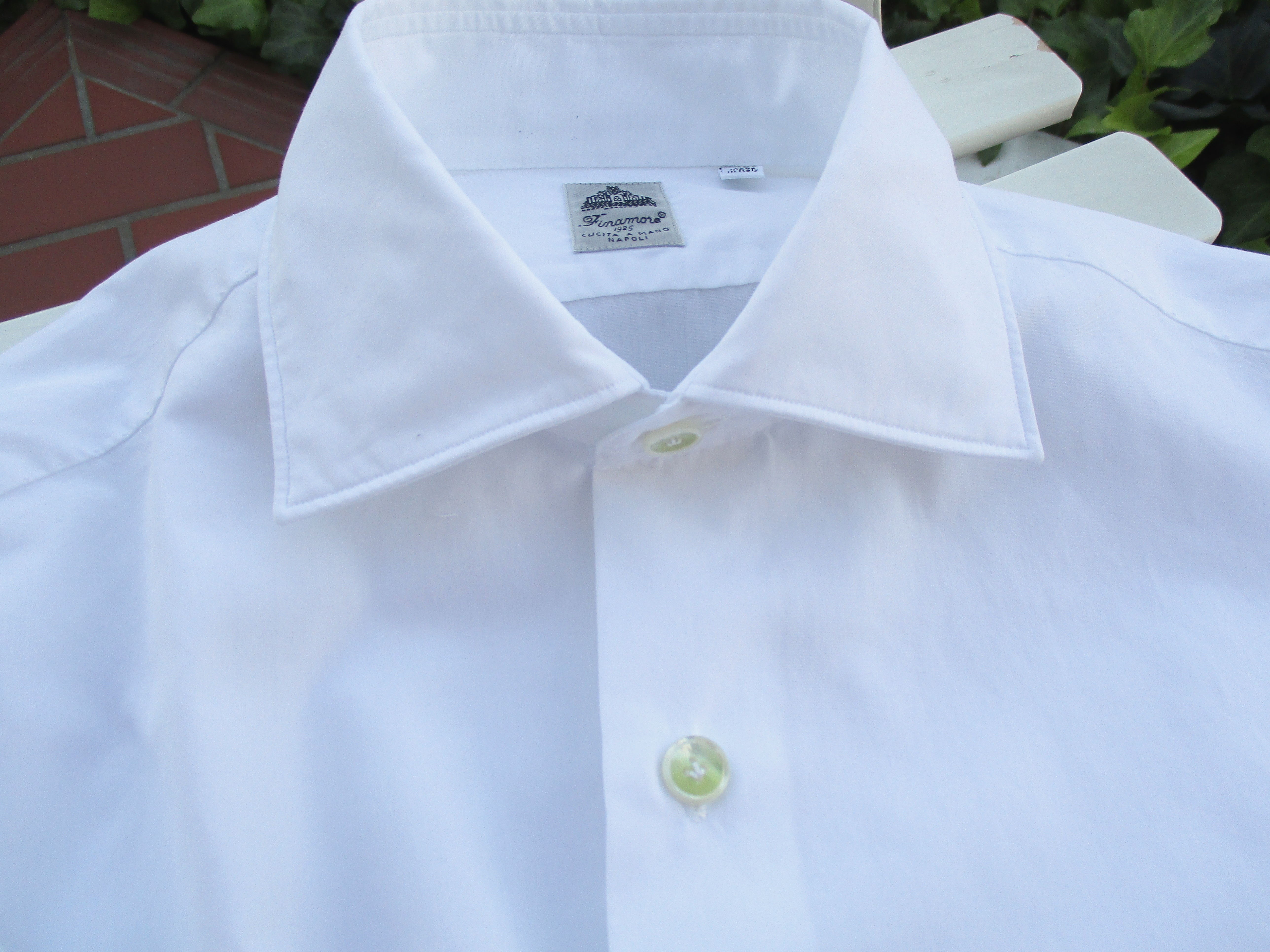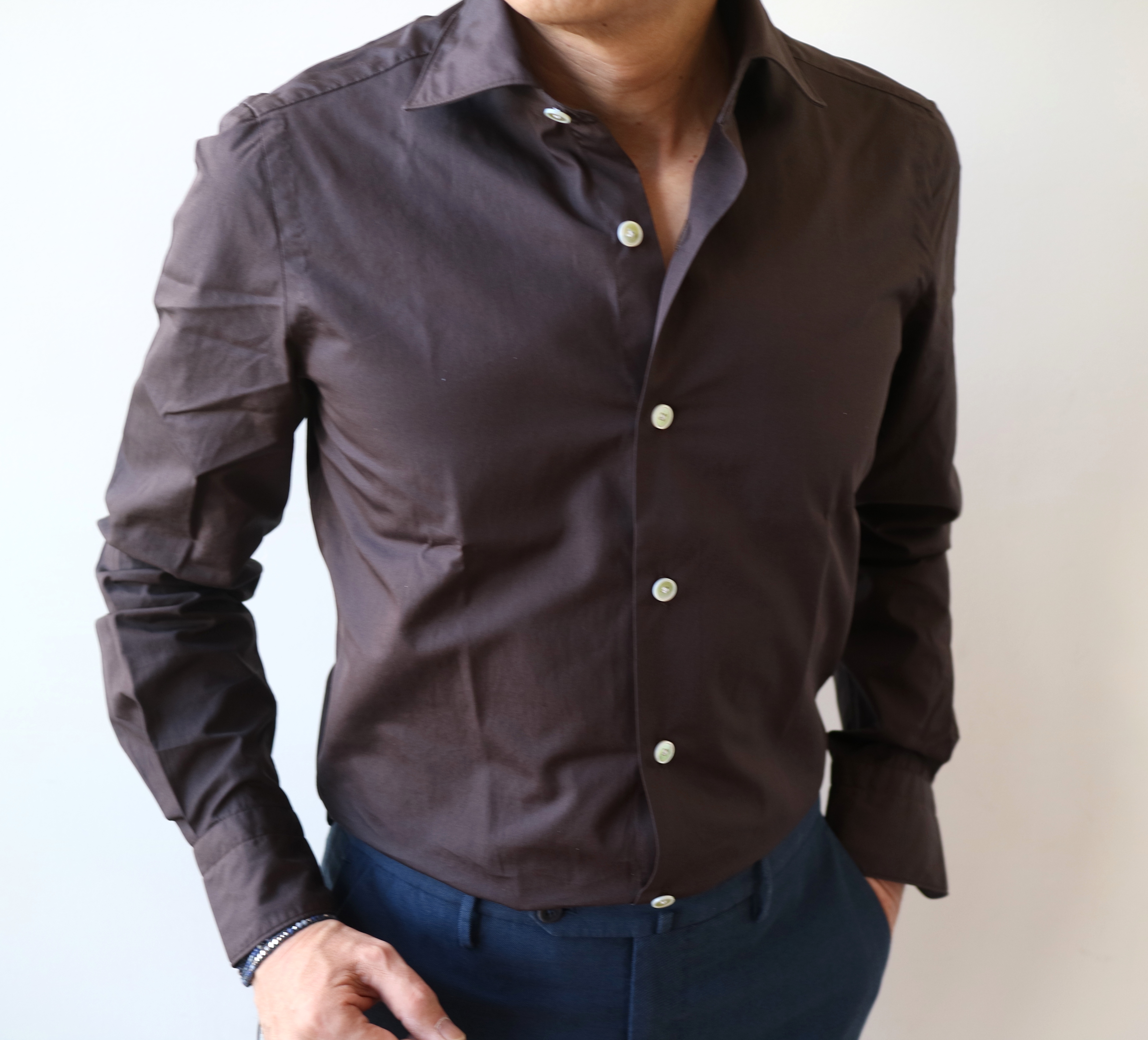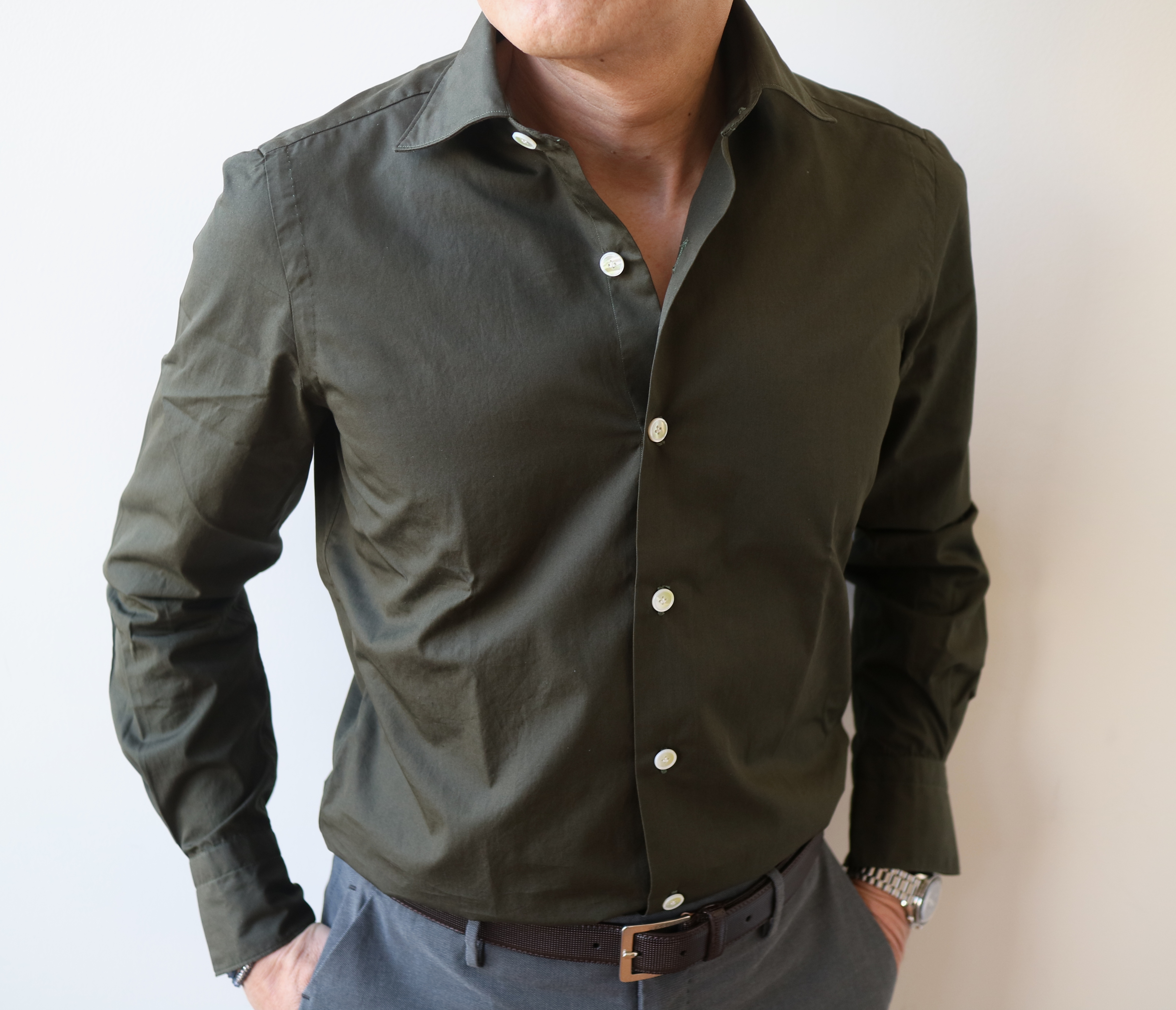 Finamore(フィナモレ)のシャツを合わせています。全身で見ていただくと、よりフォルムの美しさを分かっていただけるかと思います。