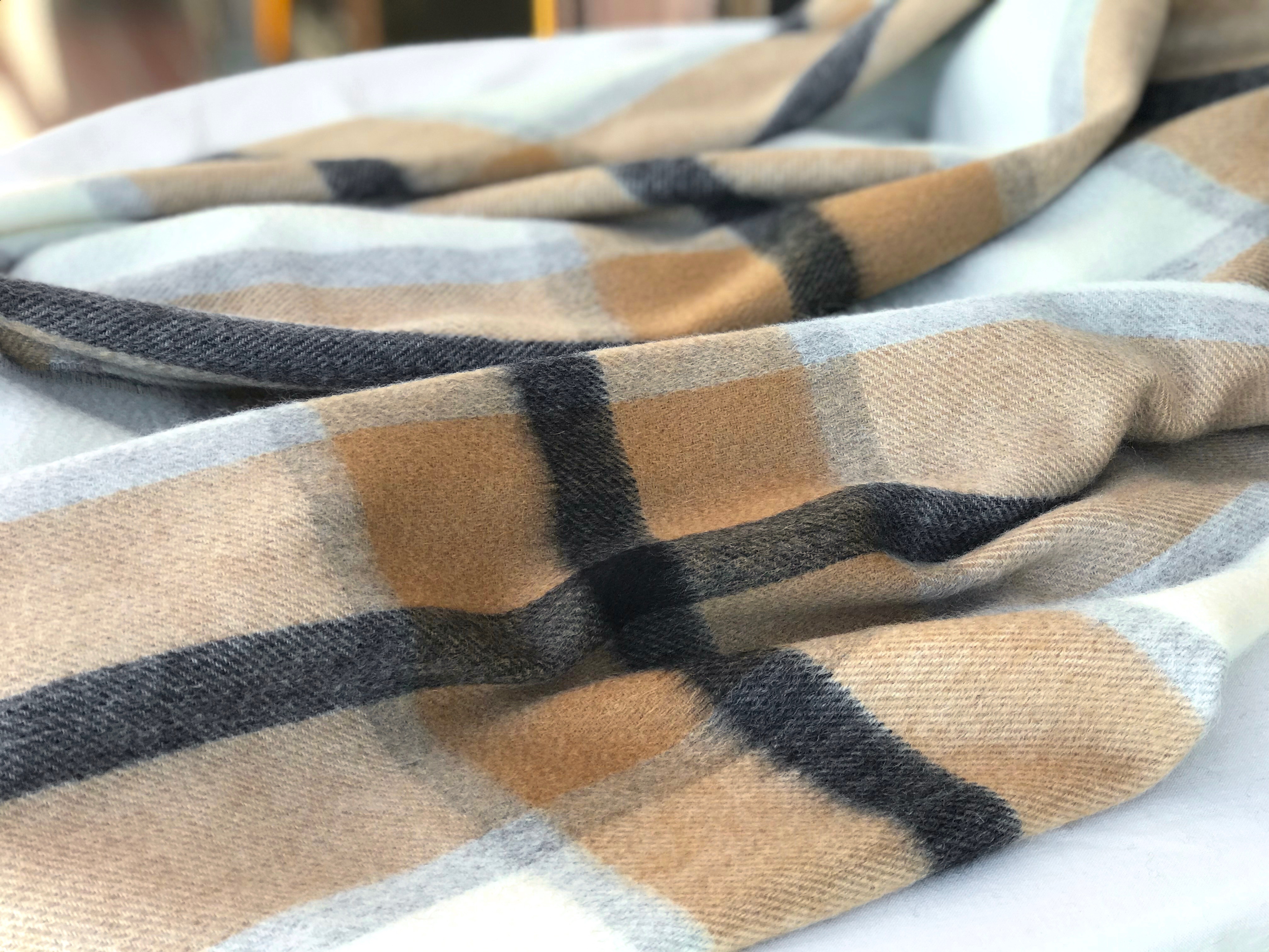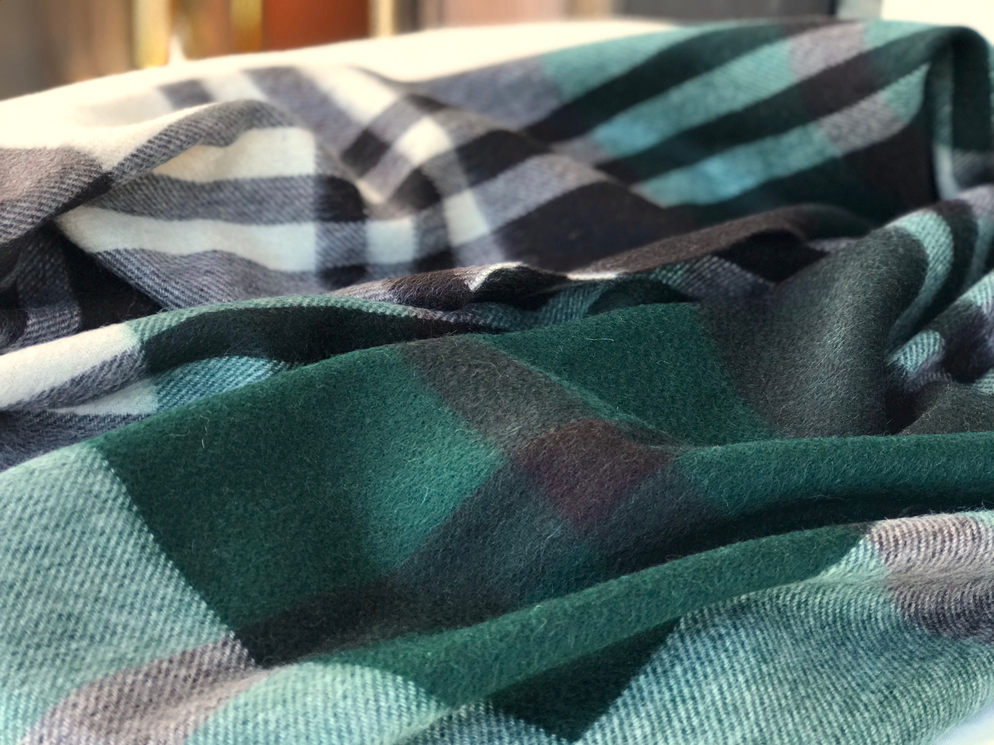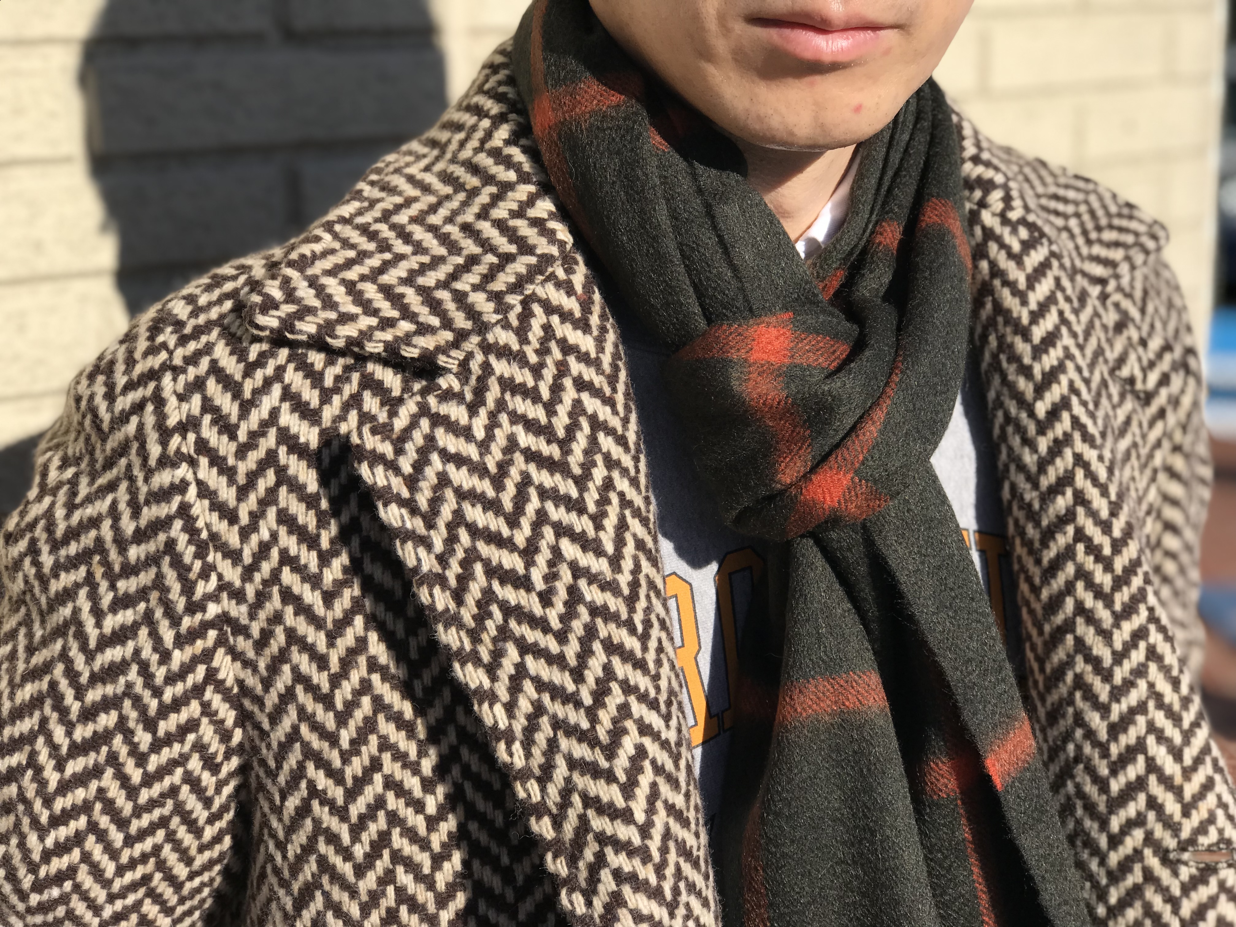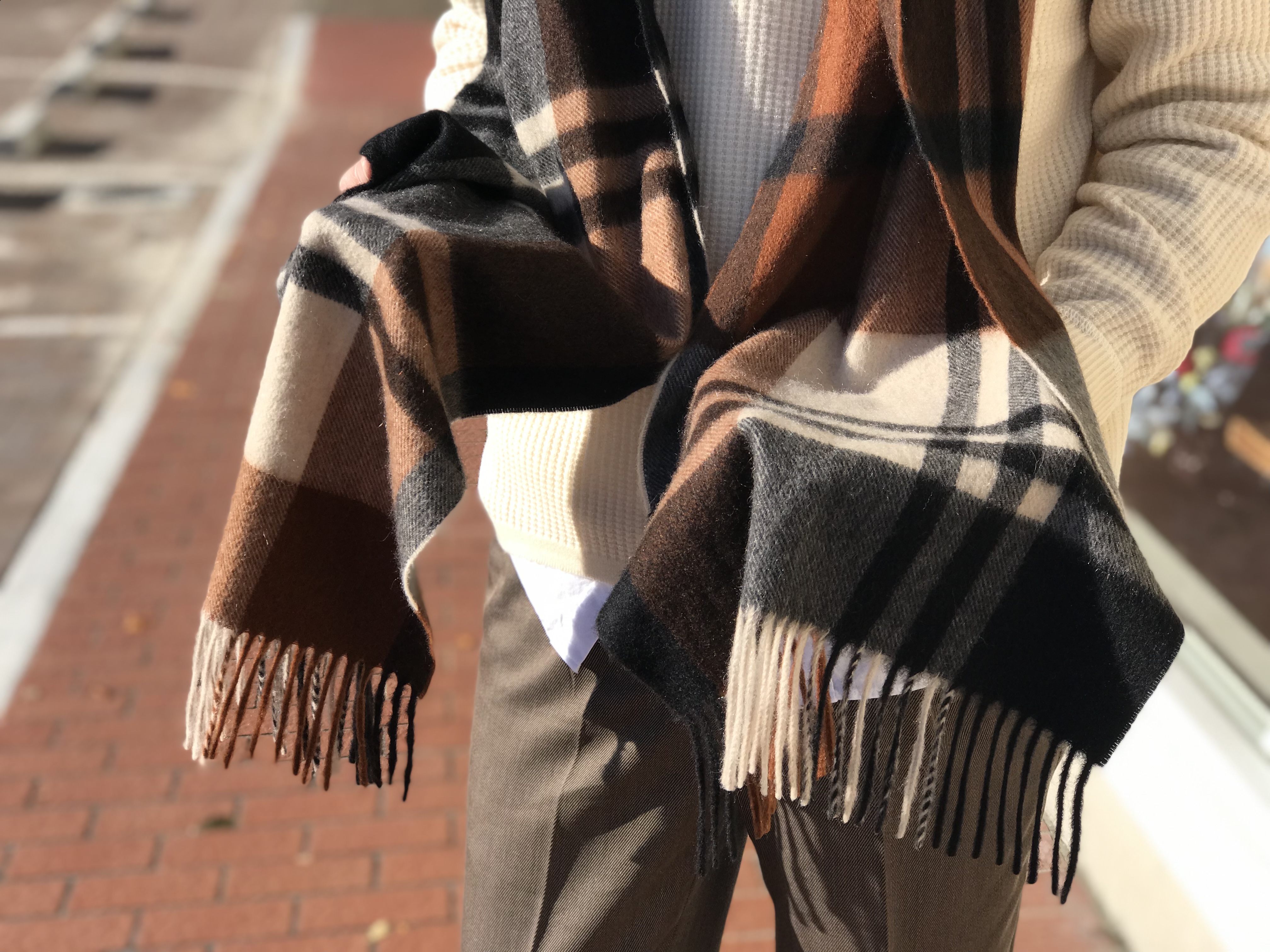 サイズは50×180cmで、フリンジが短くカットされた中判のストールタイプと言ったほうが良いでしょうか。セレクトは、モノクロ×パープルのプリンスオブウェールズ柄とブラウンチェック柄の2型です。