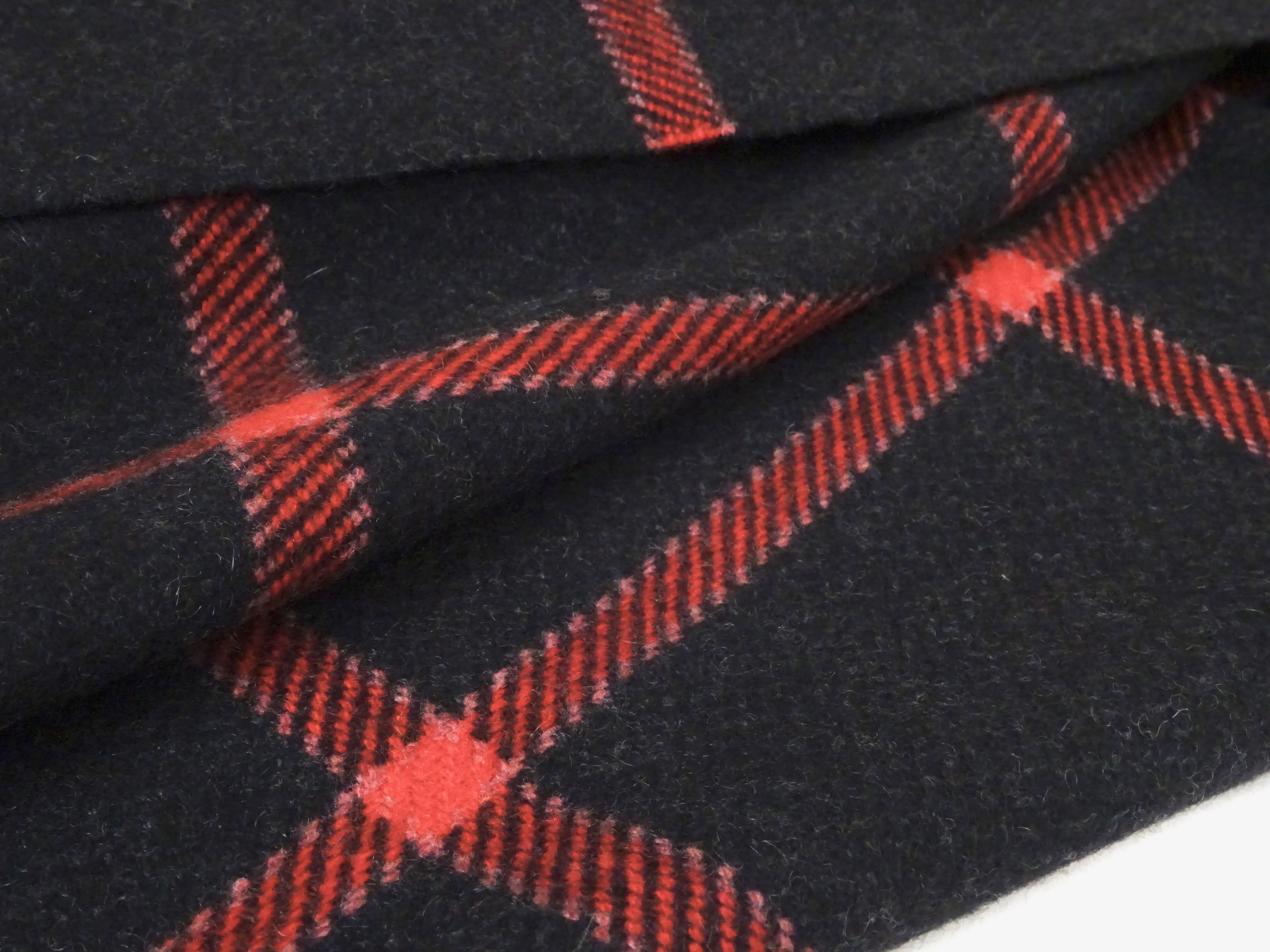 35×190cmマフラーの最後は、ブラックとグレイのチェックに、レッドのオーバーペンを挿したマルチチェック柄です。