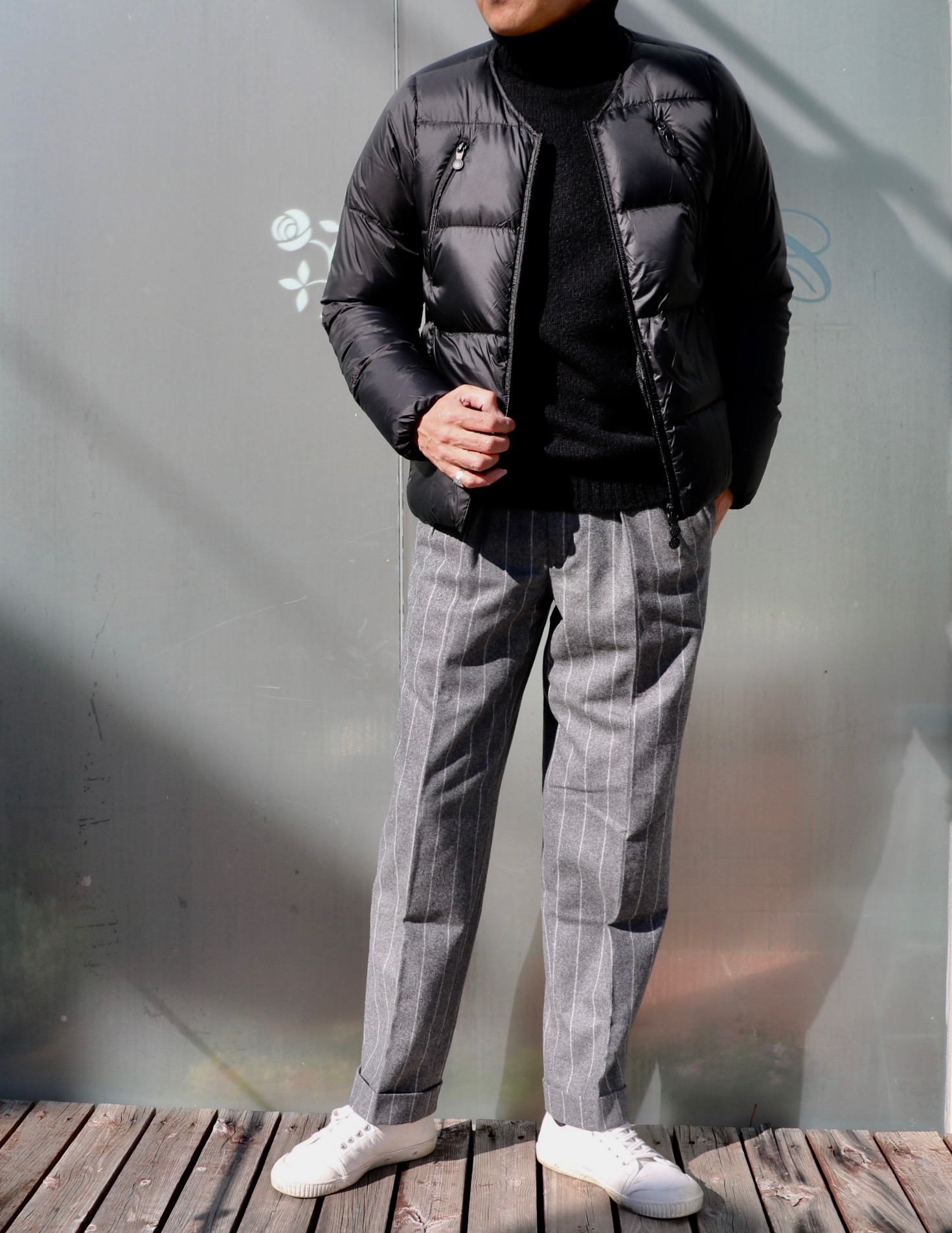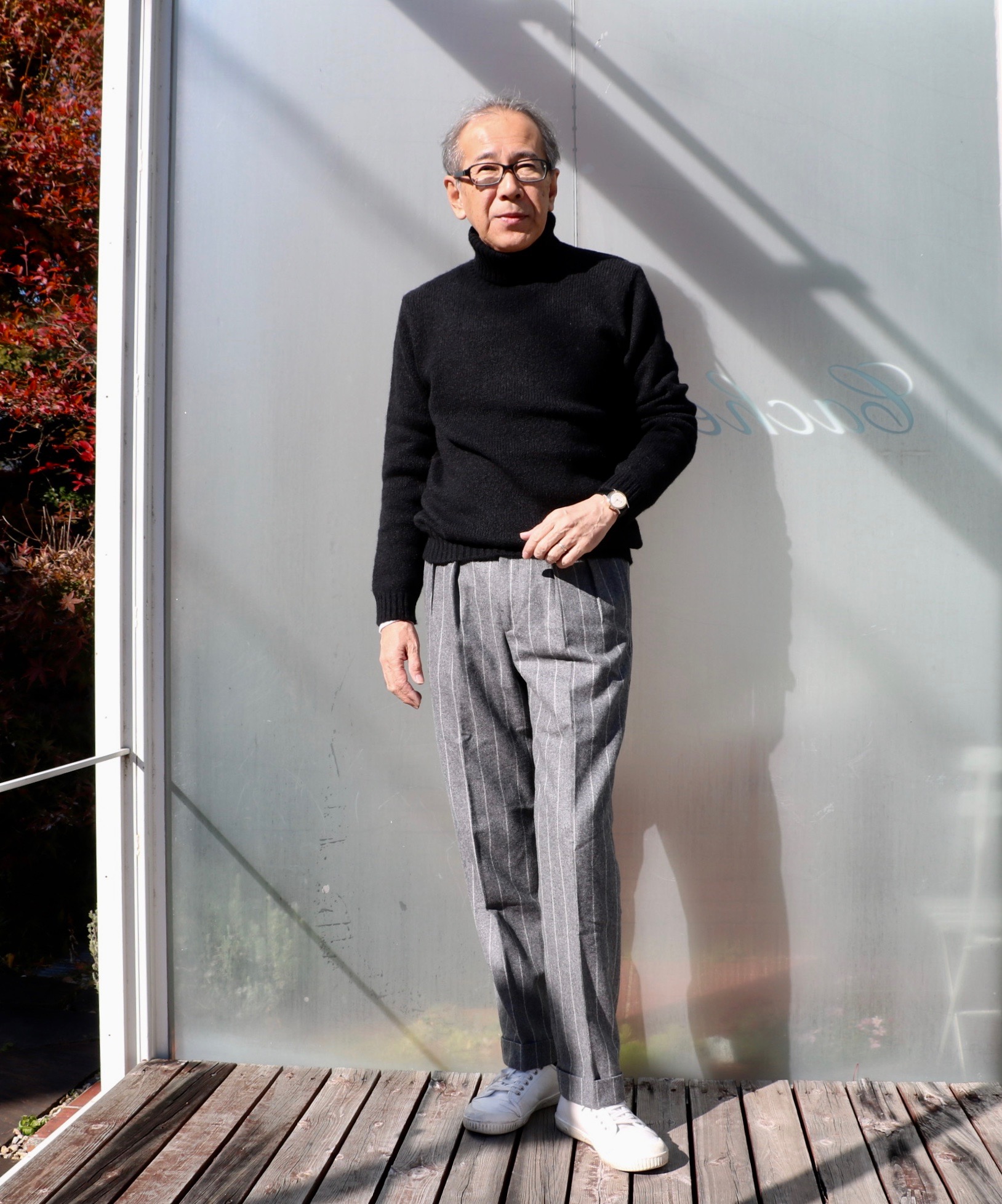 昨日、あまりにも寒かったので、やや厚着の本日の出で立ち。この上にレザージャケットを羽織って出勤です。とにかく軽くて暖かい。それでいて存在感も示さなければいけないのが、服飾に携わる業界人の辛いところなんて、出かけにカミさんにチェックしてもらいながら、「O.K.」をもらったのが、PHIL PETTER(フィルペター)の黒ニットにBERNARD ZINS(ベルナールザンス)のチョークストライプのフランネルパンツ。足元は相変わらずSPRING COURT(スプリングコート)と代わり映えはしません。そろそろ、SUPERGA(スペルガ)に浮気しようかと、心惹かれている私ですが...