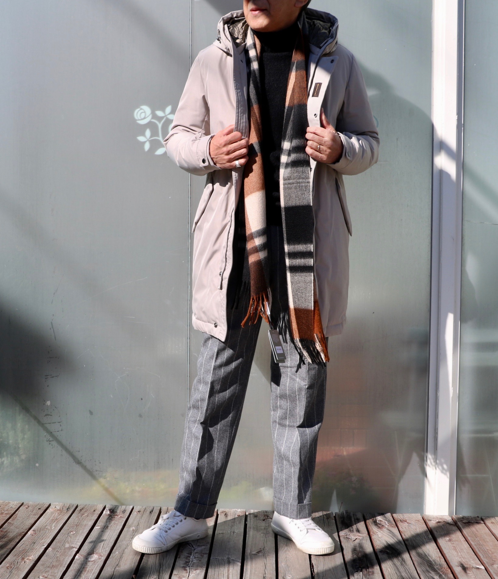インに着ているのが、FRED PERRY/フレッドペリーのタートルネック。白のスニーカーと同色の月桂樹がよく合うんです。それにウール・コットンと素材の気楽さ。ちょっぴり若者気取りのオヤジが、さらりと取り入れるワンポイントとして、いかがでしょうか。春まで着用可能なアイテムは今揃えておきたいものです。サイズSを着用しております。
