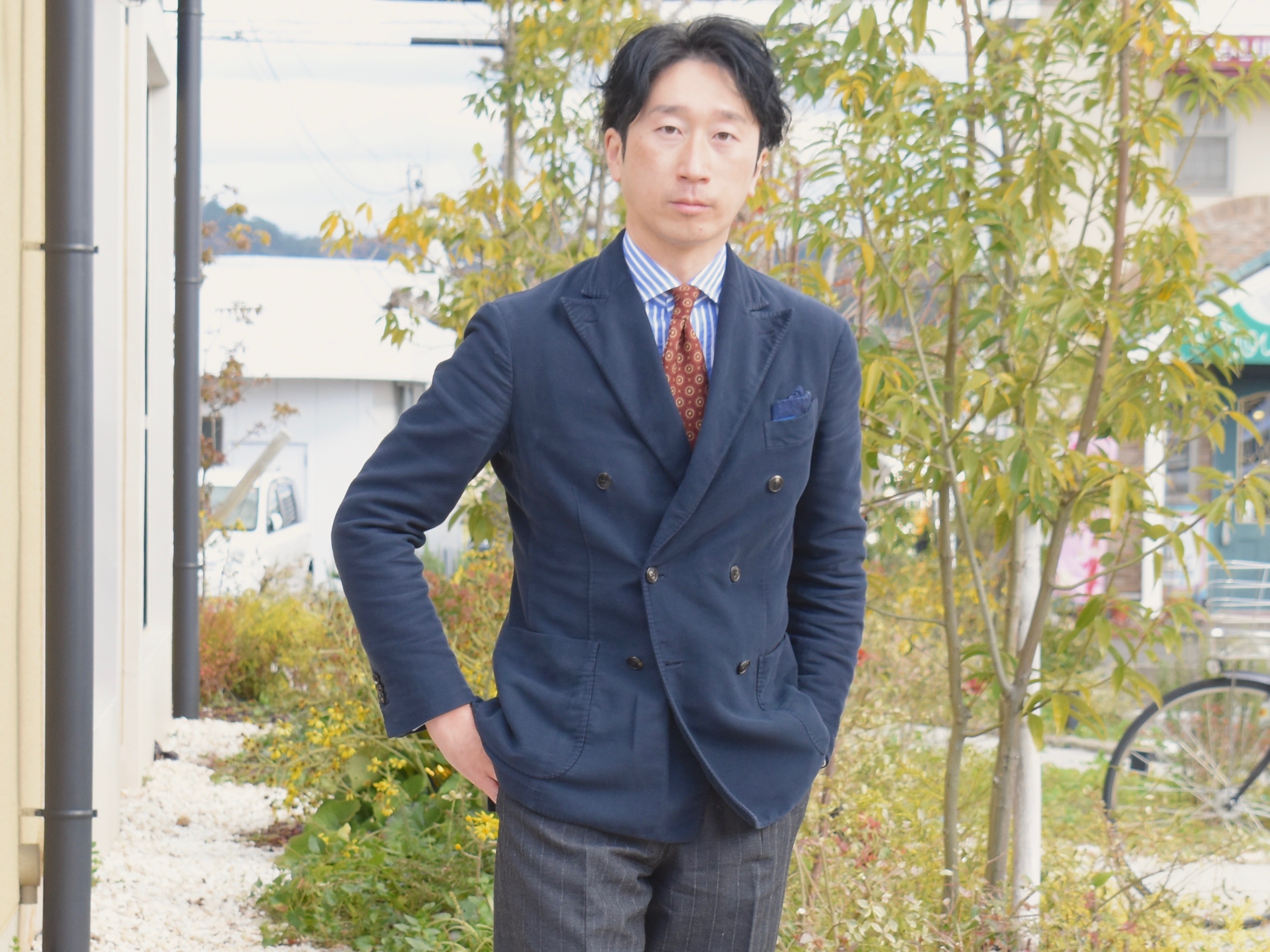 そして、写真のジャケットにご注目ください。ラルディーニのオーダー数がピークを迎えていた頃、双璧ブランドとして横に並んでいたのが、BOGLIOLI(ボリオリ)でした。TAGLIATORE(タリアトーレ)ではないの?とおっしゃられる方も。いや、タリアトーレは、この二つのブランドと比べれば、ここ最近と歴史は浅いのです。ボリオリの創業は1890年代と100年以上も続きます。ジーンズを穿かない人まで巻き込んで、ジャケットに似合うデニム旋風を巻き起こしたのが、JACOB COHEN(ヤコブ・コーエン)とすれば、ジャケットの立役者がBOGLIOLI(ボリオリ)。副資材を極力省いたアンコンジャケット「DOVER」の功績は大きく、服好きの休日の出かけ着として魅了したことは、まだまだ記憶に新しいことです。またコットン素材にガーメントダイ(製品染め&洗い)加工をかけた「COAT」。極めつけは、贅沢なカシミア素材のジャケットにガーメントダイ加工を施した「K.JACKET」など、ジャケットに革命を起こしたと言っても過言ではありません。私スグルのクローゼットにあるジャケットの大半がボリオリなんです。そんなボリオリに魅了されているのは、私だけではないようです。タカイも本日、ボリオリ。マスヤマも初めてボリオリのジャケットに手を通しております。ここからは、彼らがボリオリの魅力について語ります。