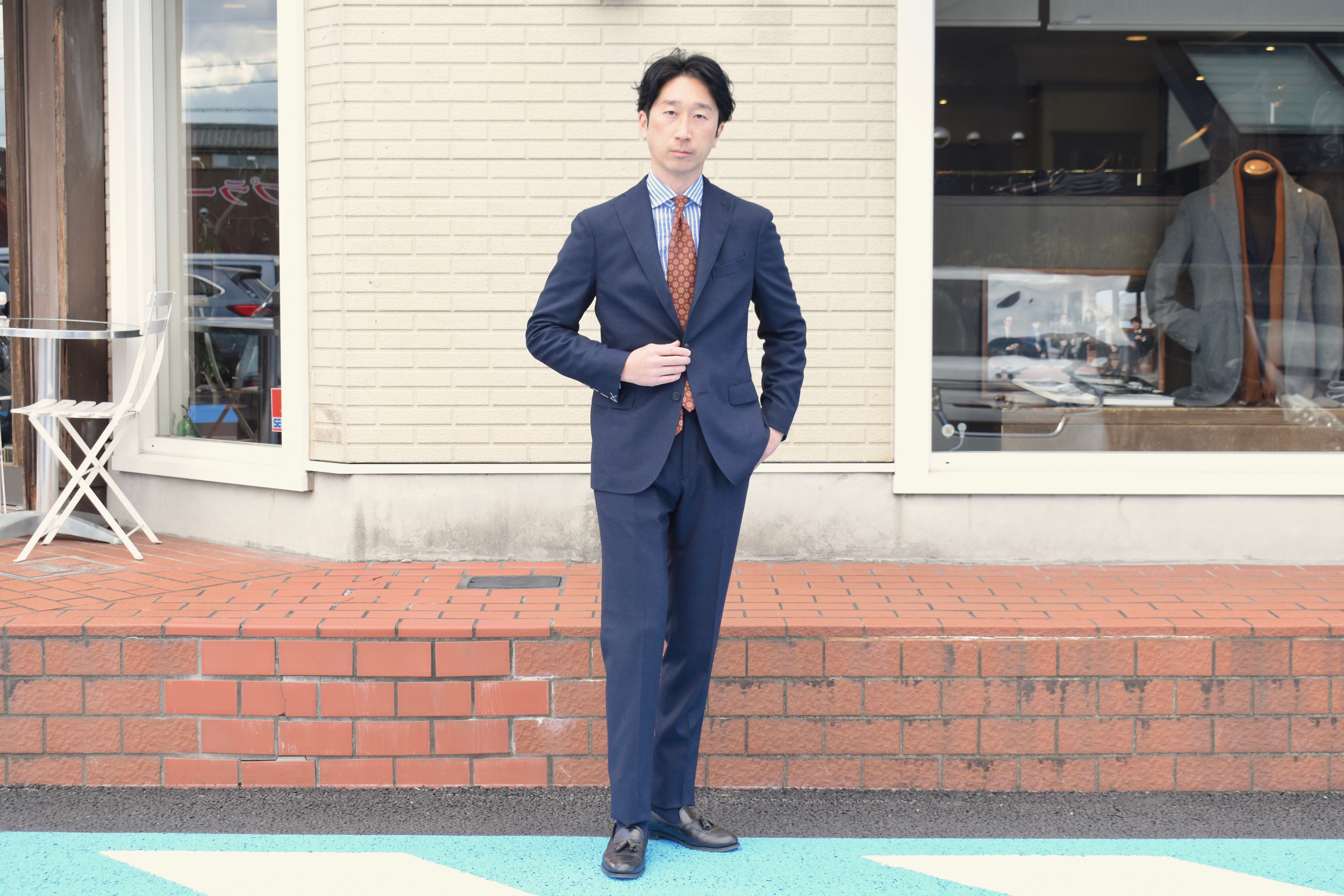 そして、現在ではミラノに拠点を移し、モダンな顔付きを見せる【BOGLIOLI/ボリオリ】。このスーツでは、パンツをノープリーツでセレクト。都会的な一面を見せるのも魅力の一つです。