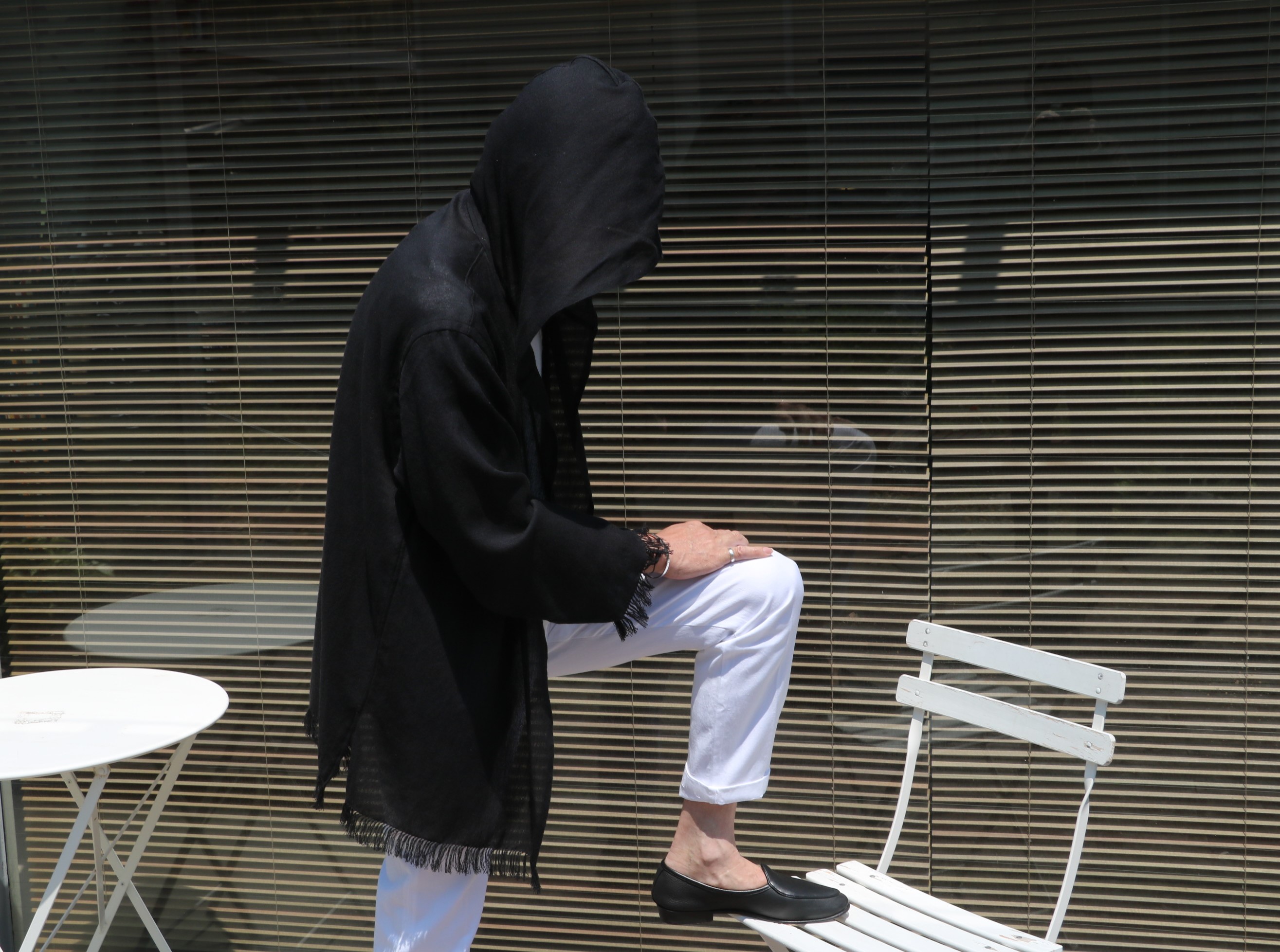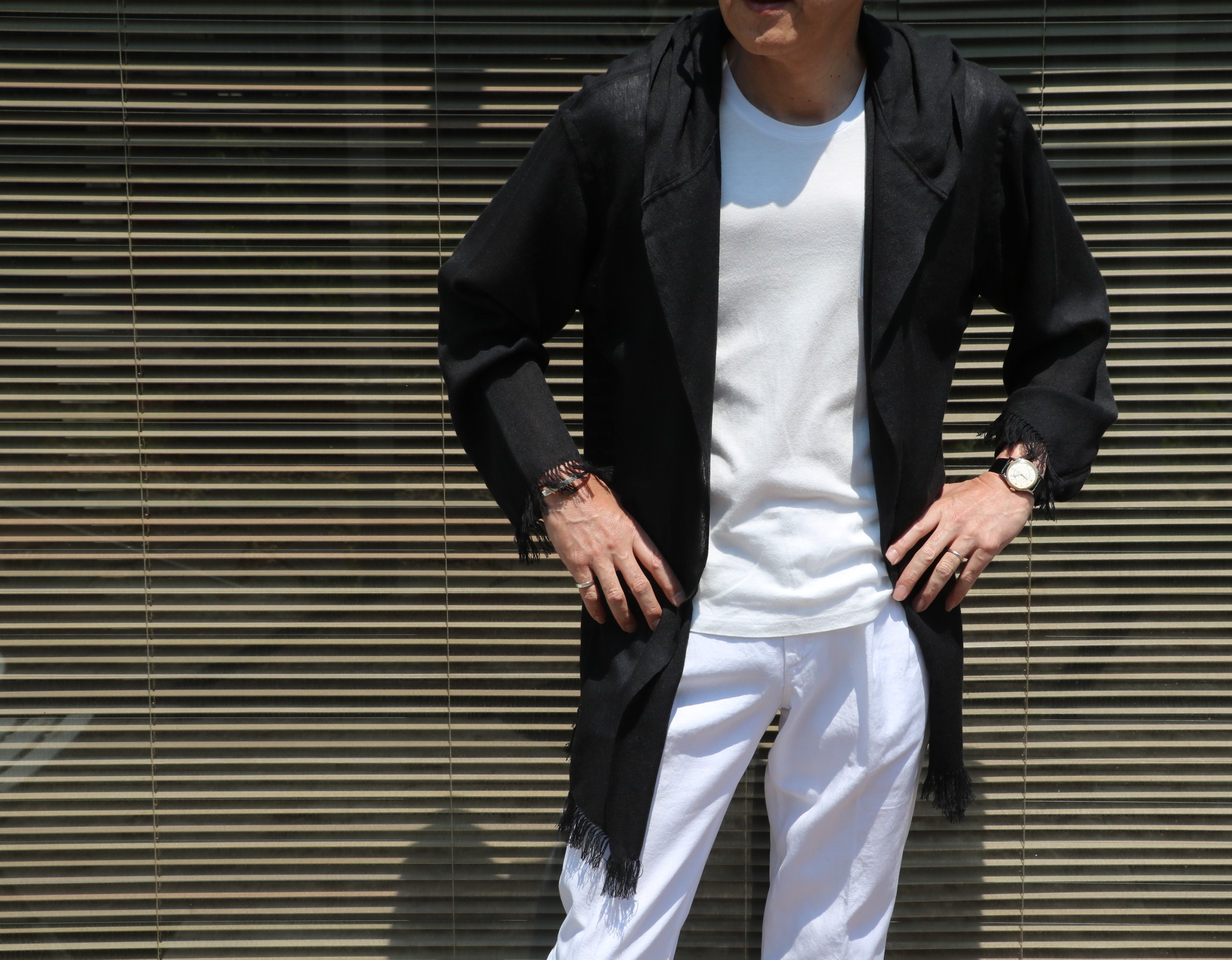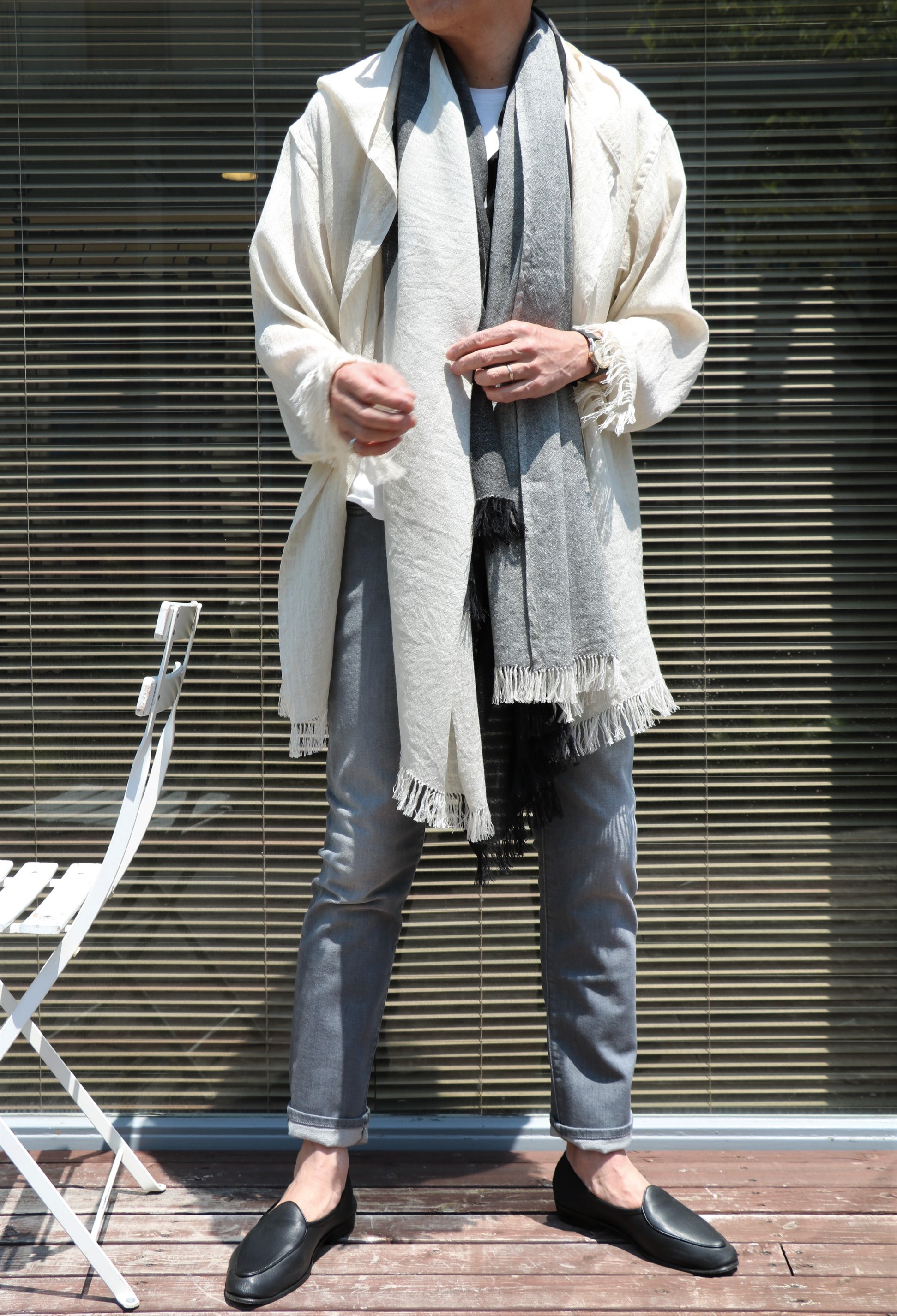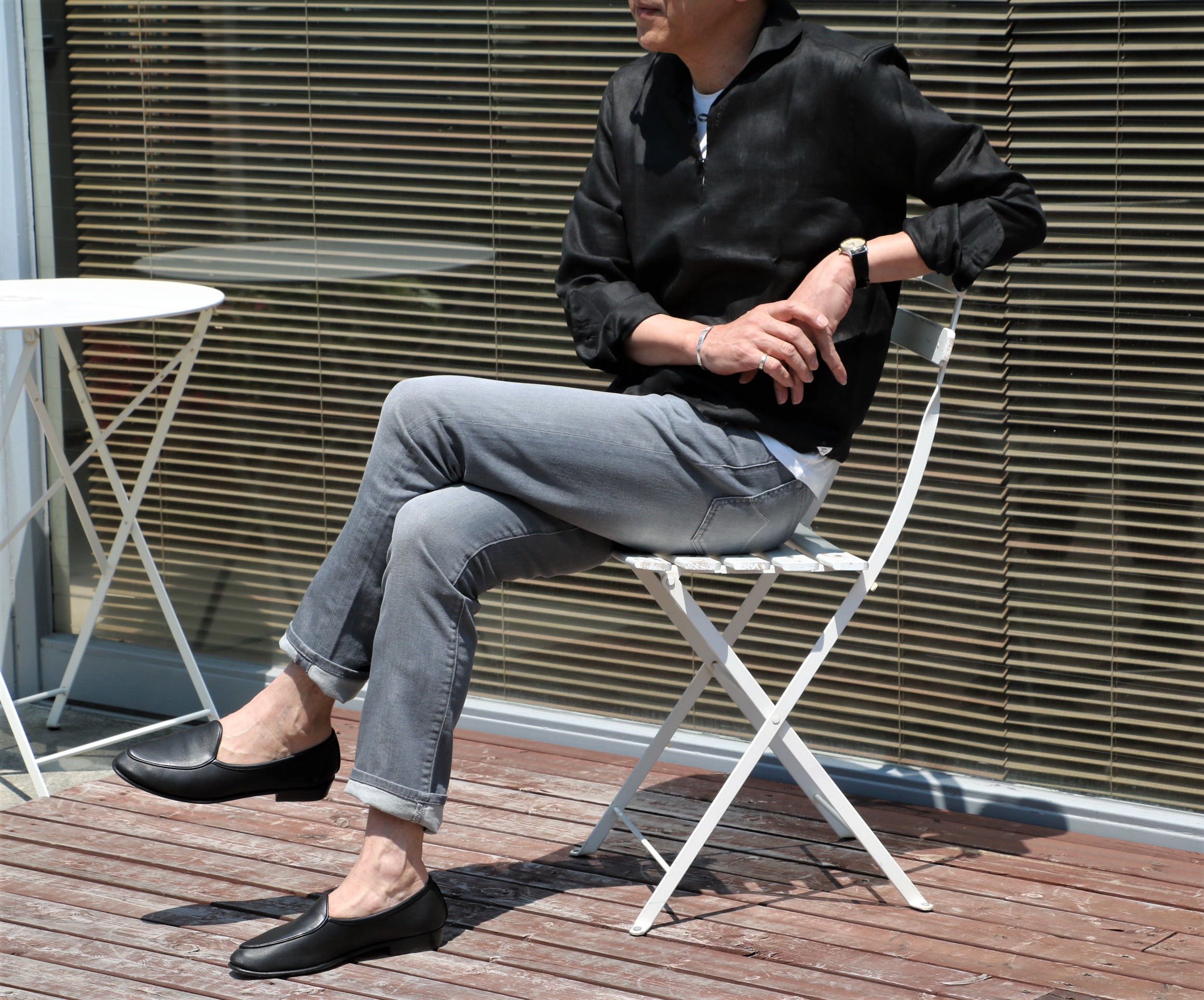 オフホワイトで合わせたパンツはJACOB COHEN(ヤコブ コーエン)、ブラックはC+Plus/チー(シー)プラス。インのTシャツは私物のmey story(マイストーリー)、靴も私物のBAUDOIN&LANGE/ボードイン アンド ランジです。
