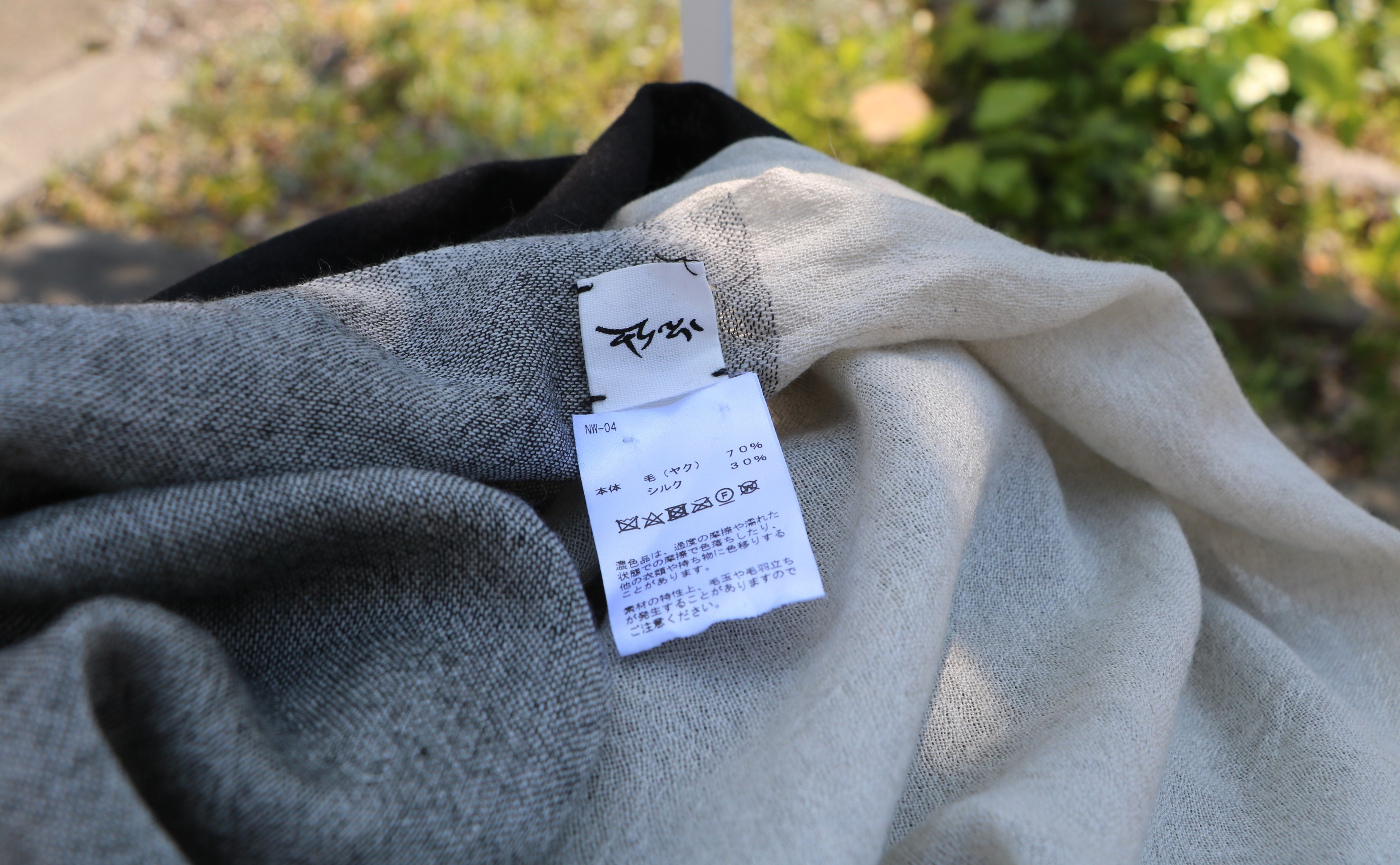 ヤク・シルクの大判ストールは、4配色のブロック柄。フーデットカーディガンと同じナチュラルホワイトとブラックの他、杢調のグレイの濃淡カラーで構成されています。
