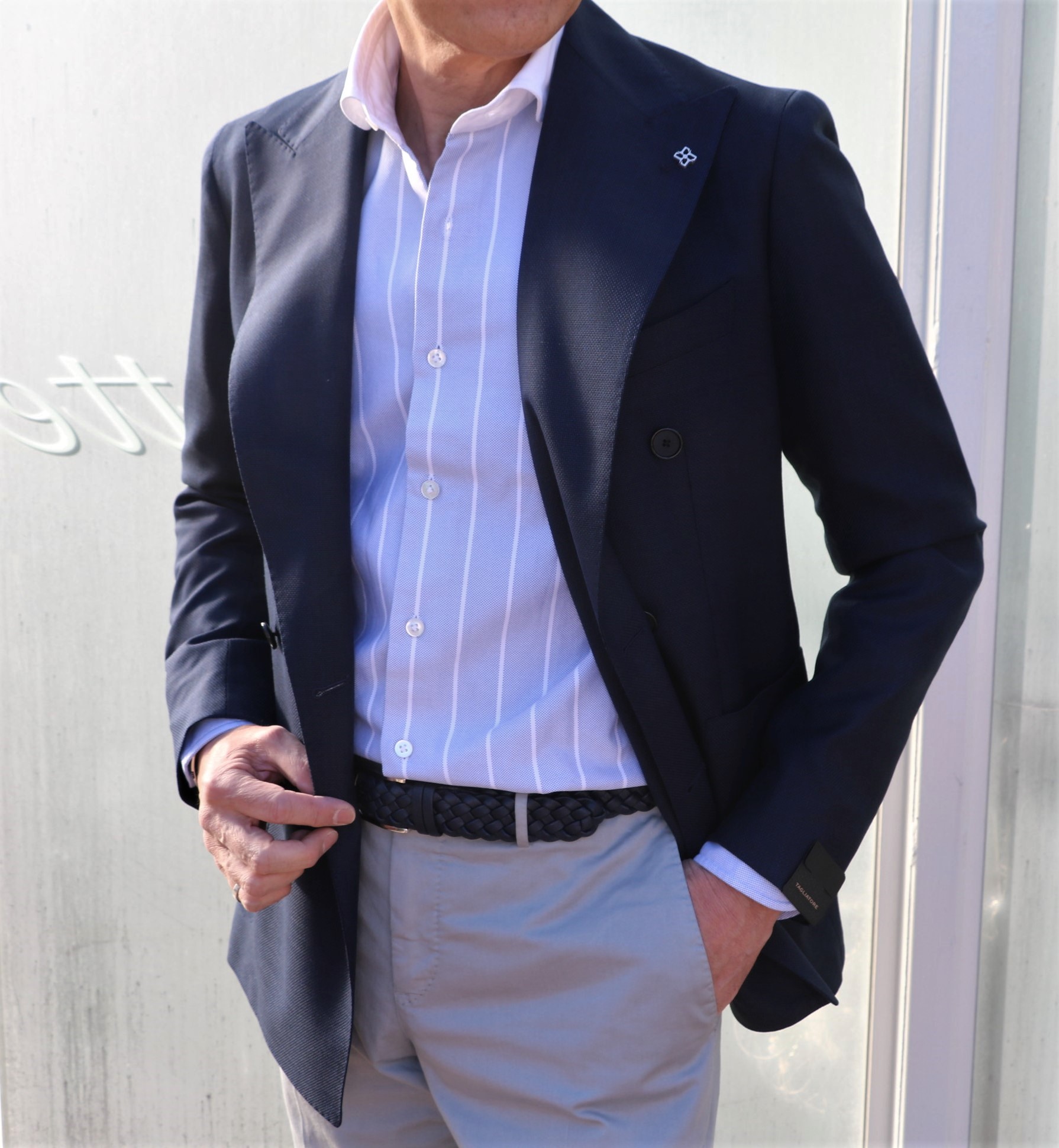 雰囲気は、がらりと英国調に変わります。ジャケットもTAGLIATORE(タリアトーレ)のダブルブレストを選び、皆様の食指を動かせたい...たぶん、好きな方には刺さるシャツではないでしょうか。私のように...
