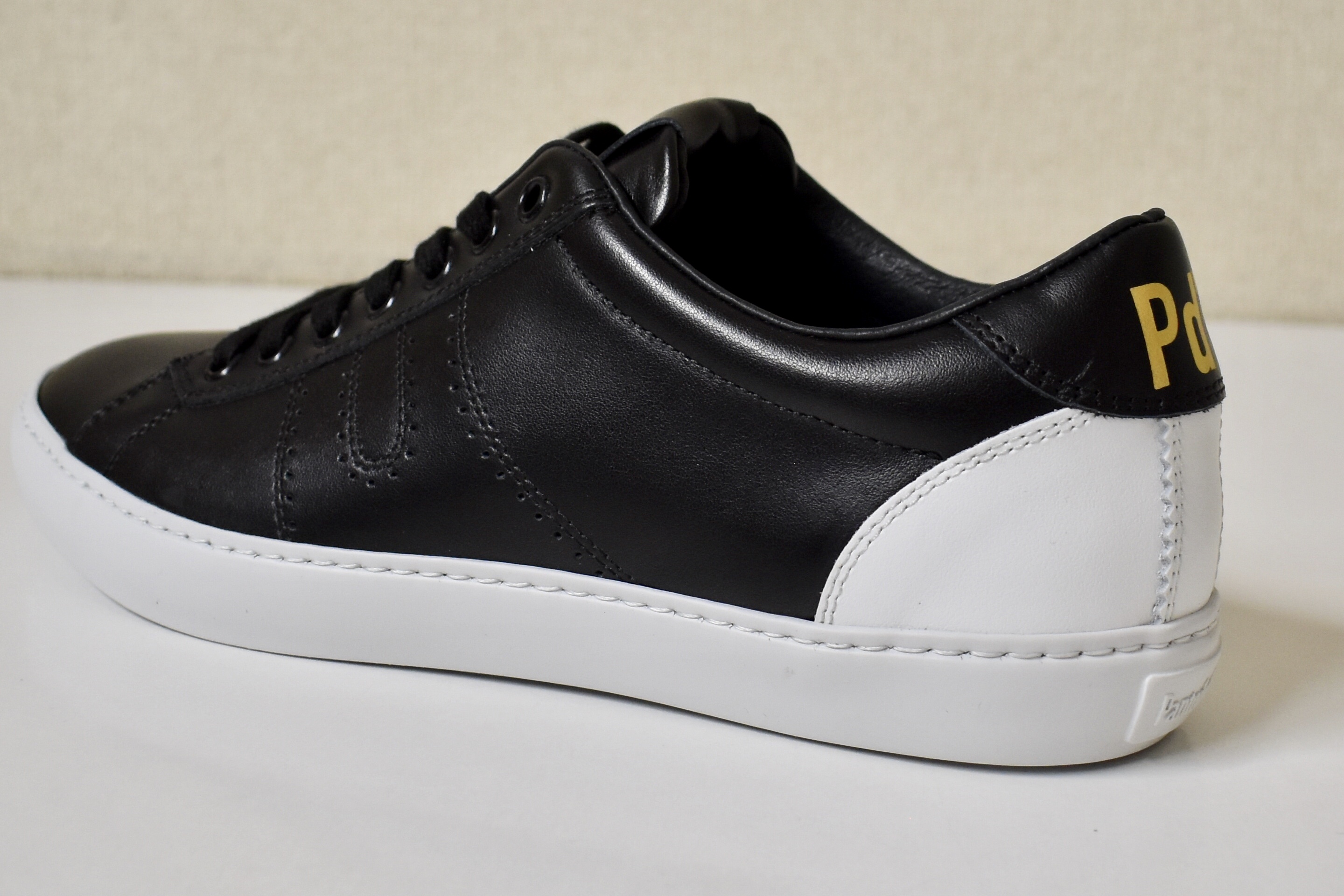 一転、カーフレザーのブラックスニーカーです。つるっとした質感や光沢感は、先のスエードと対照的です。