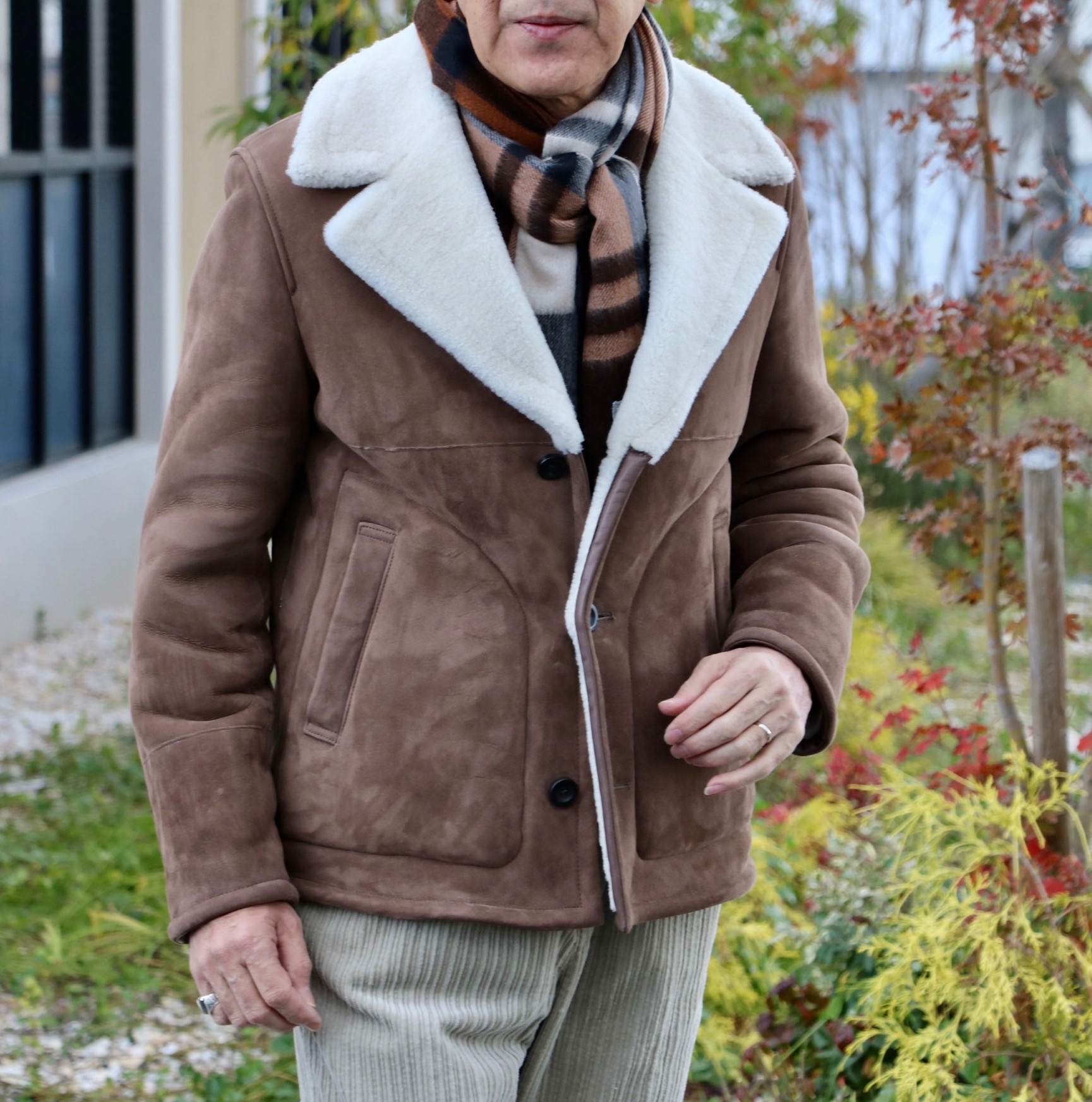 身長175cm、体重64kg、胸囲92cmの私で、サイズ46を着用しております。ナポリテーラーを熟知している方が関わっているのがよく分かる立体感のあるムートンジャケット。少し長めの着丈も特徴で、プリーツ入りの腰回りにゆとりのあるパンツにもバランスよく収まるはずです。スポーティーさよりエレガントさに重きを置いたB-3タイプと言えるでしょうか。