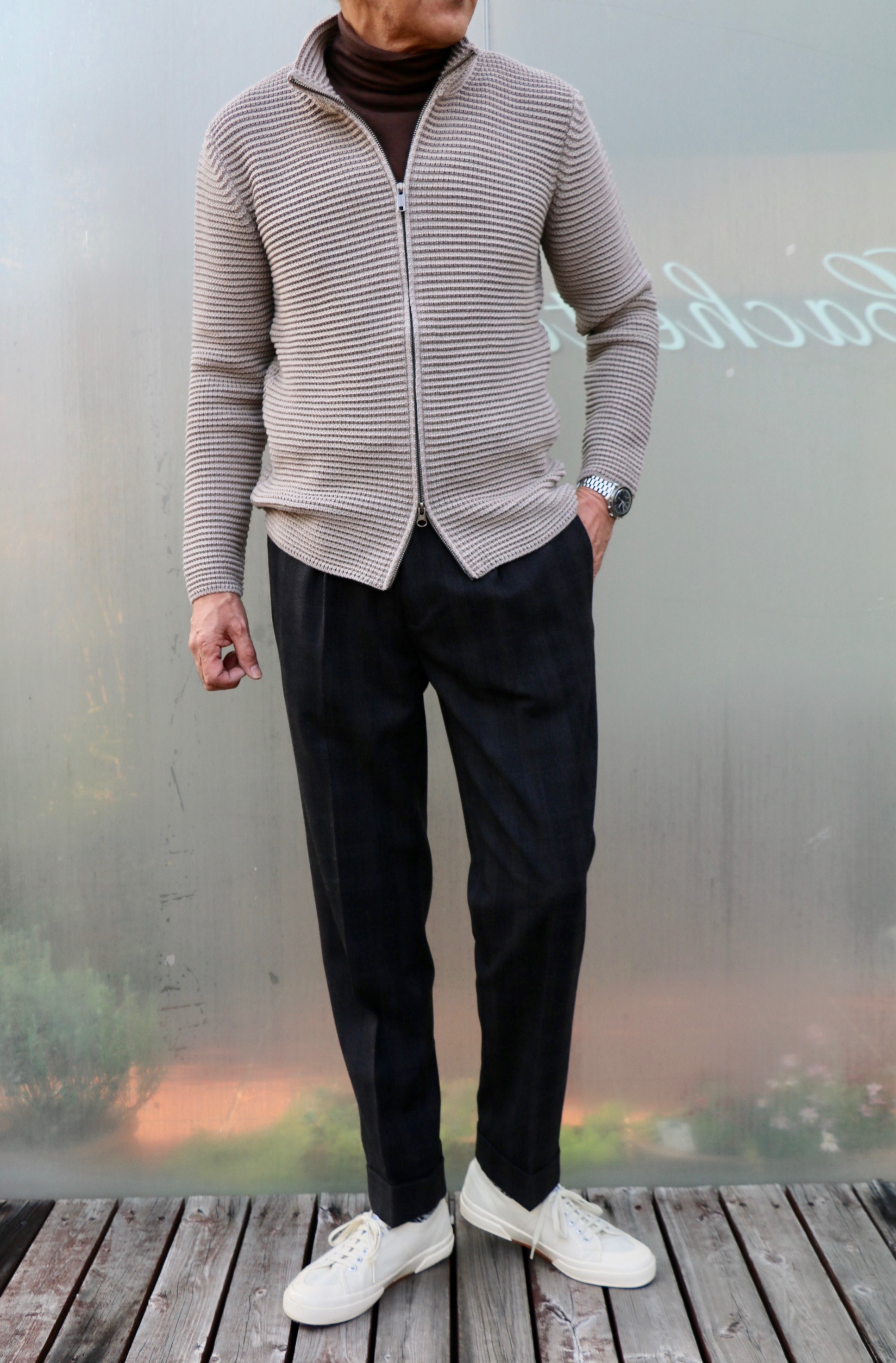 今季のチルコロの秘密兵器となるのが、ベロア素材のジップアップパーカー。日差しを浴びながらの撮影で、ベロア特有の色感・光沢感が、良い感じで際立ちました。同じく光沢のあるPHIL PETTER(フィル・ペター)のレーヨンカットソー、その色目と快適さに惹かれたPT TORINO(ピーティー・トリノ)のActive、快適さを求めるなら外せないANTONIO PIO MELE(アントニオ・ピオ・メーレ)のブラウンスニーカーとコーディネートです。