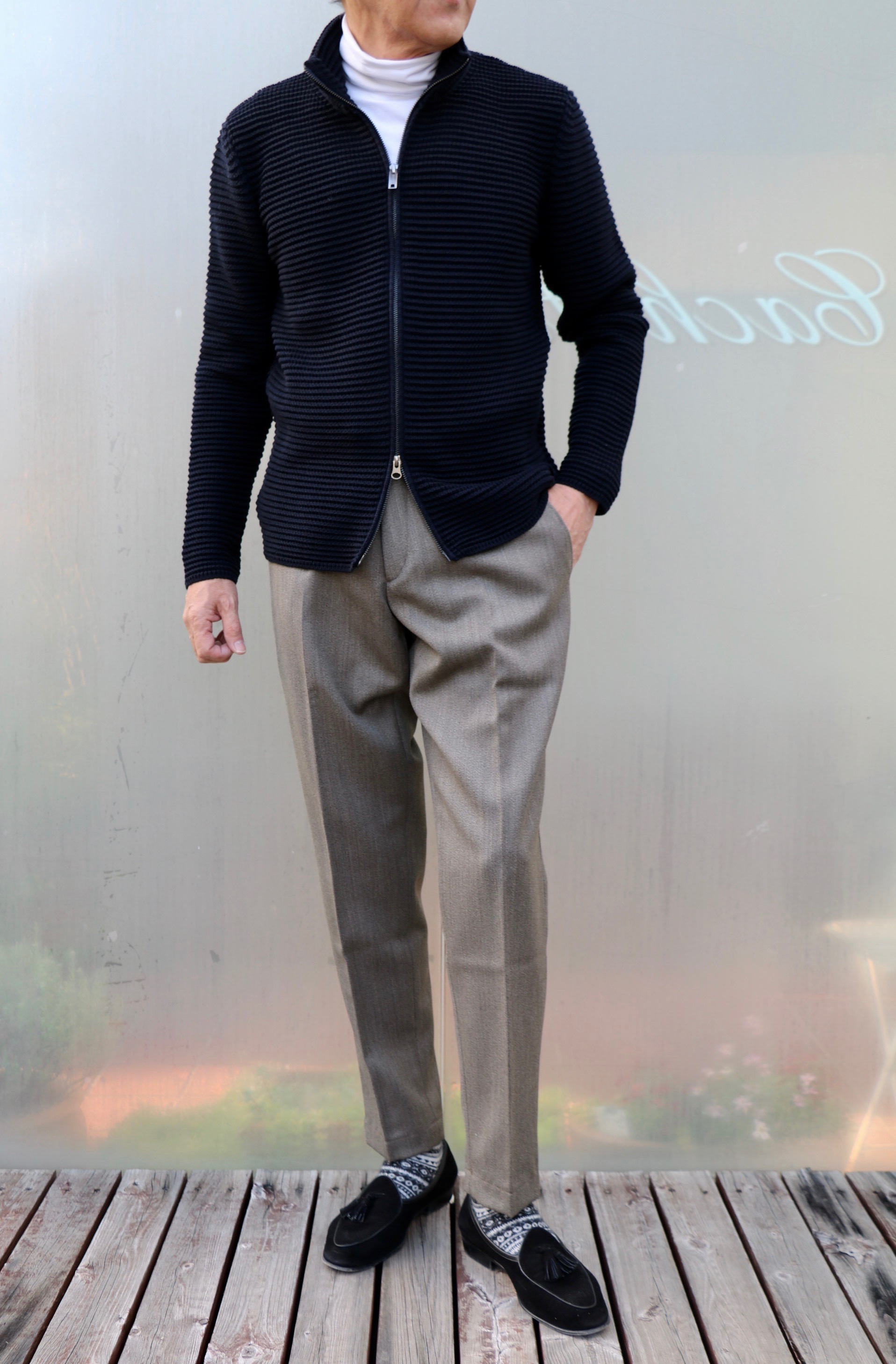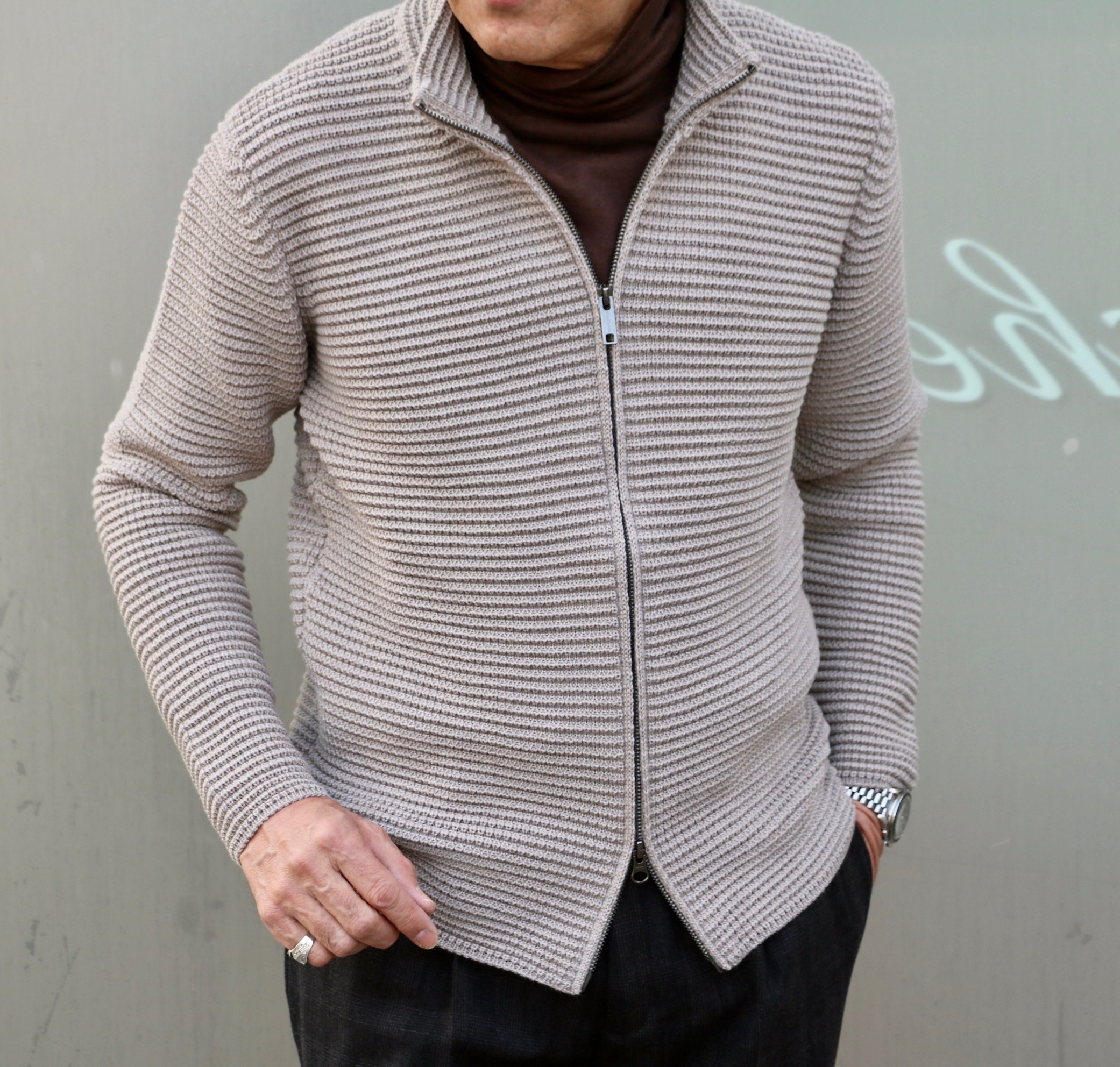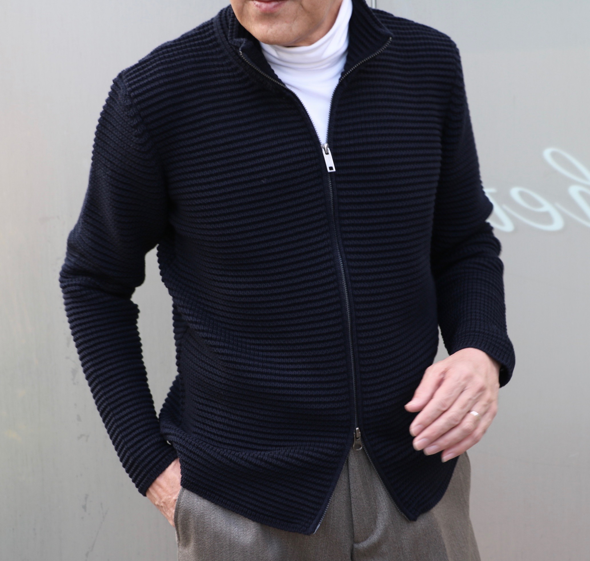 ハイゲージはジョン・スメドレーに任せるとして、ミドルゲージからローゲージの定番ニットといえば、【ZANONE/ザノーネ】。こちらはイタリア・ヴェネチアに本拠を置くスローウェアグループのニットブランドです。タートルネックのことをイタリアではドルチェヴィータと言います。直訳すれば、F.フェリーニ監督の映画のタイトルにもなっている"甘い生活"。「気ままで自由な生活」というイメージでとらえ、スーツやネクタイなどを必要とせず、終始タートルを着ていることが出来る人は、常に自由で暖かい"甘い生活"を送ることができるという羨ましい意味なんですね。ザノーネを代表する「CHIOTO/キョート」と同じ5ゲージのドルチェヴィータは、これからの季節大活躍です。先ほど書かせていただいたように5ゲージ以下はローゲージなんですが、なぜかミドルゲージと記しております。毛羽のない、目の詰まった編み地が特徴のニットになります。タイトな作りですので、通常のサイズよりワンサイズ上げた方が良いかもしれません。着用写真のサイズは全て48を着ております。