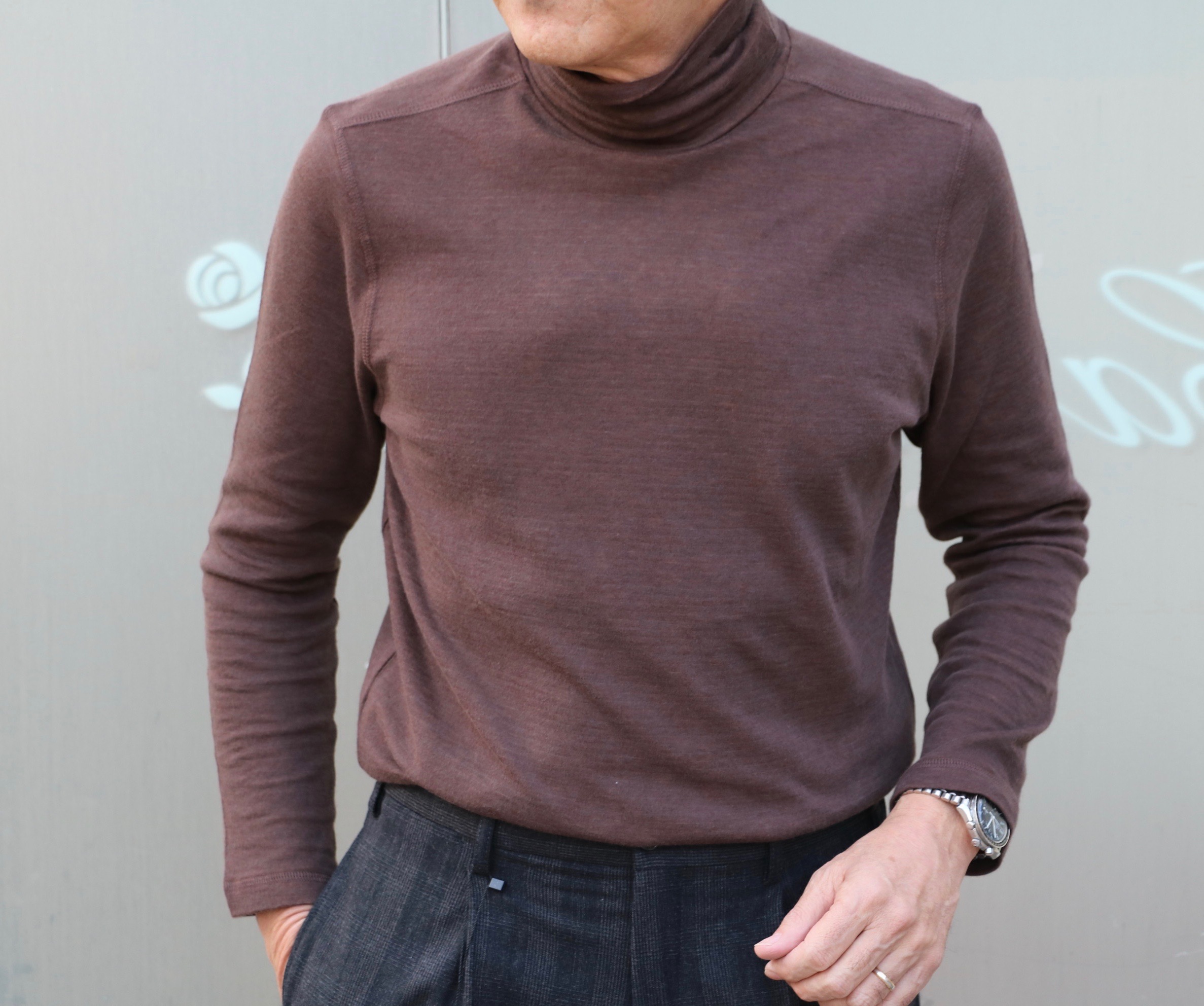 こちらも使ってみましょう。同じく【PHIL PETTER/フィル ぺター】のビスコース ストレッチタートルネックです。ただ、着用サイズのSが完売のため、写真はご案内の際のものです。